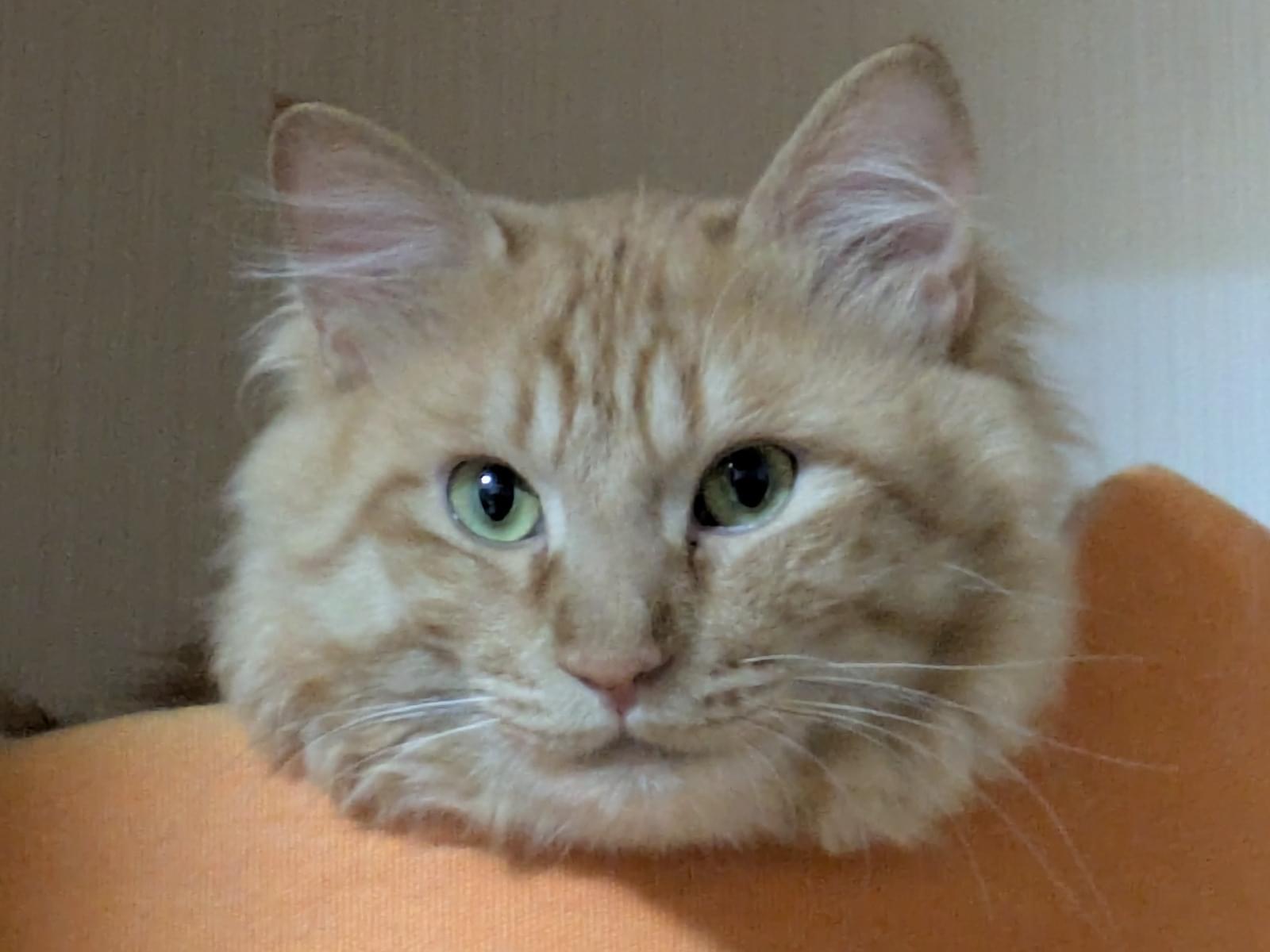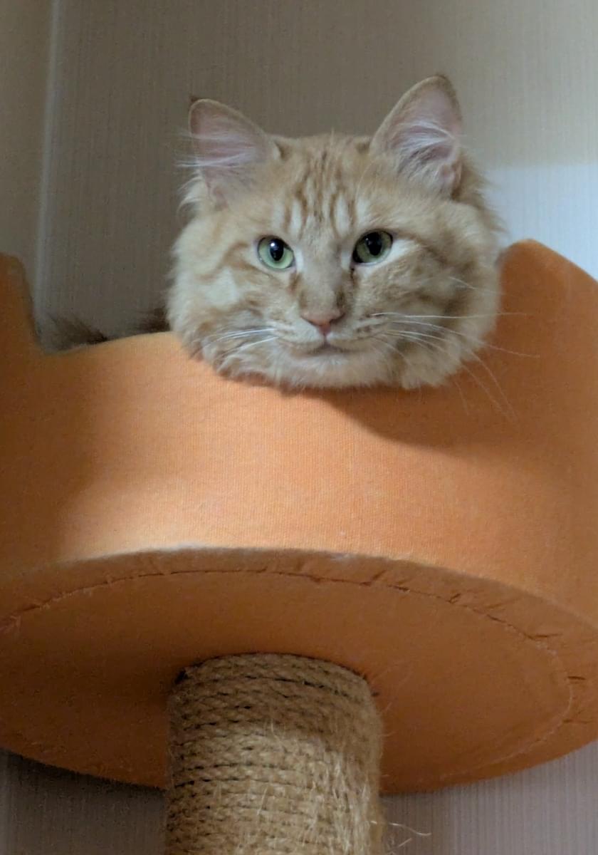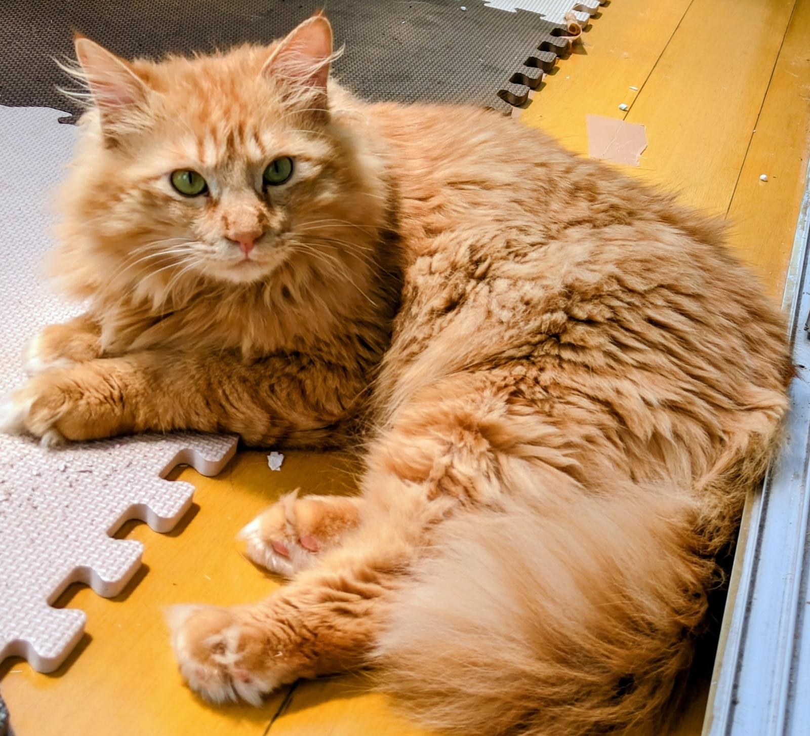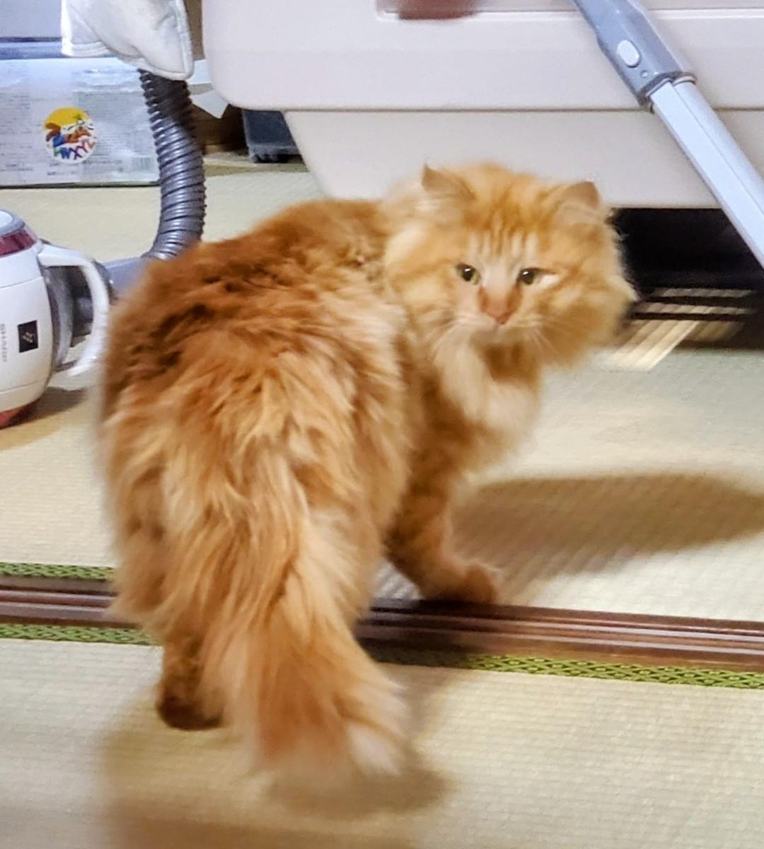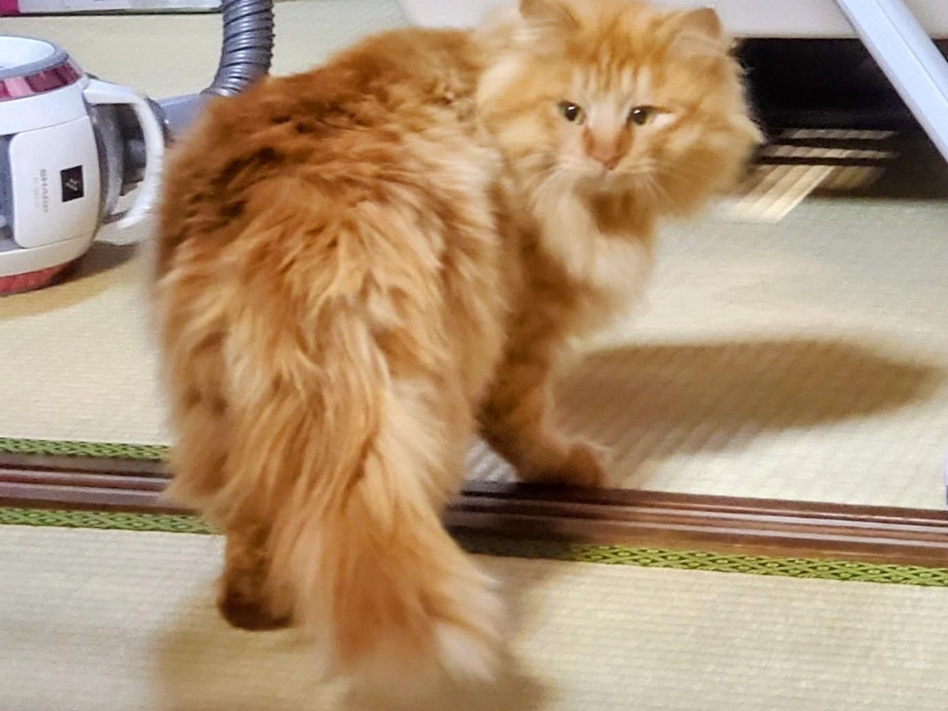 【特徴】明るい茶色でとにかく野良猫にはなかなかいない、長毛種の大型猫、尻尾も太いです。8ヶ月前に保護団体から引き取ったからか、警戒心が強く、そばに寄るとすぐ逃げます。チュールで釣れるか…カリカリの袋の音で釣れるか…オモチャには全く興味がない子でした。