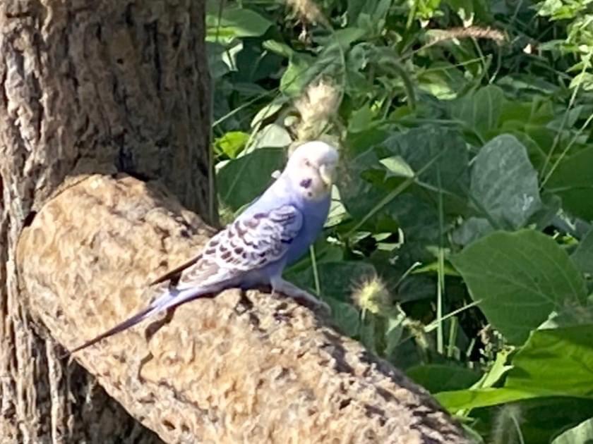 槻木にある葛岡山公園内にて、紫と青みがかった色をしたセキセイインコを目撃しました。写真を撮ろうと近づいても逃げず、人慣れしているようでしたので、どなたか飼われていたインコちゃんかと思います。