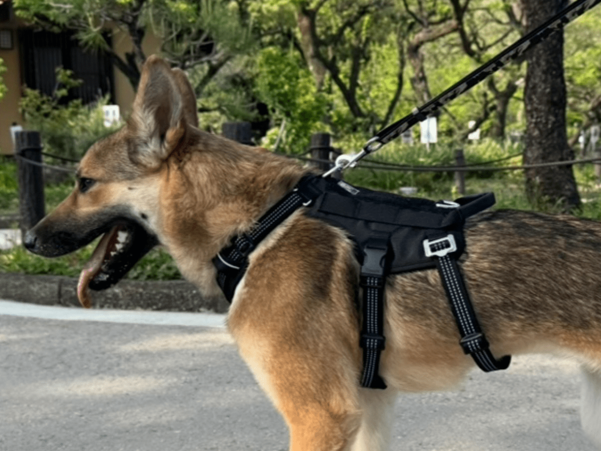 ハーネス付きの鼻黒の中型犬
