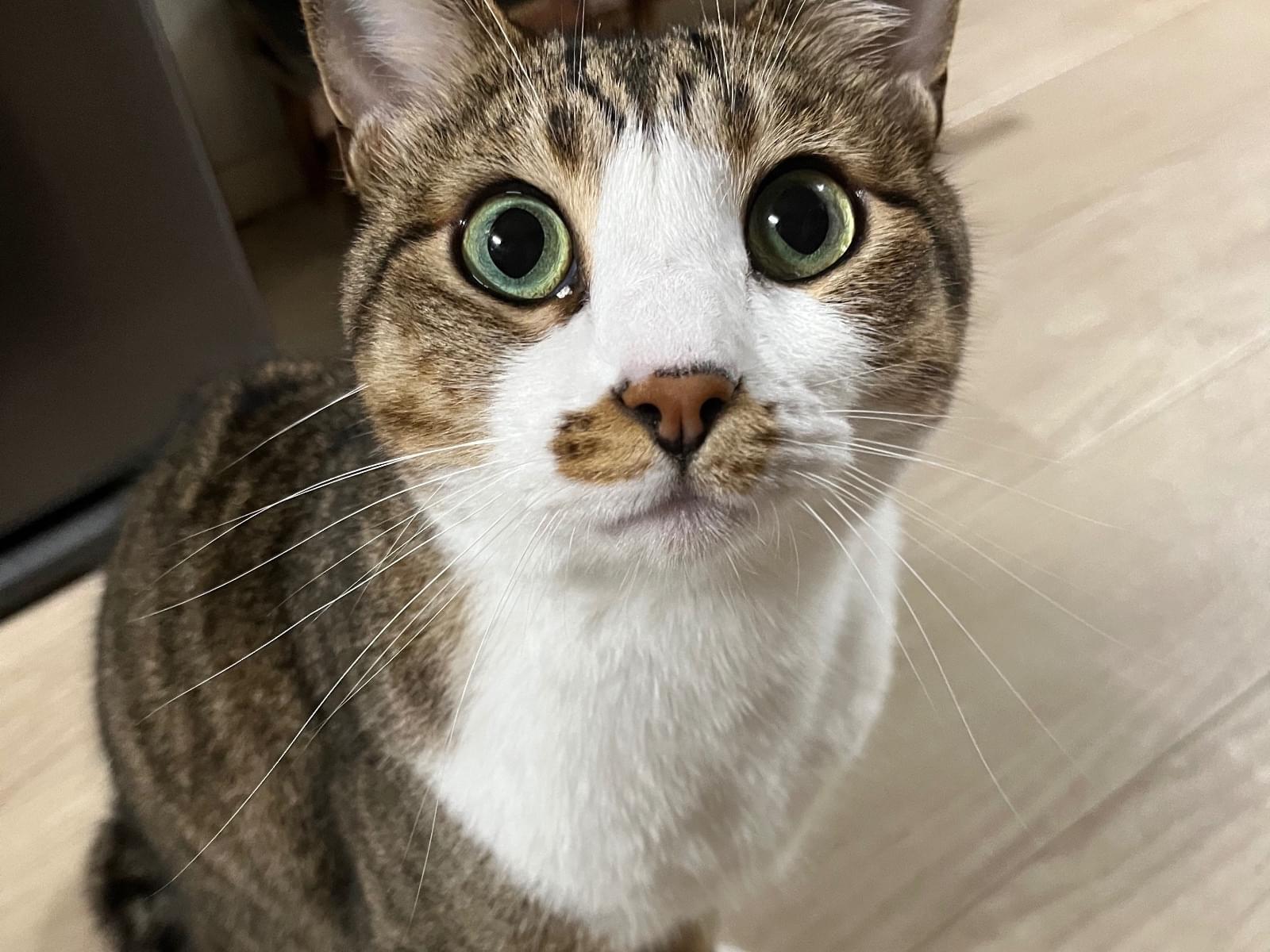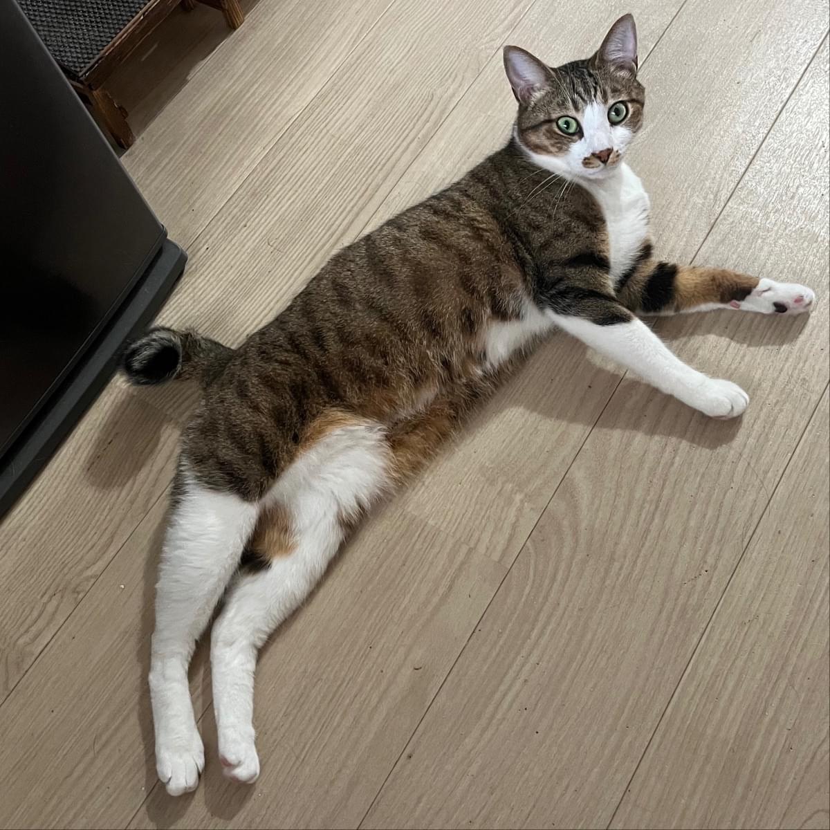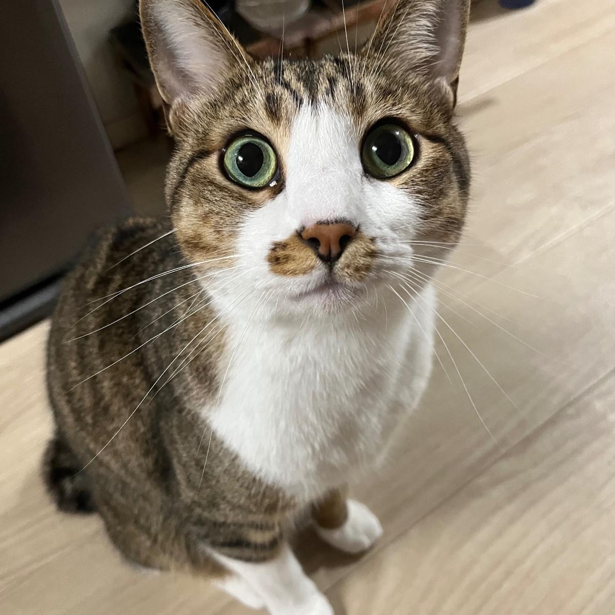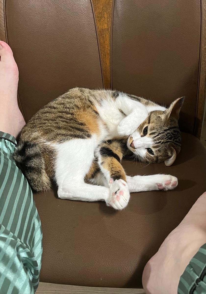 【特徴】去勢済み。黒と茶色の縞模様で口お腹側が白です。四足先が靴下を履いたように白いです。鼻先の黒い模様が途切れてます。尻尾は短く鍵しっぽです。首には首輪ハゲが残っています。