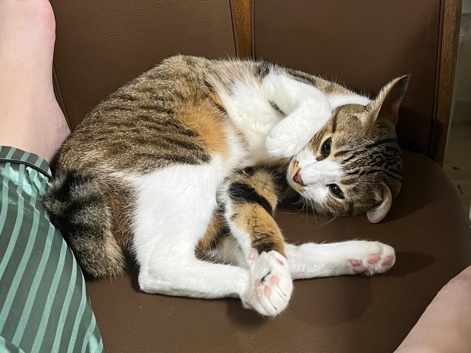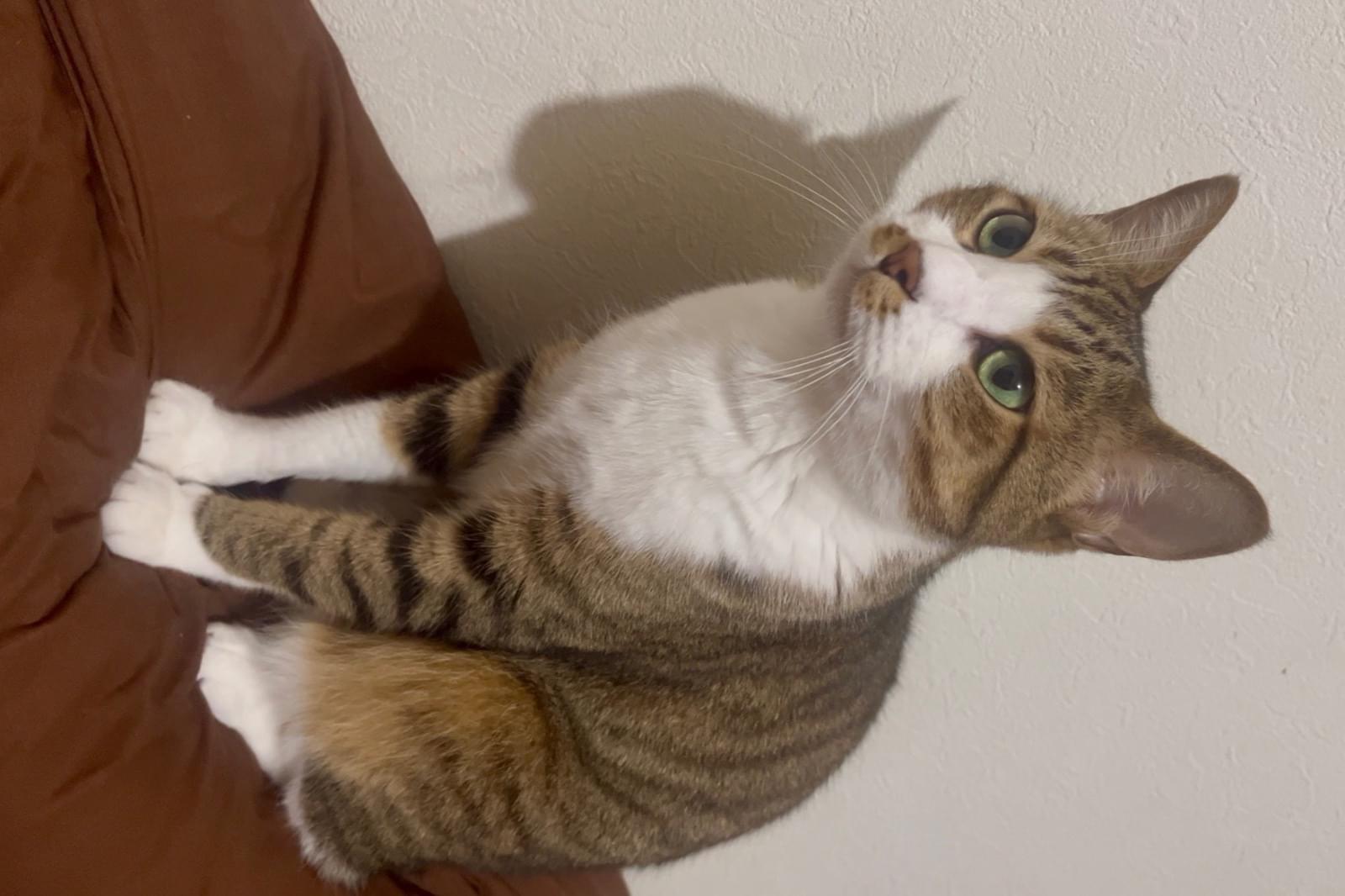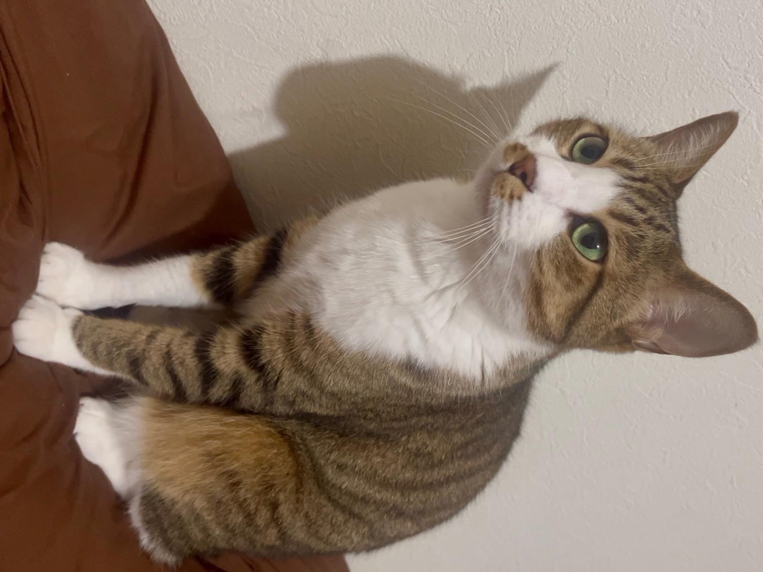 【特徴】去勢済み。黒と茶色の縞模様で口お腹側が白です。四足先が靴下を履いたように白いです。鼻先の黒い模様が途切れてます。尻尾は短く鍵しっぽです。首には首輪ハゲが残っています。