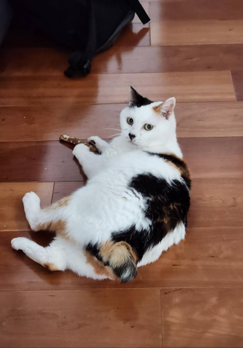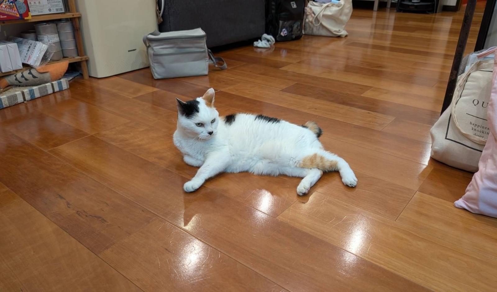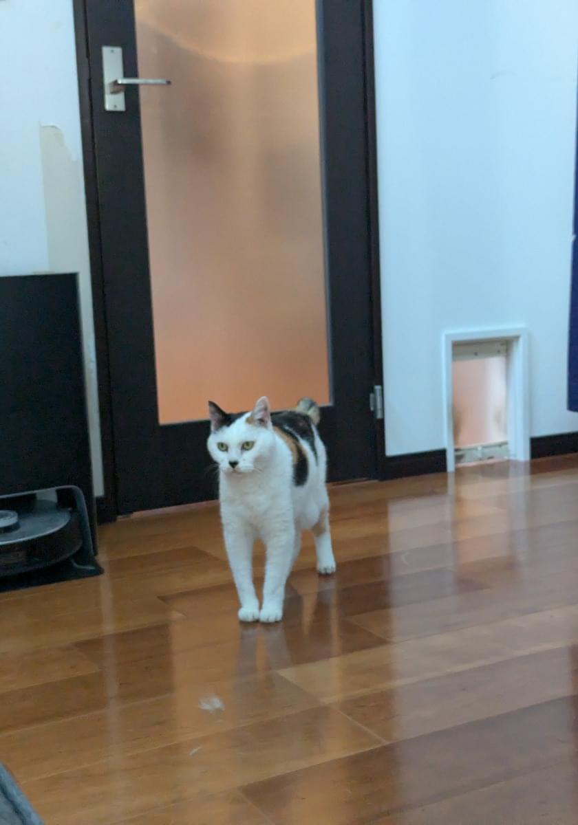 しっぽが短く足が細長いです。後ろ足の一部に茶トラの模様があり、鼻の右横に怪我抜け落ちたような穴があります。鳴き声は低めです。