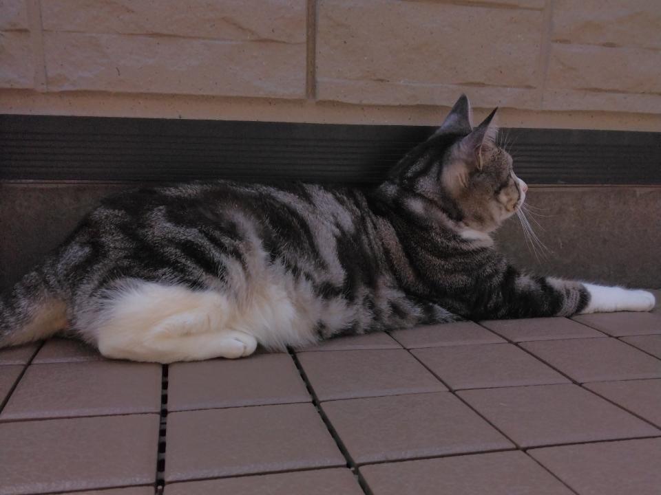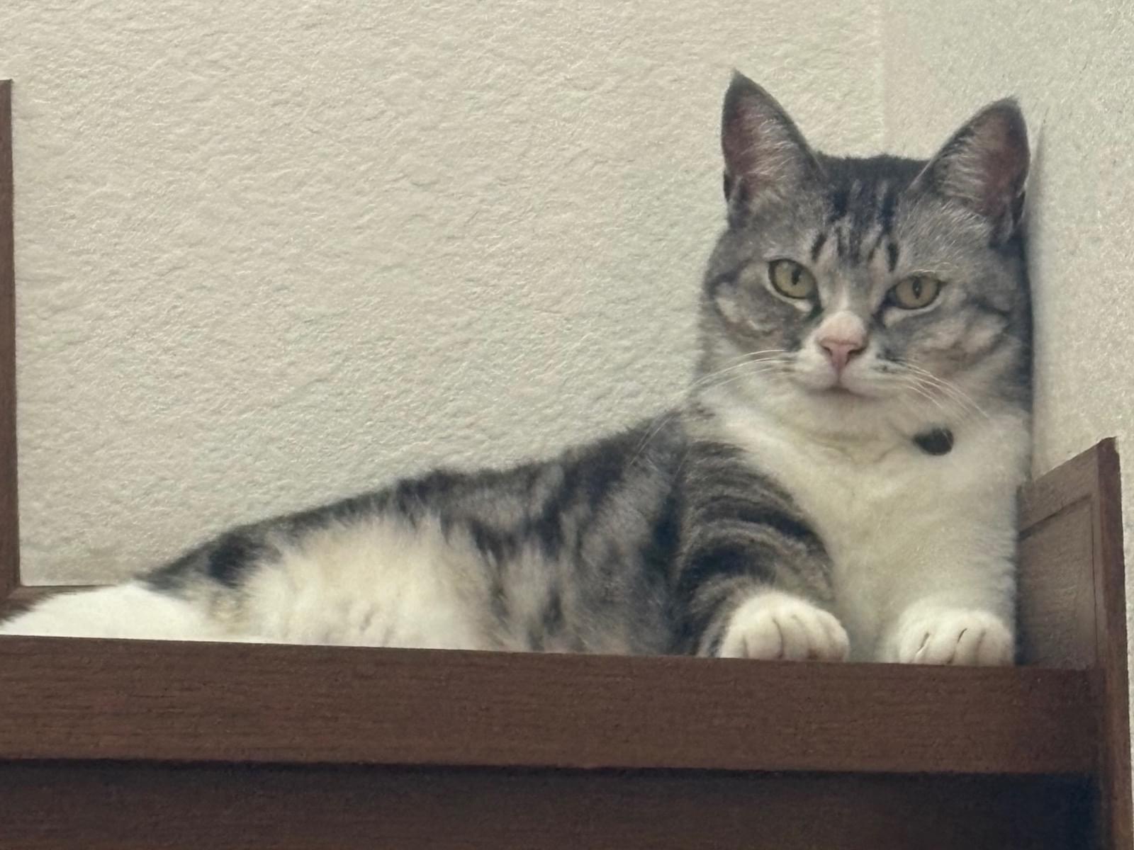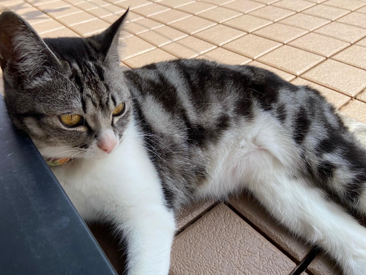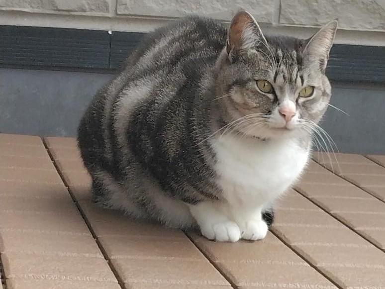 脇腹に黒い渦巻き模様のあるサバ白猫を探しています