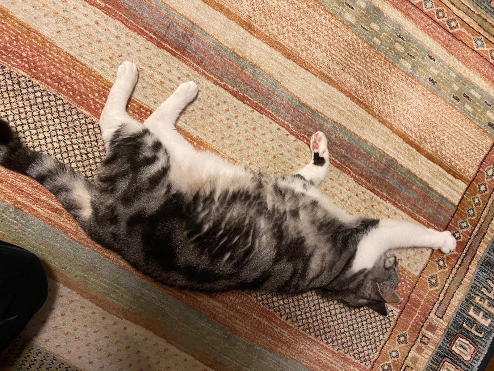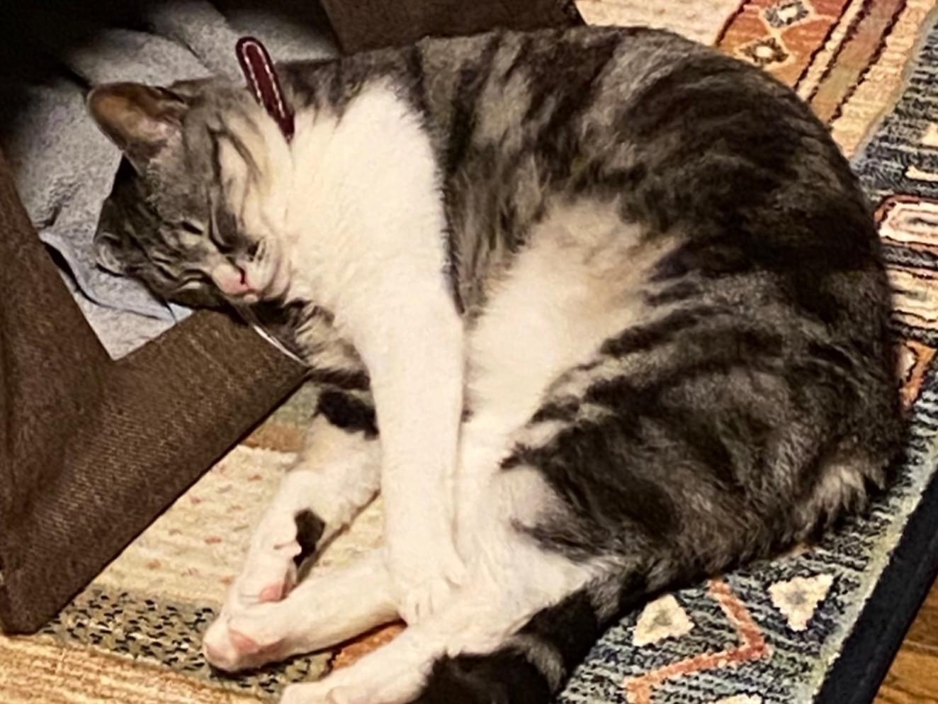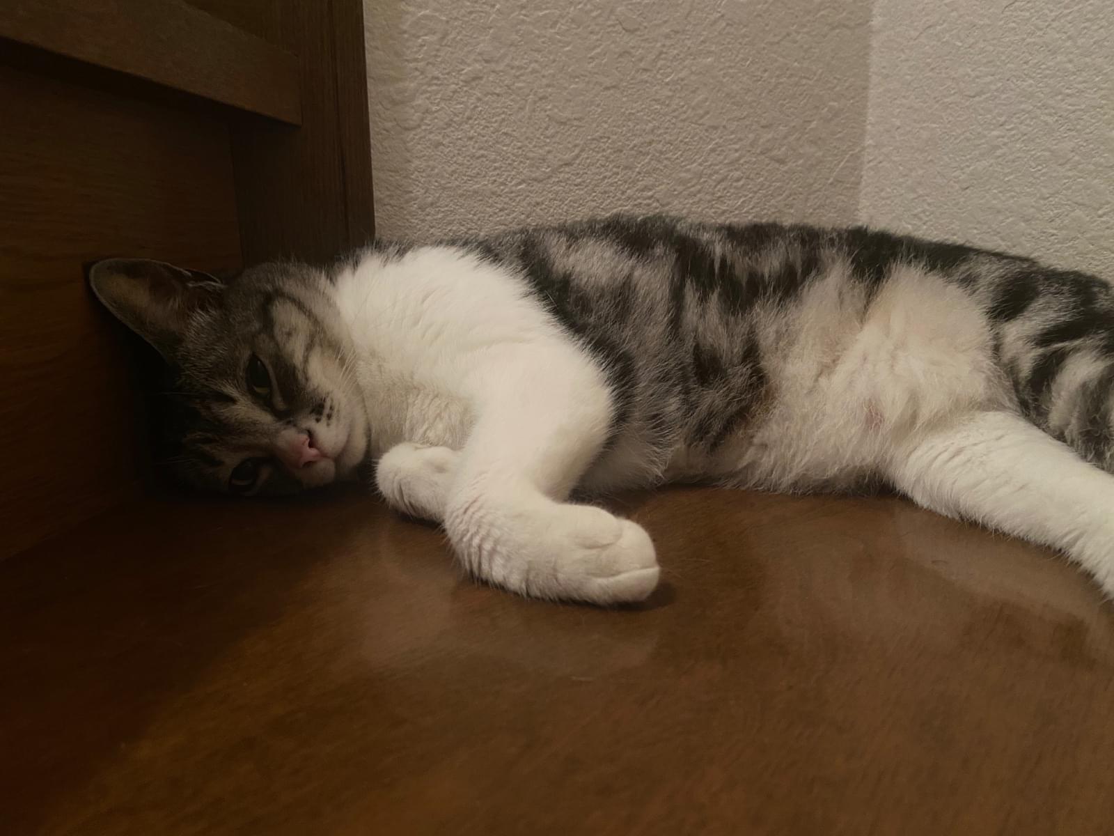 脇腹に黒い渦巻き模様のあるサバ白猫を探しています