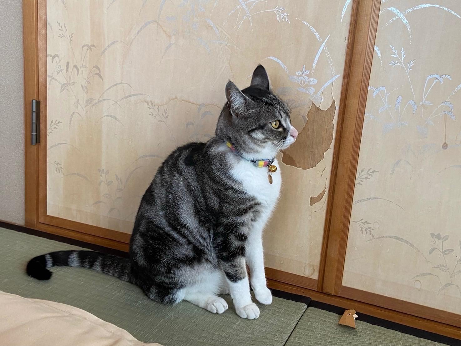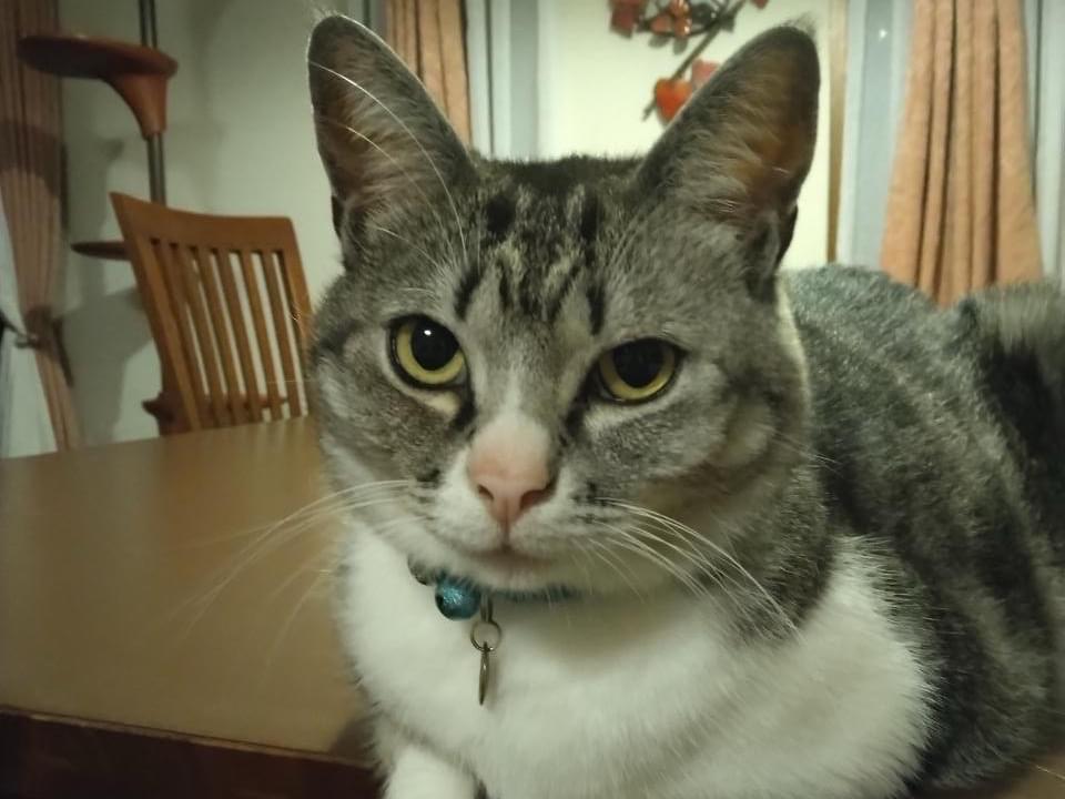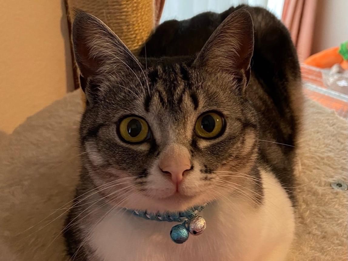 水色の首輪と、丸いネームプレート(外れているかもしれません)を付けています。尻尾は長くシマシマ模様で、足とお腹は白色です。性格は警戒心は強めです。避妊済み、体重約4キロです。
