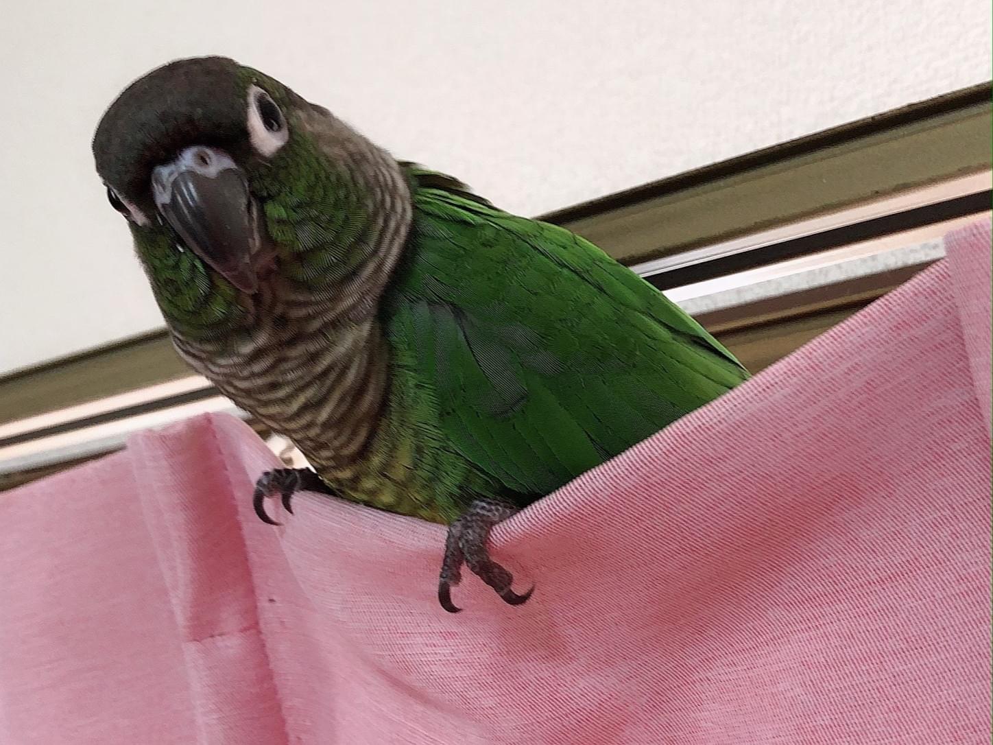 全体が緑色、尾羽が赤系、羽の下の方が青系です。