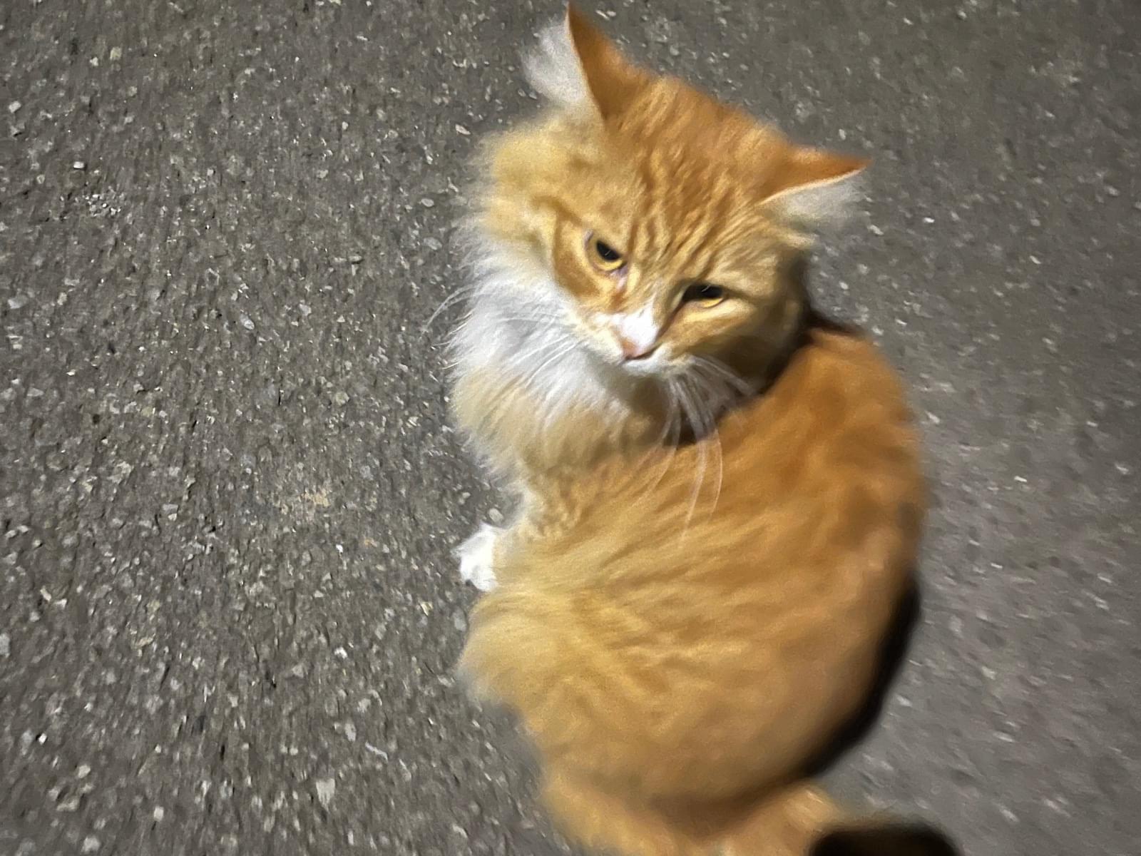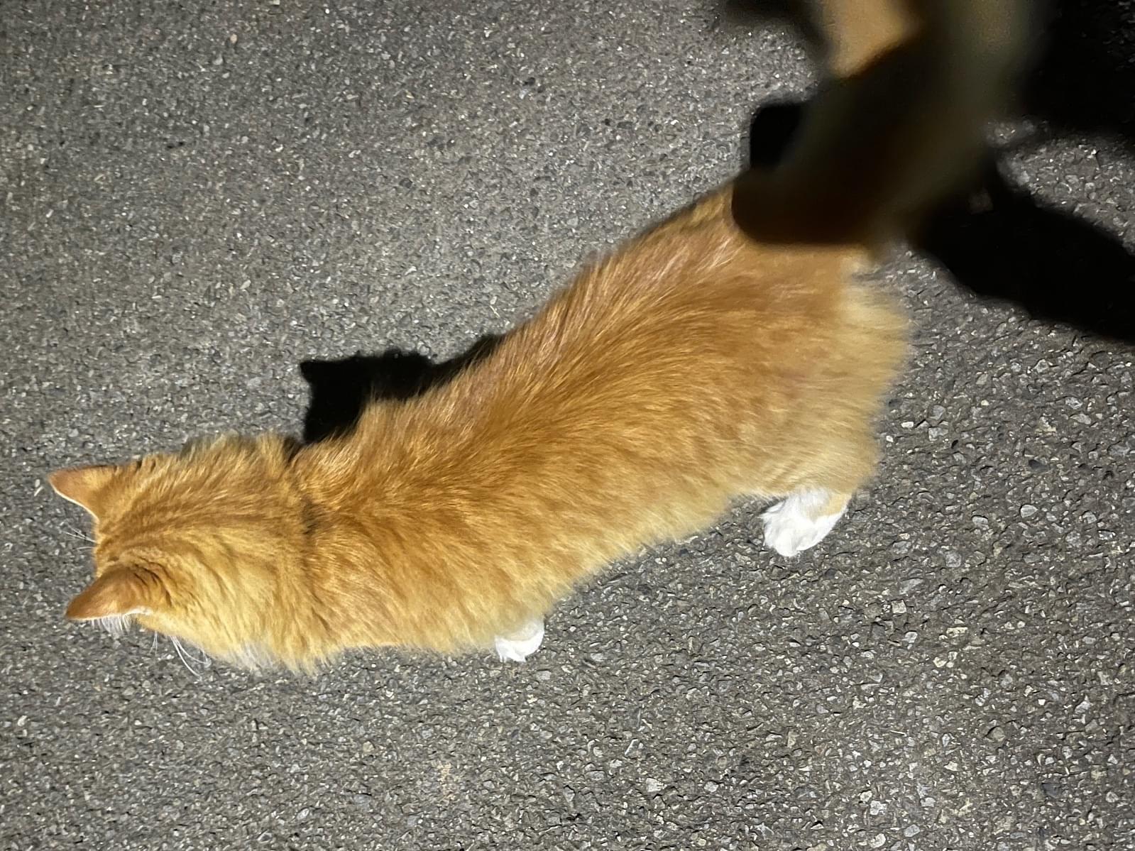 しっぽが長く耳カット無し、黒か紺のチェック柄のリボンのついた首輪をしていました。匂いも野良っぽくなく、飼われている猫ちゃんかなと思いました。ちょっと遠くまでウォーキングしていた途中だったので保護できず…
