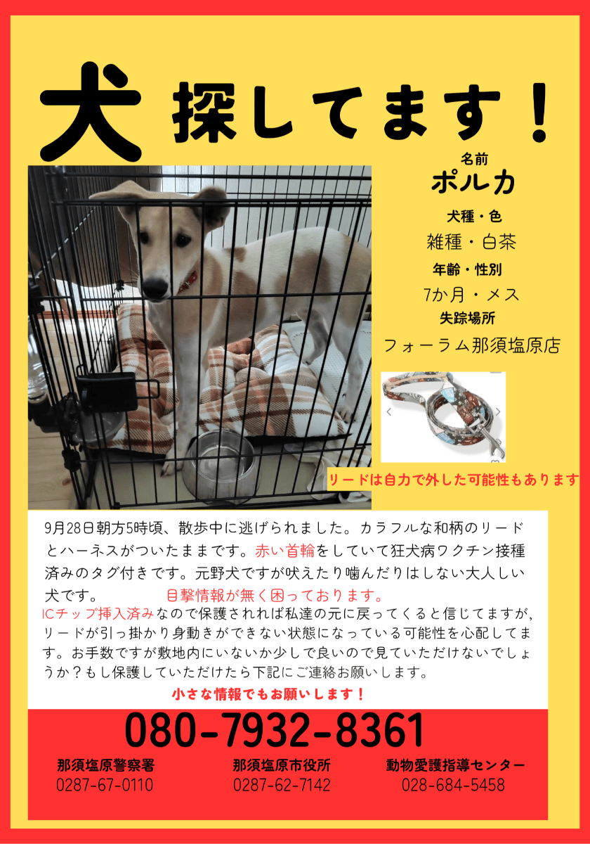 フォーラム那須塩原付近で散歩中に逃げられてしまいました。