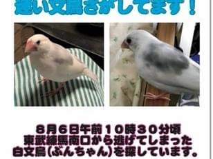 ホーム迷子鳥東京都白文鳥を探しています白文鳥を探しています管理編集するポスター掲載終了最終更新日時:2020/08/07 06:27写真情報用件迷子名前ブン性別オス年齢雛場所東京都 板橋区 東武練馬駅発生日時2020年8月6日(木)飼い主-イシバシ説明・白文鳥 ・背中が少しグレーがかっている連絡先URLtwitter.com/N5LALiVe1TYBcjG掲示板情報交換のための掲示板です。ユーザーからの情報提供、オーナーからの連絡などにご利用下さいませ。まだコメントはありません。トピックを作成する