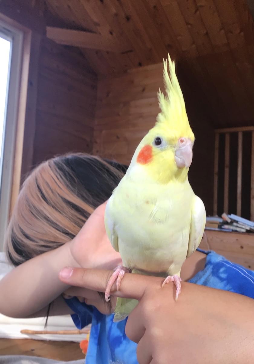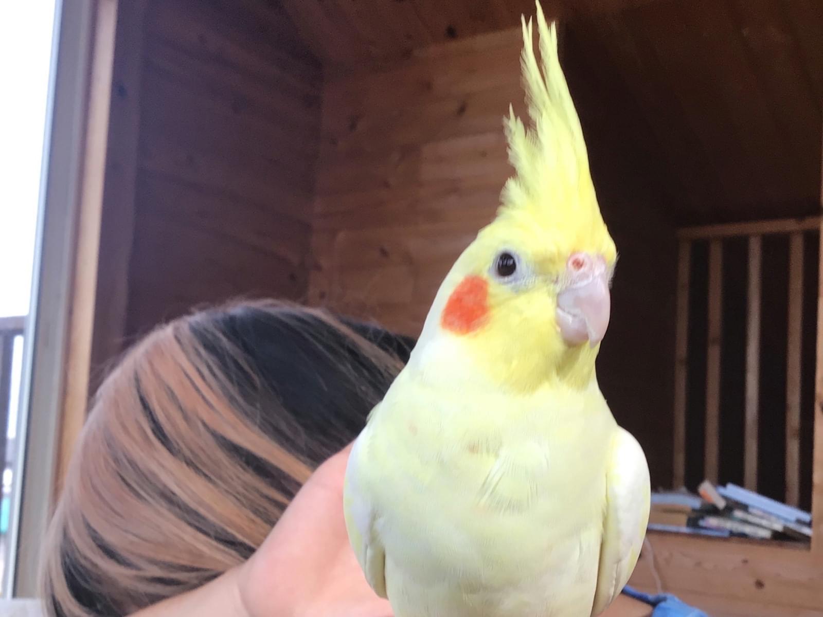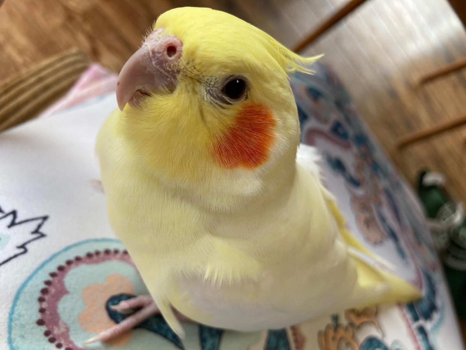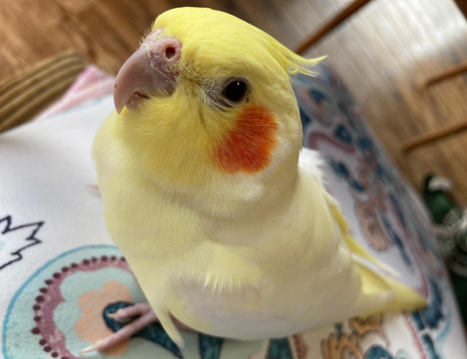 体は黄色、ほっぺがオレンジのオカメインコを探しています。