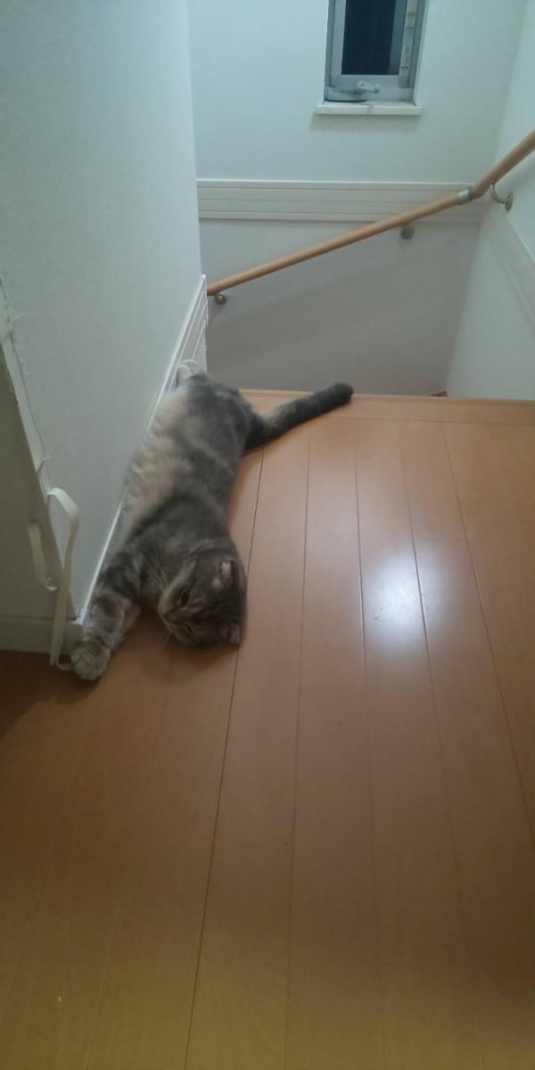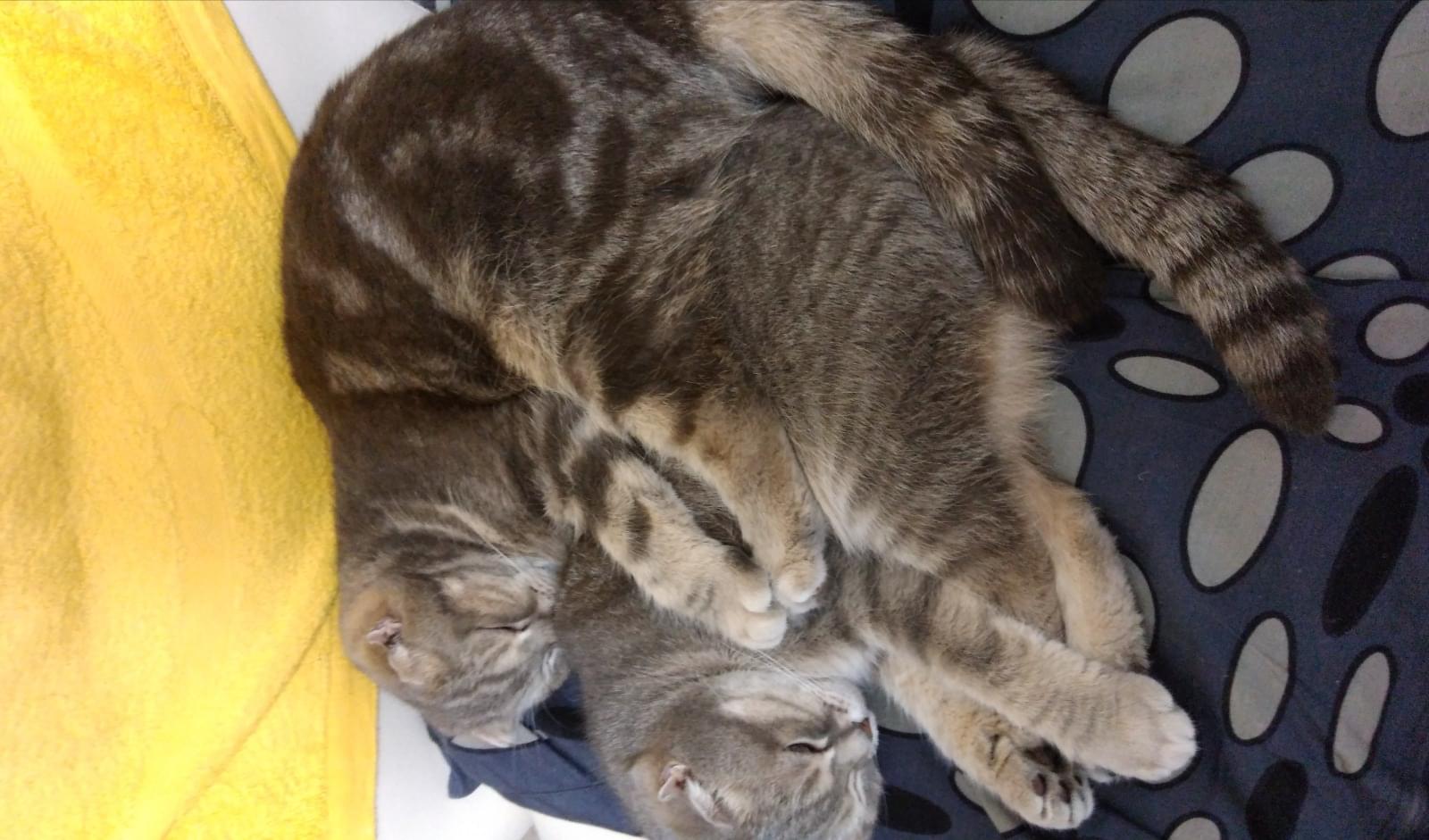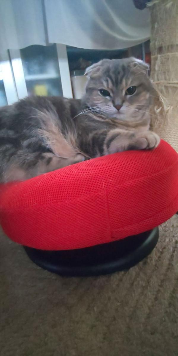 耳垂れの濃グレーのトラ柄です。お腹周辺、手足と鼻周りは白いです。目は黄色く、見た目では分かりませんが、尻尾の先が折れています。