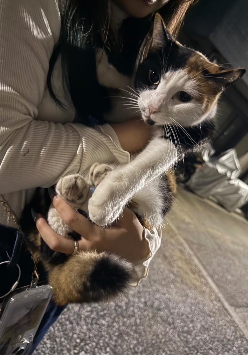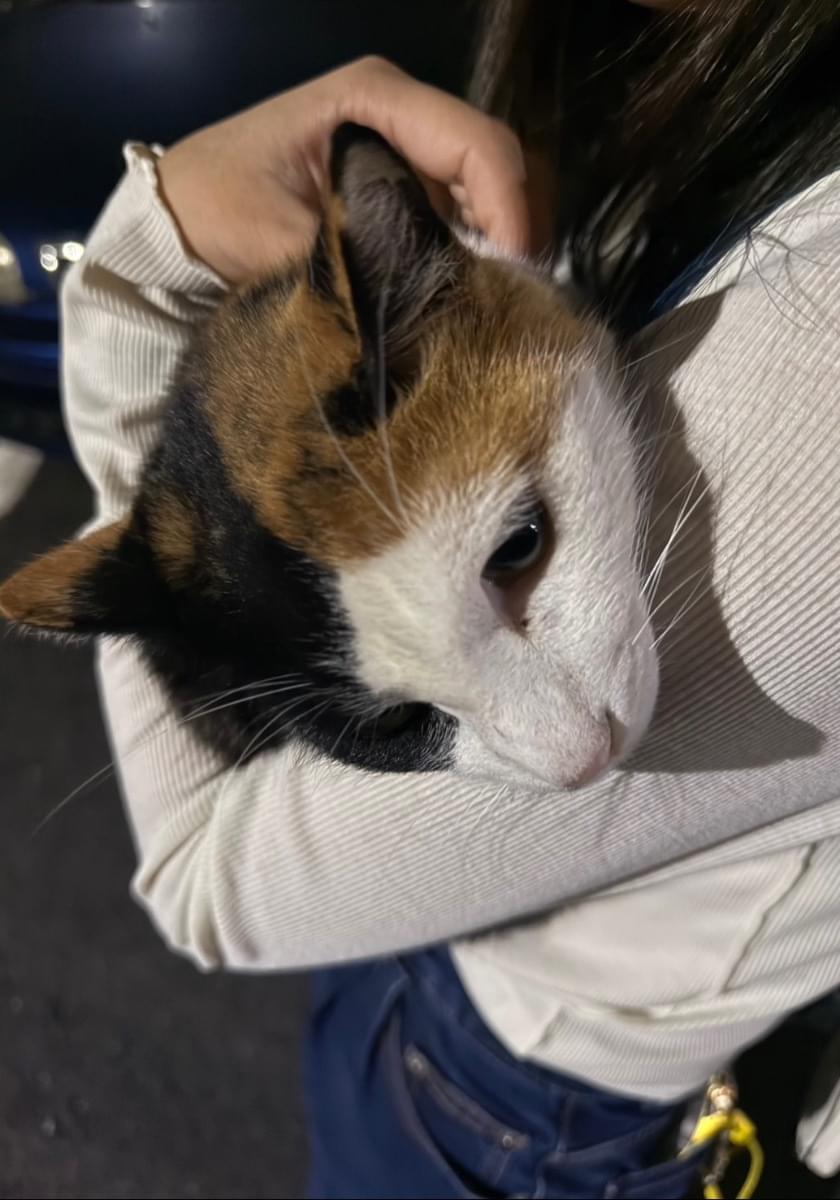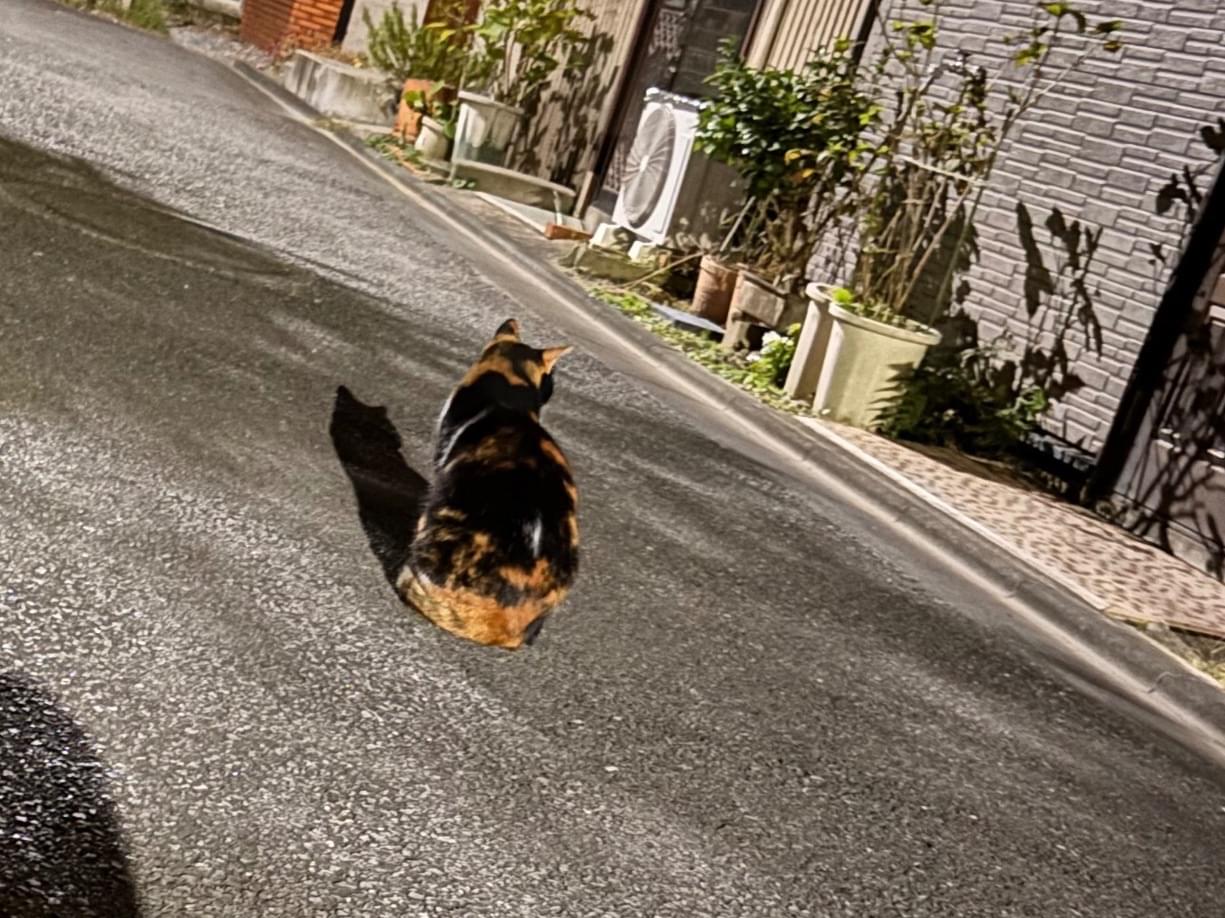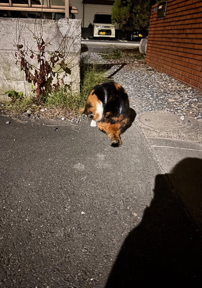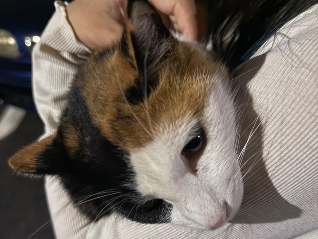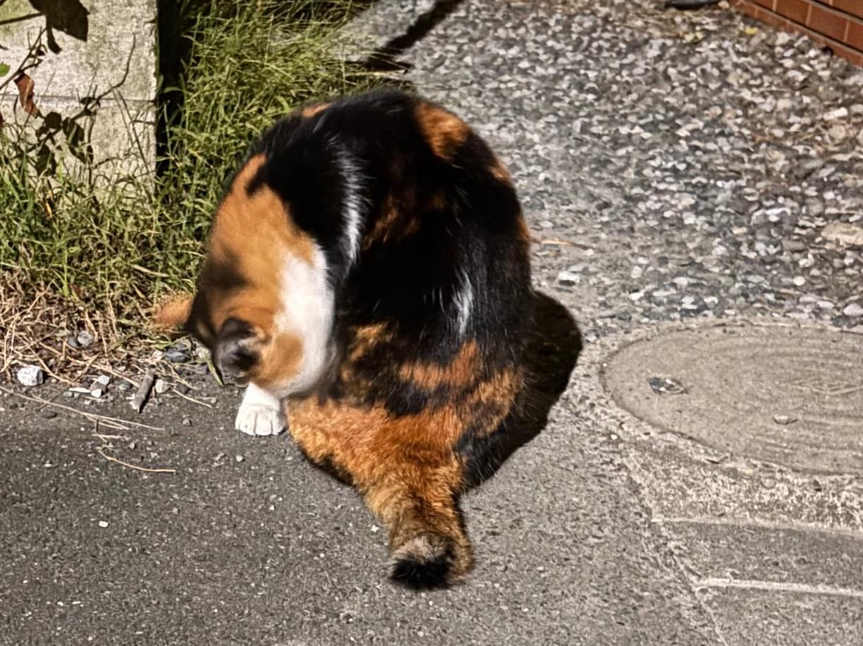 三毛猫で毛並みがとても綺麗であまり痩せてもいなかったので放し飼いかと思って3〜4日前に見た時は少し撫でてバイバイしました。