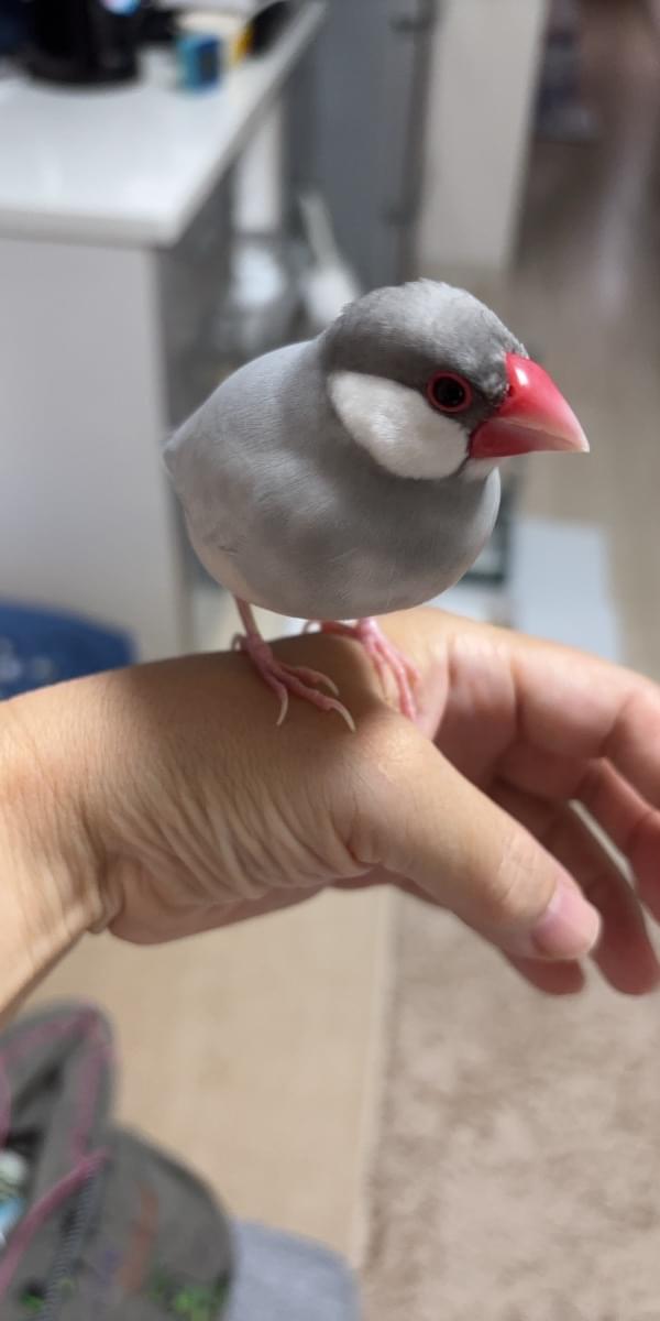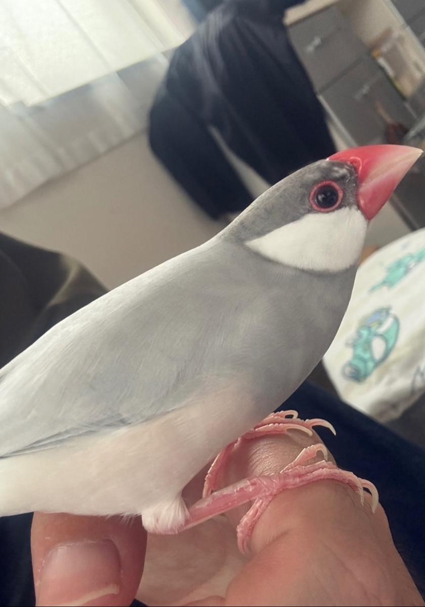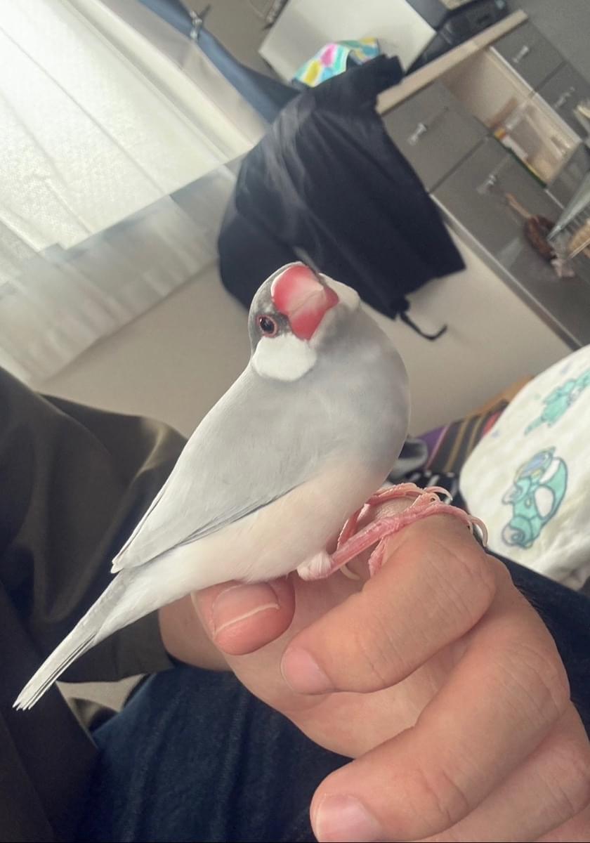 シルバー文鳥で名前はぴいちゃん。呼ぶと飛んで来ます。とても人懐っこいですが、少し臆病でビビりな面もあります。