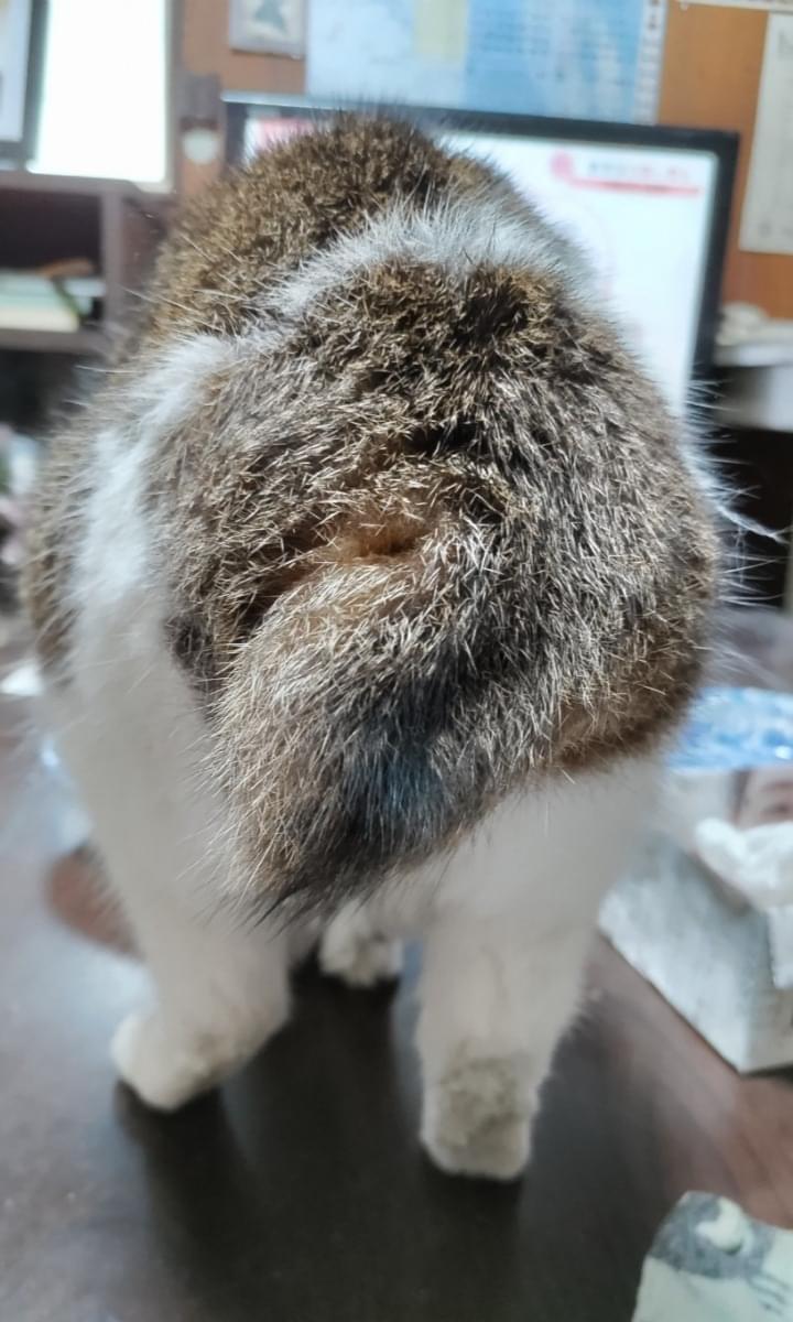 小柄でしっぽはポンポンのように短く、鼻に茶色い模様、