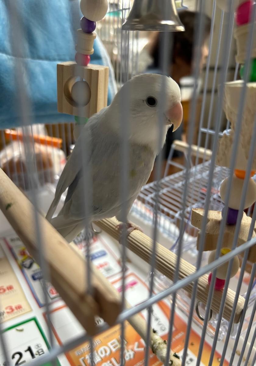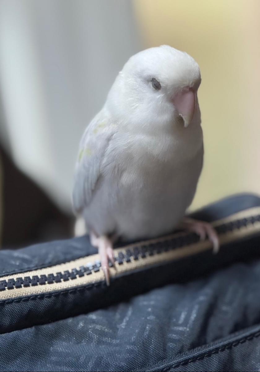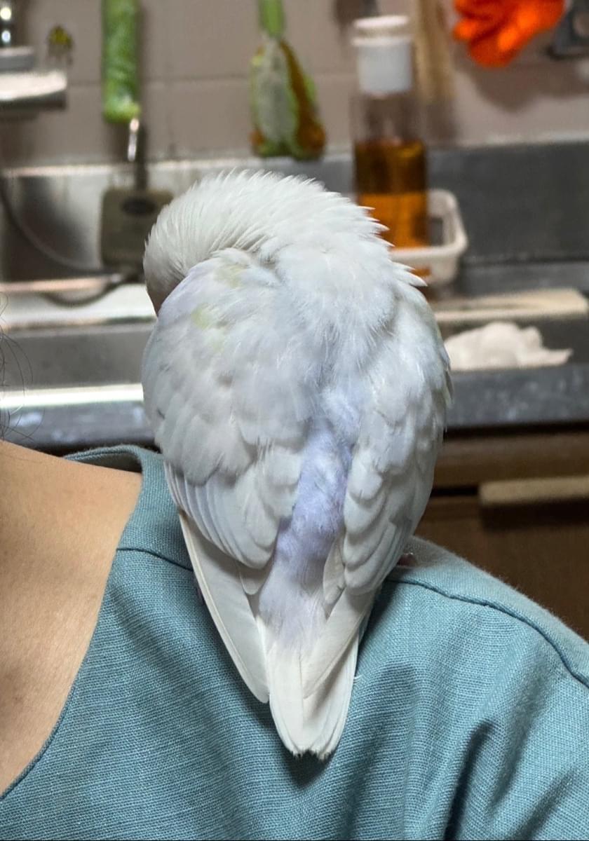 コザクラインコの青みがかったホワイトで所々黄色も混じってます。ベランダから脱走してしまいました。切った羽が伸びて少し飛べるようになったばかりです。ミッキーマウスマーチを歌うと首を振ってくれます。