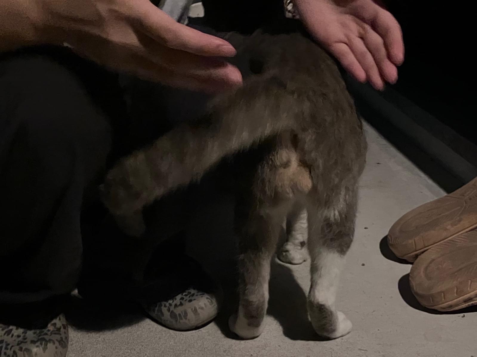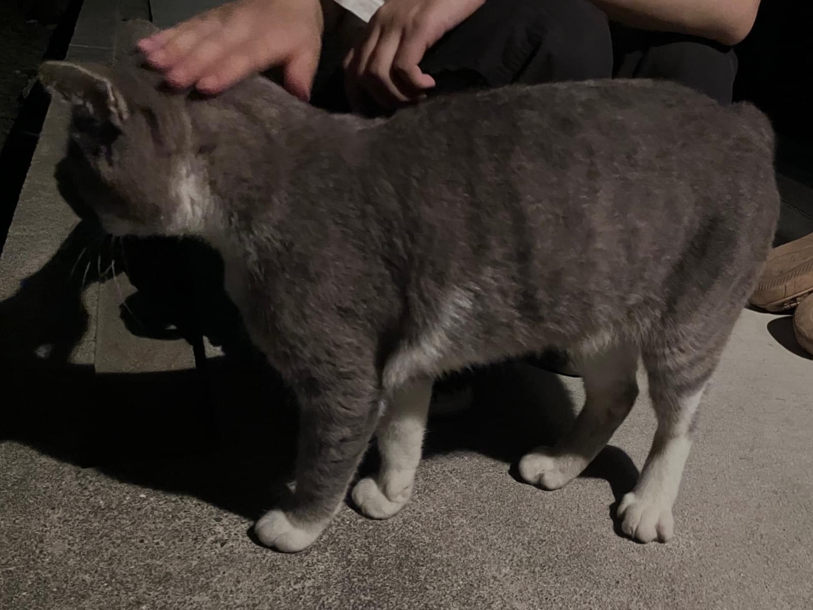明らかに人慣れしてるので、飼い猫だと思います。男の子です。夜の外で会ったので、確かか分からないですが、グレーの毛色で尻尾は縞々で白い靴下はいてます。こちらの言葉が理解してる気がします。よく喋ります。