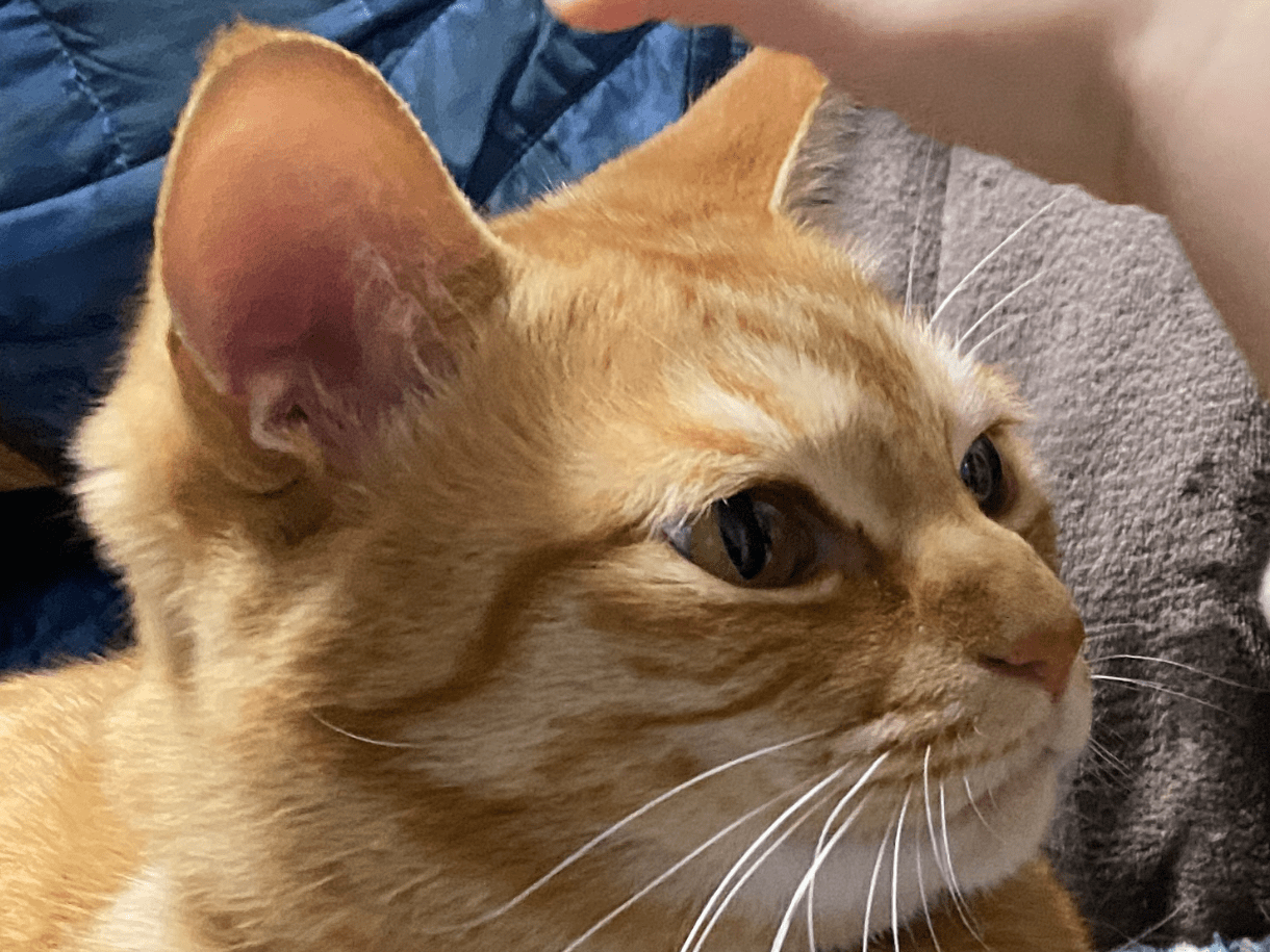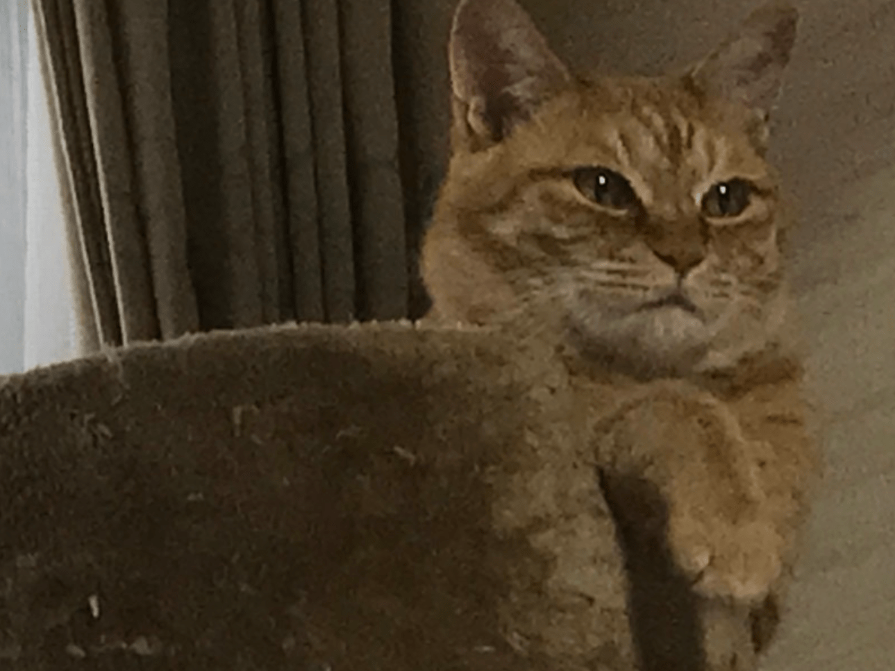 茶トラ猫(からだ全体が茶色で口のまわりが少し白い、尻尾が長くて先が縞々)