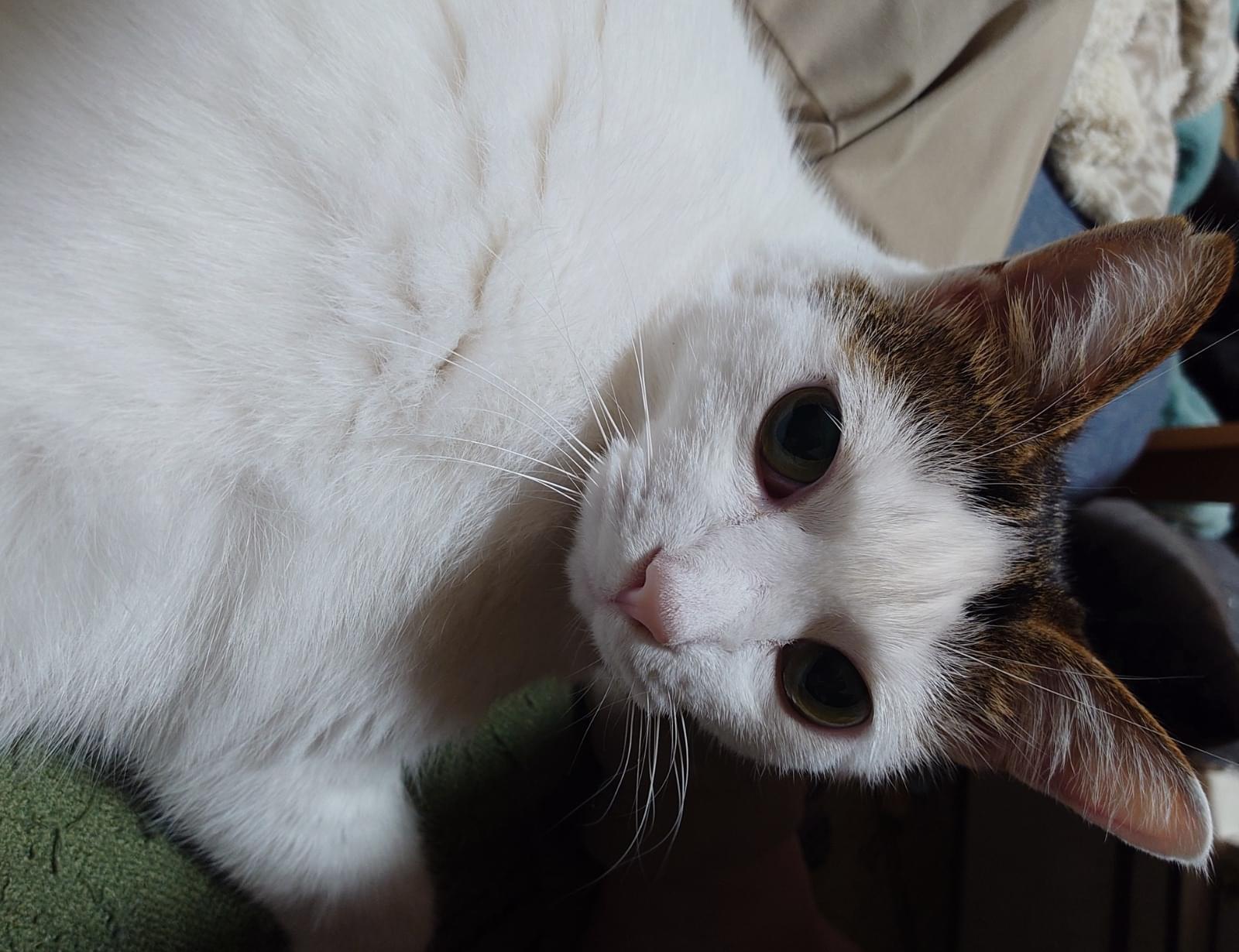 少しぽっちゃりしており右耳の先が少し欠けています。ビビリで人見知りです。