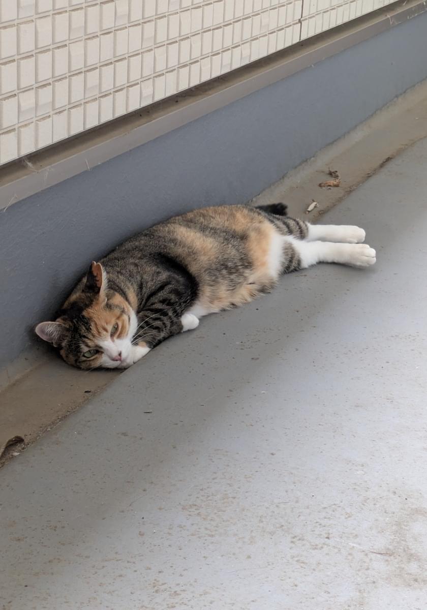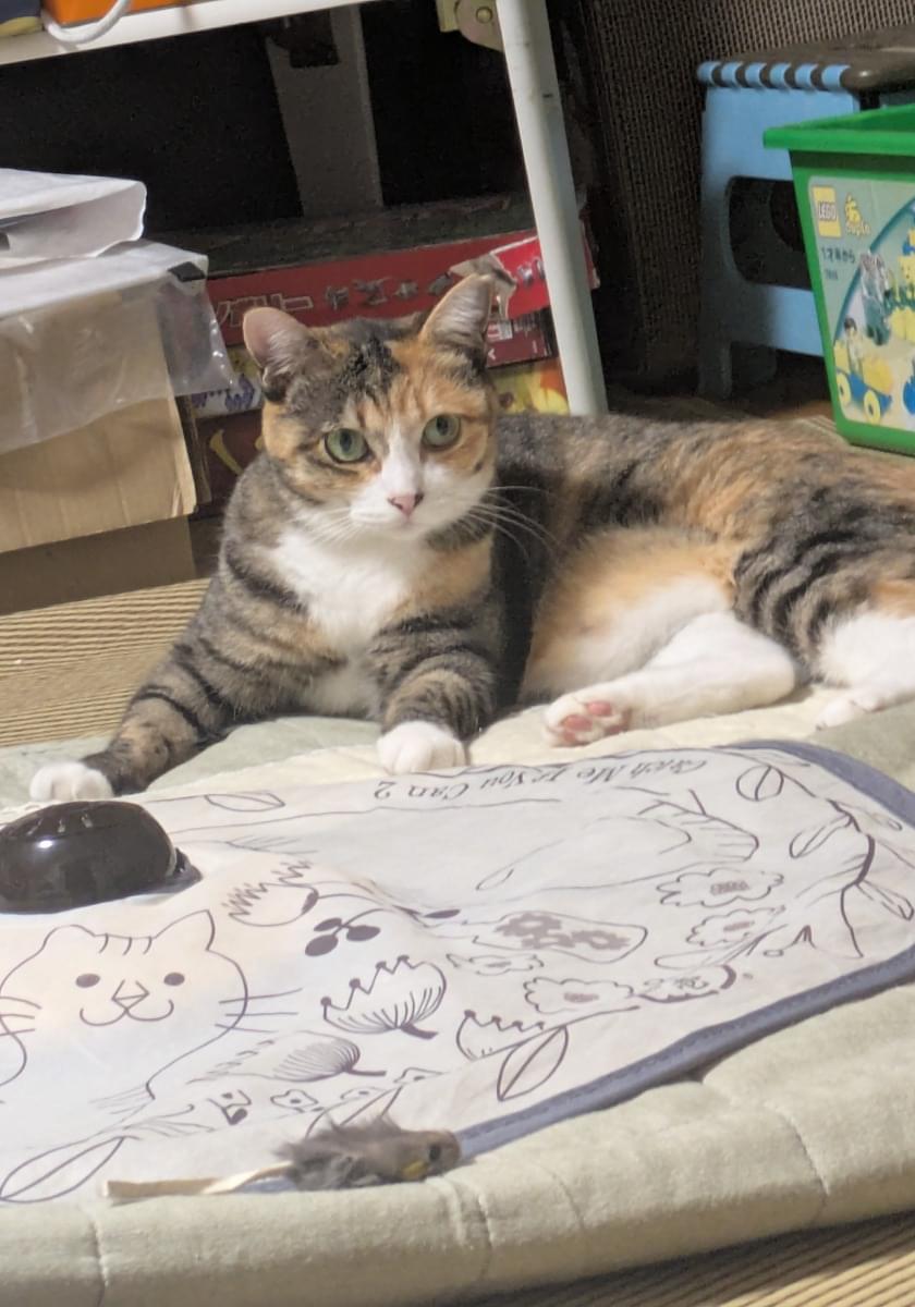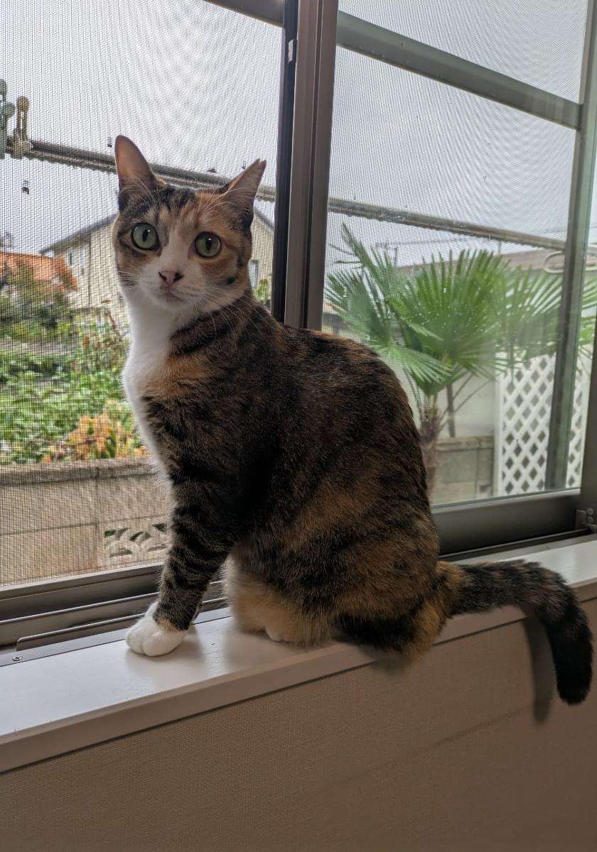 雌猫、左桜耳カット。オレンジ多めの三毛トラです。