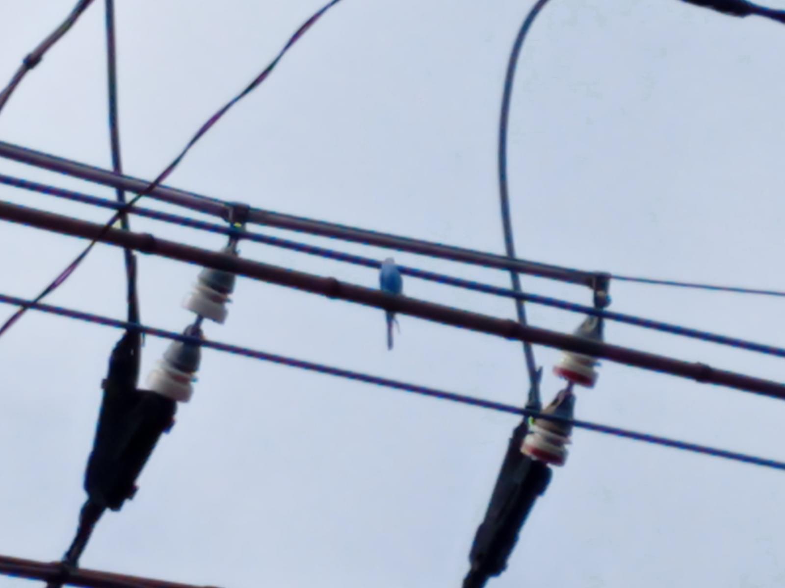 青いほうは高い電線の上に止まって鳴いているのを見つけて声をかけましたが戻って来る様子なく、ちょっと目を離した隙にまた何処かに飛んでいってしまいました…。