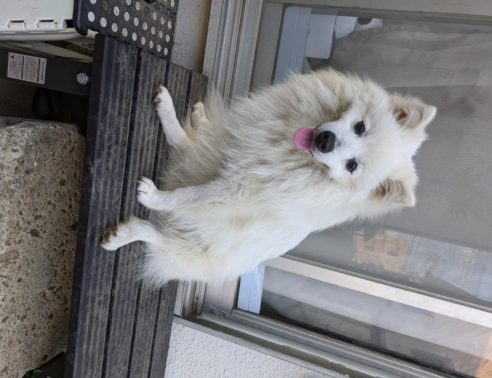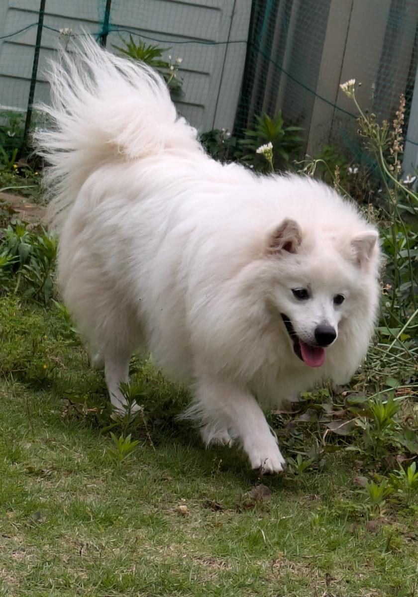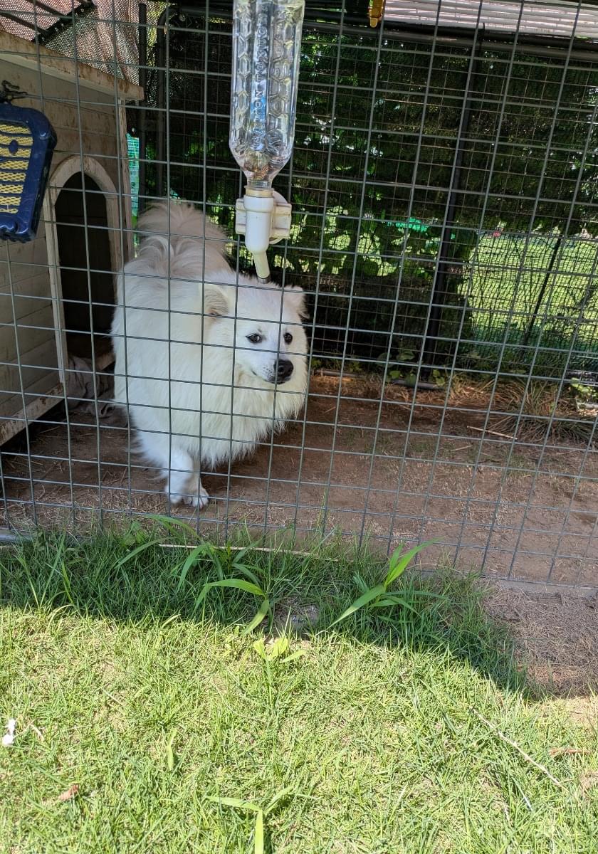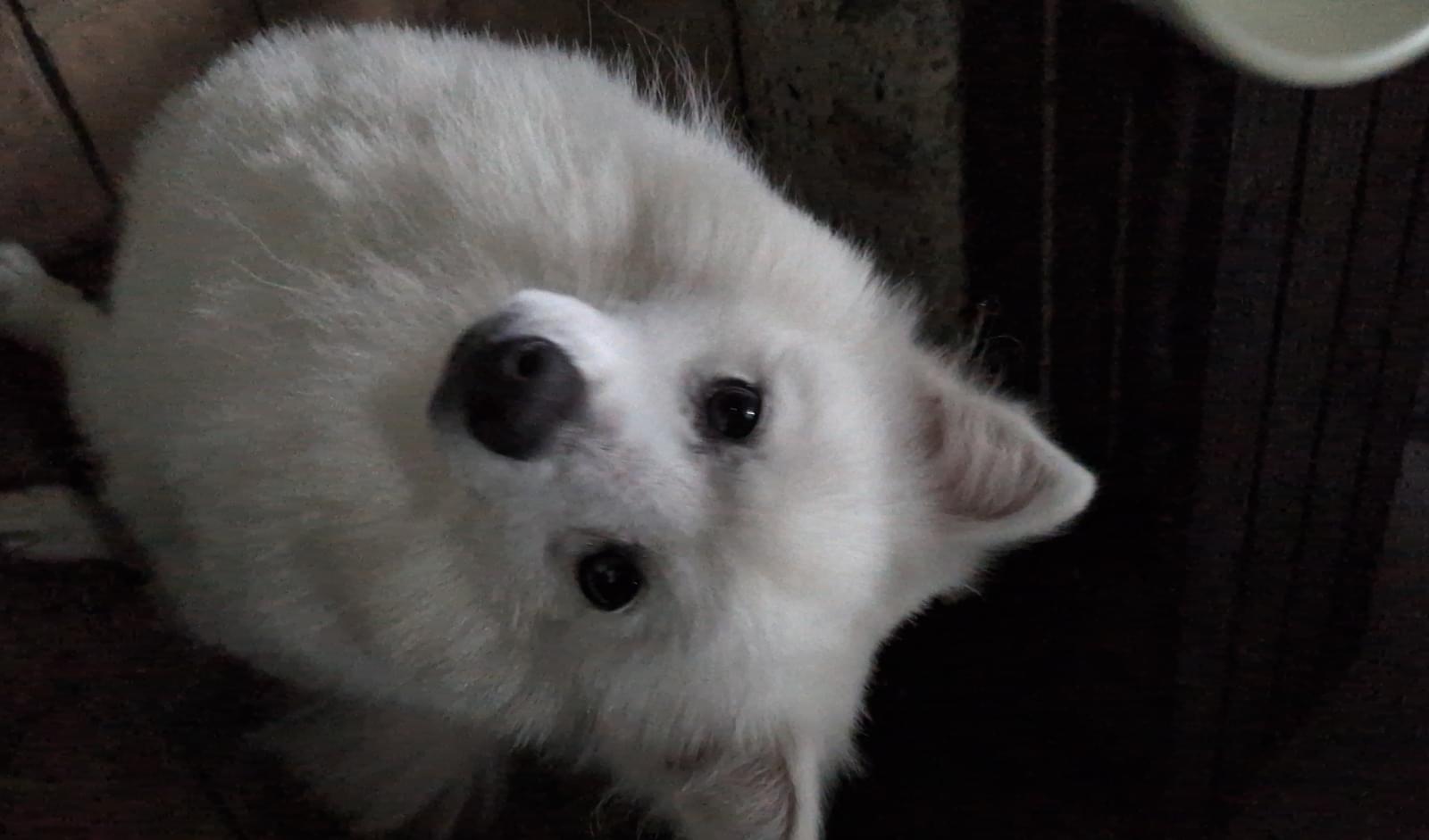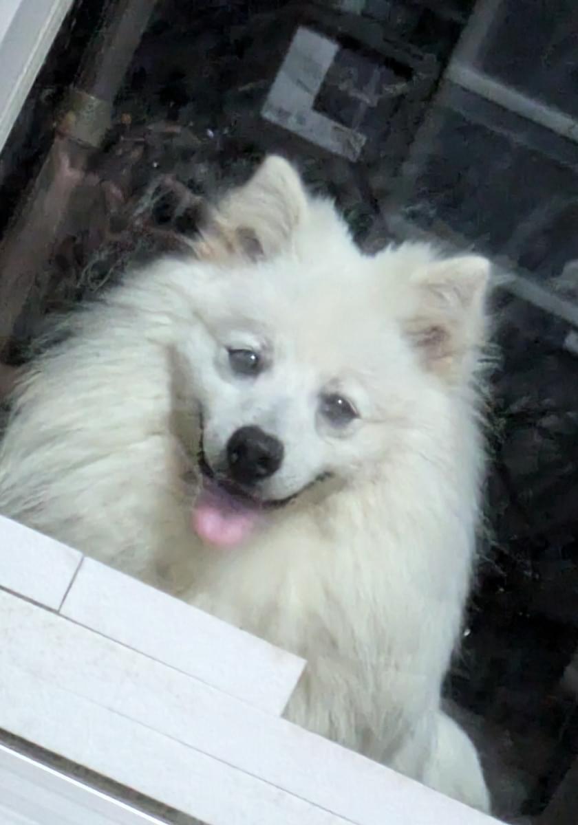 日本スピッツ ヒトに懐っこい子 白色だけど外犬だからちょっと茶色っぽい
