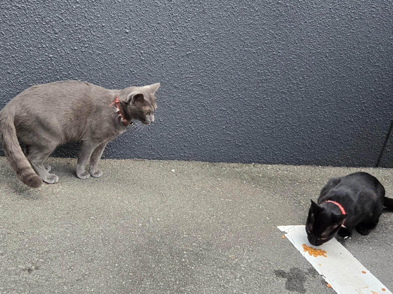 何頭か一緒に行動しており、近隣の方にごはんをもらっているようです。チュールやごはんをあげたところ、寄ってきてくれました。