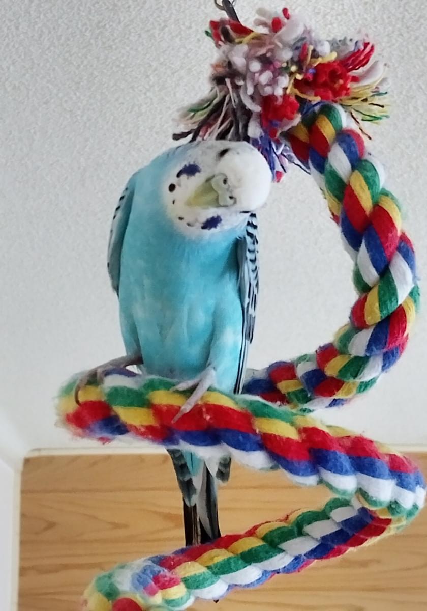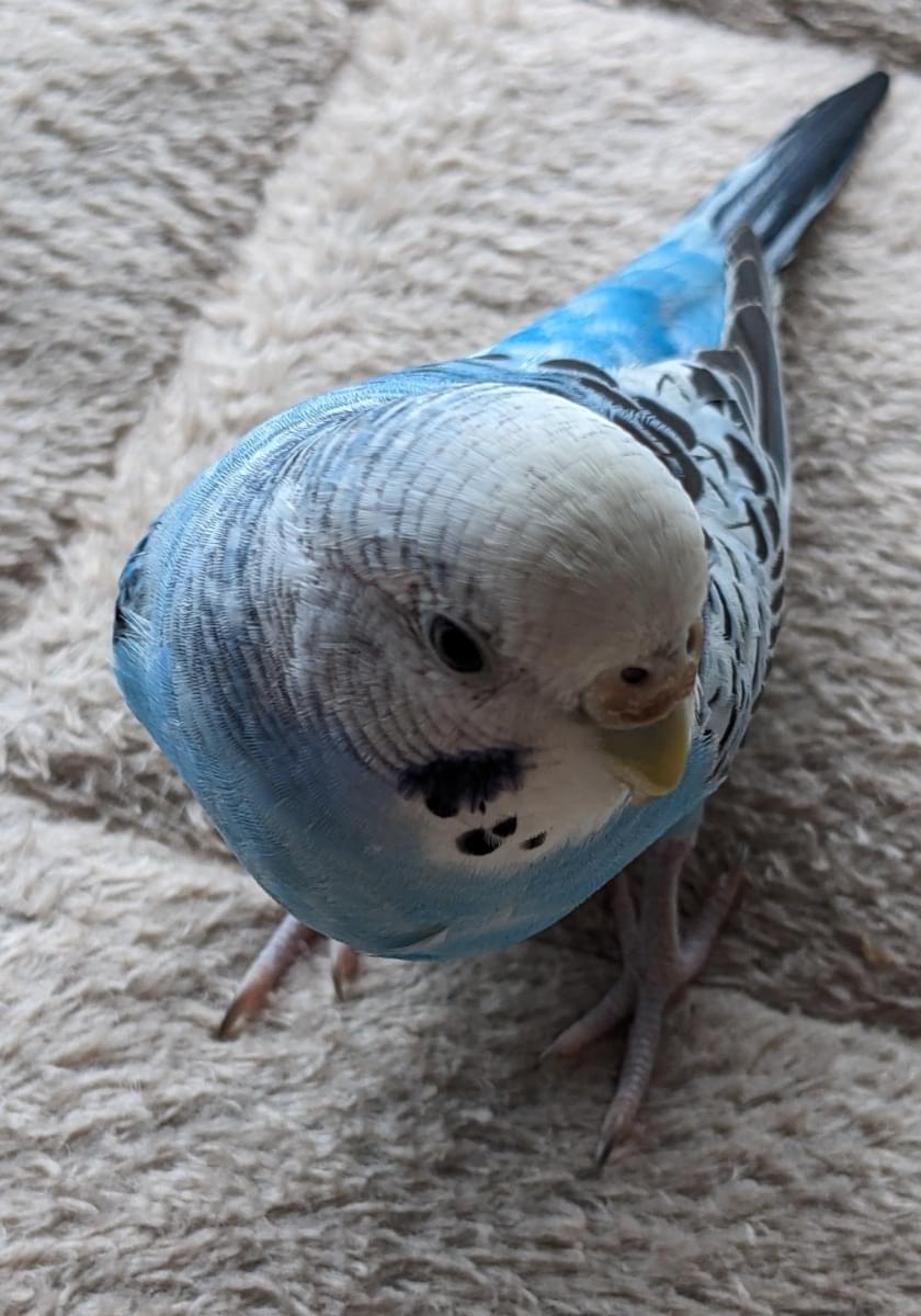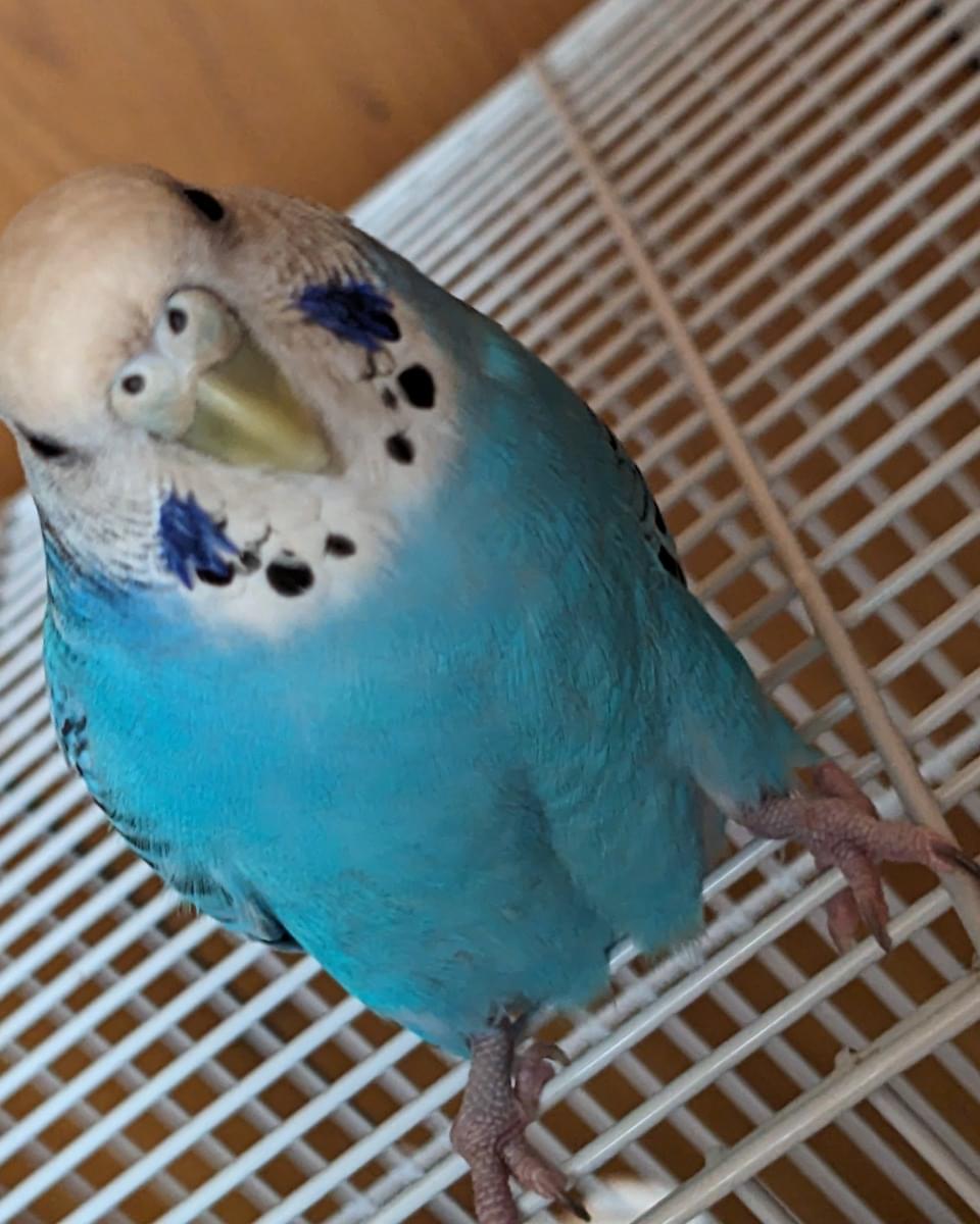 頭は白で後頭部辺りから黒い線があり、身体は水色で羽に黒い模様の入ったセキセイインコです。蝋膜は薄く青みがかっており、「ちぃちゃん」「ちちち」と言葉を喋ります。