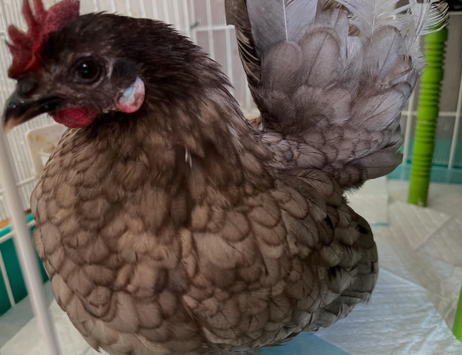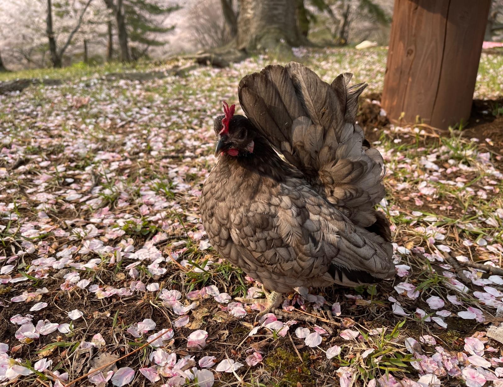 浅黄チャボ:濃い灰色の羽根、羽根の周りに黒い縁取りがあります。足は短く5センチ程。尾羽は真っ直ぐピンと立っているのが特徴です。