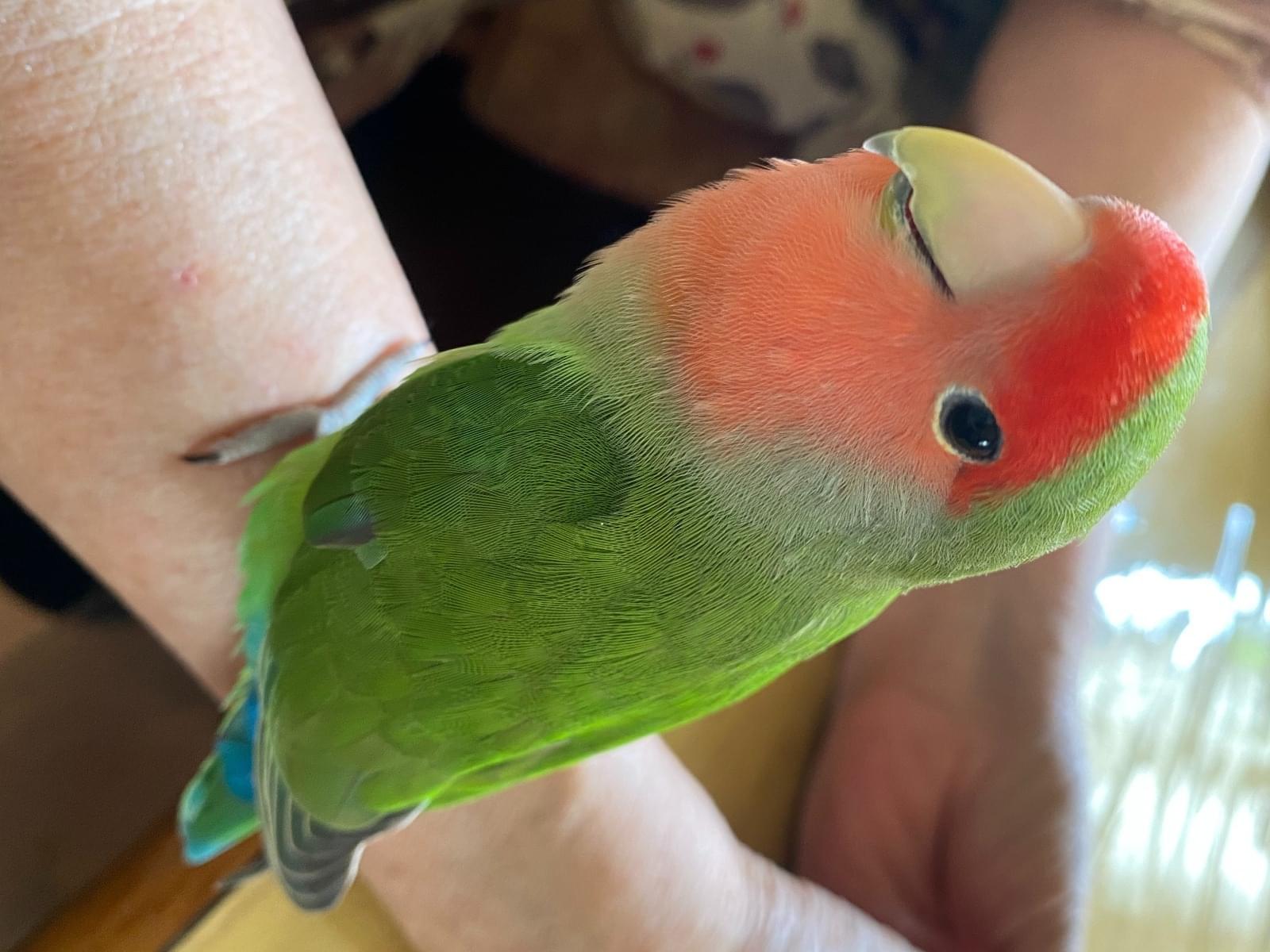 コザクラインコのノーマル(頭部は赤、体は緑、青)の子です。
