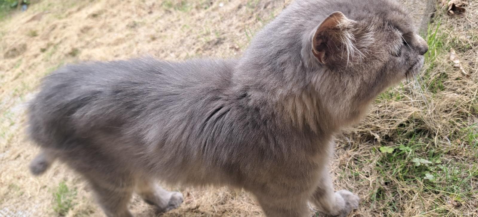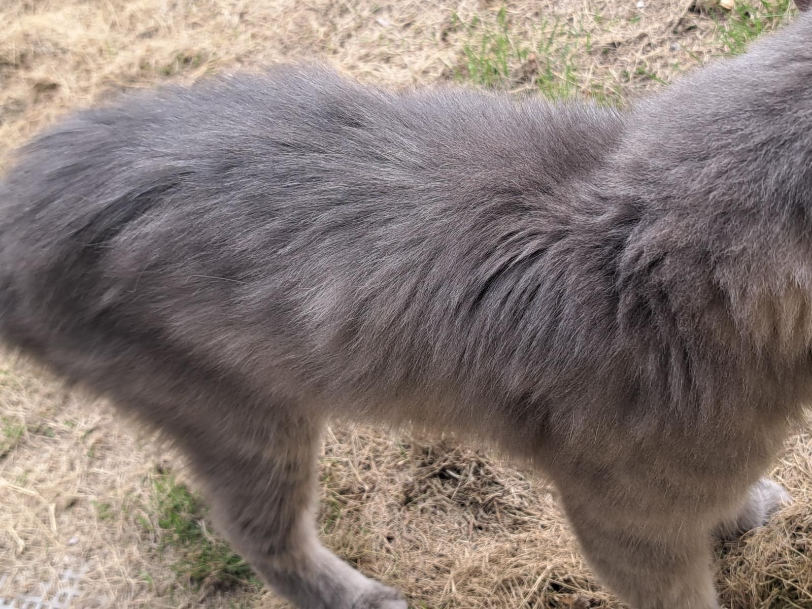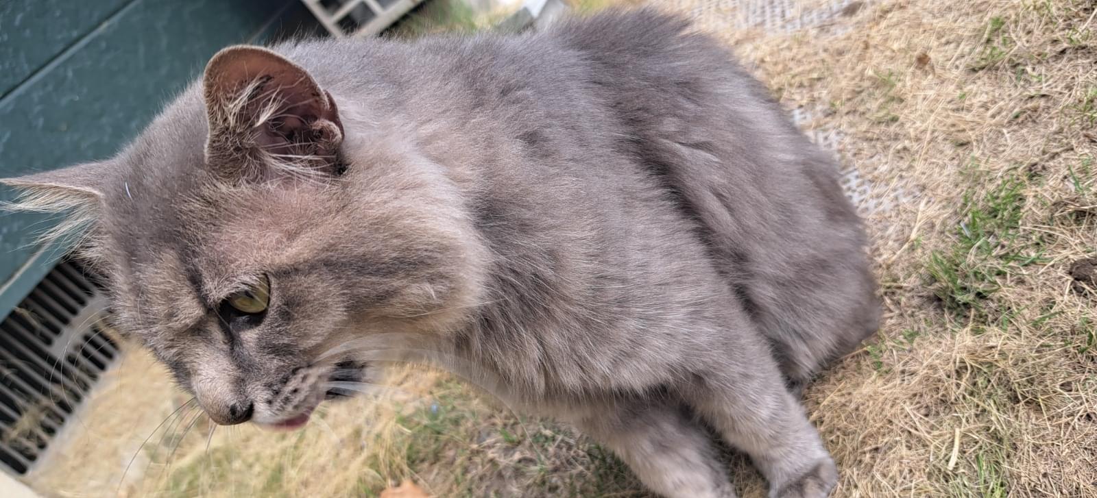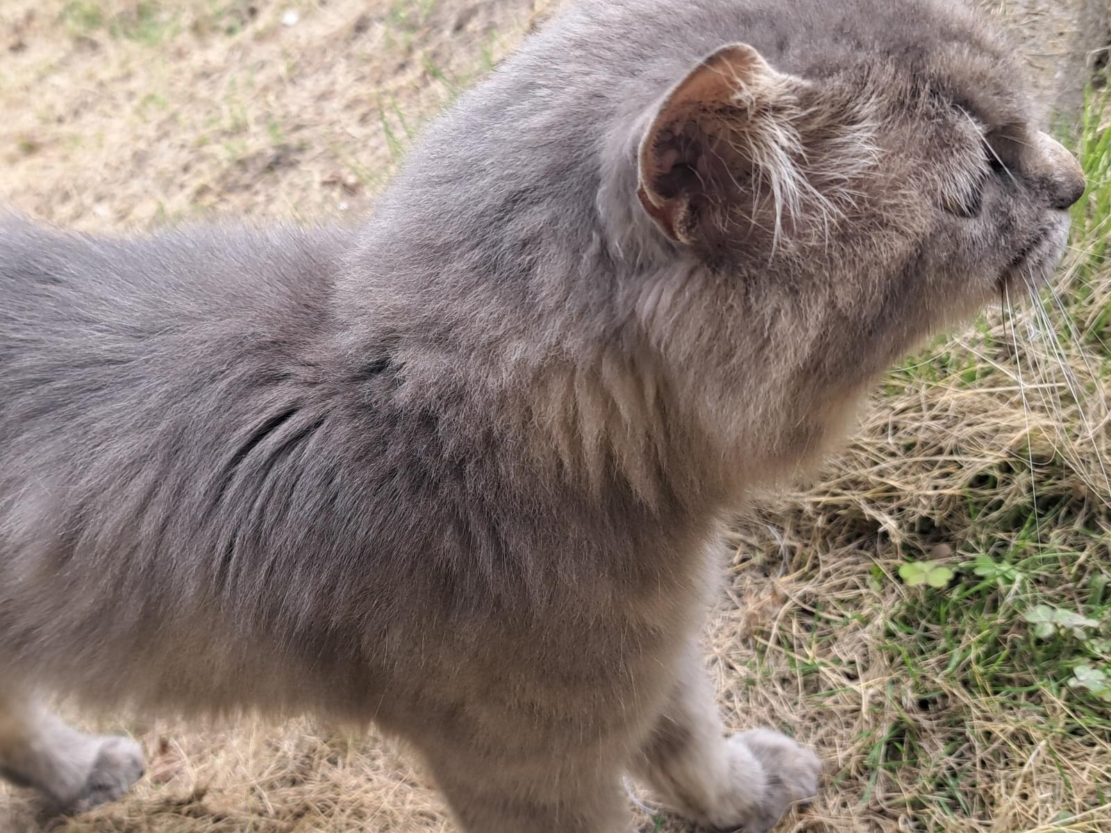 毛色はベージュグレーでうっすらトラ柄。