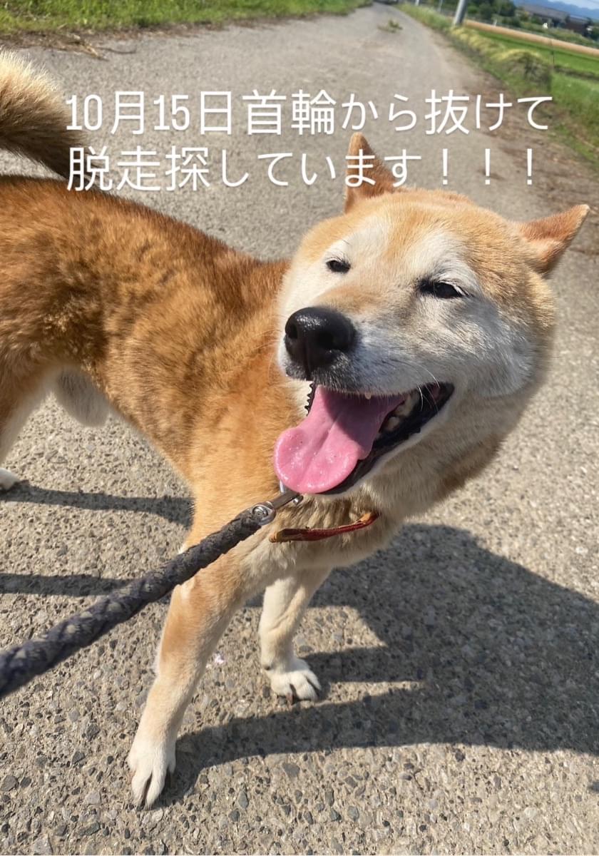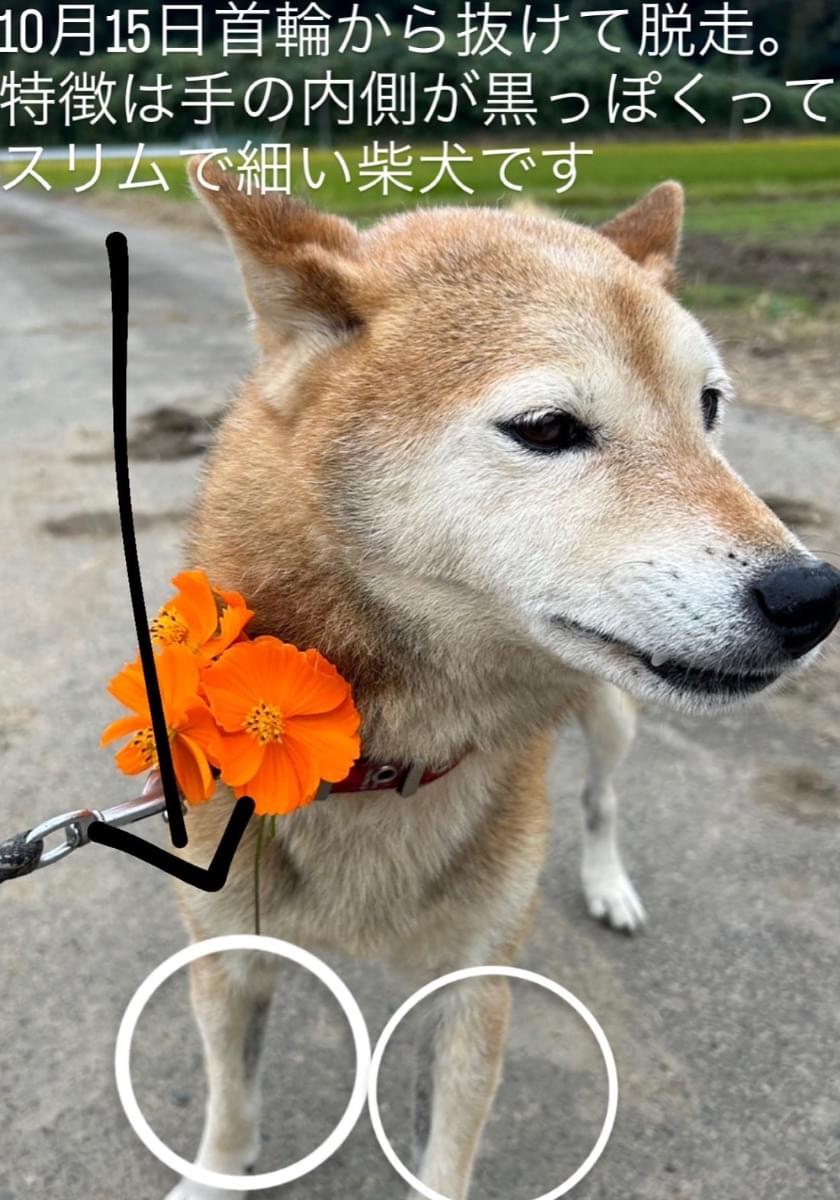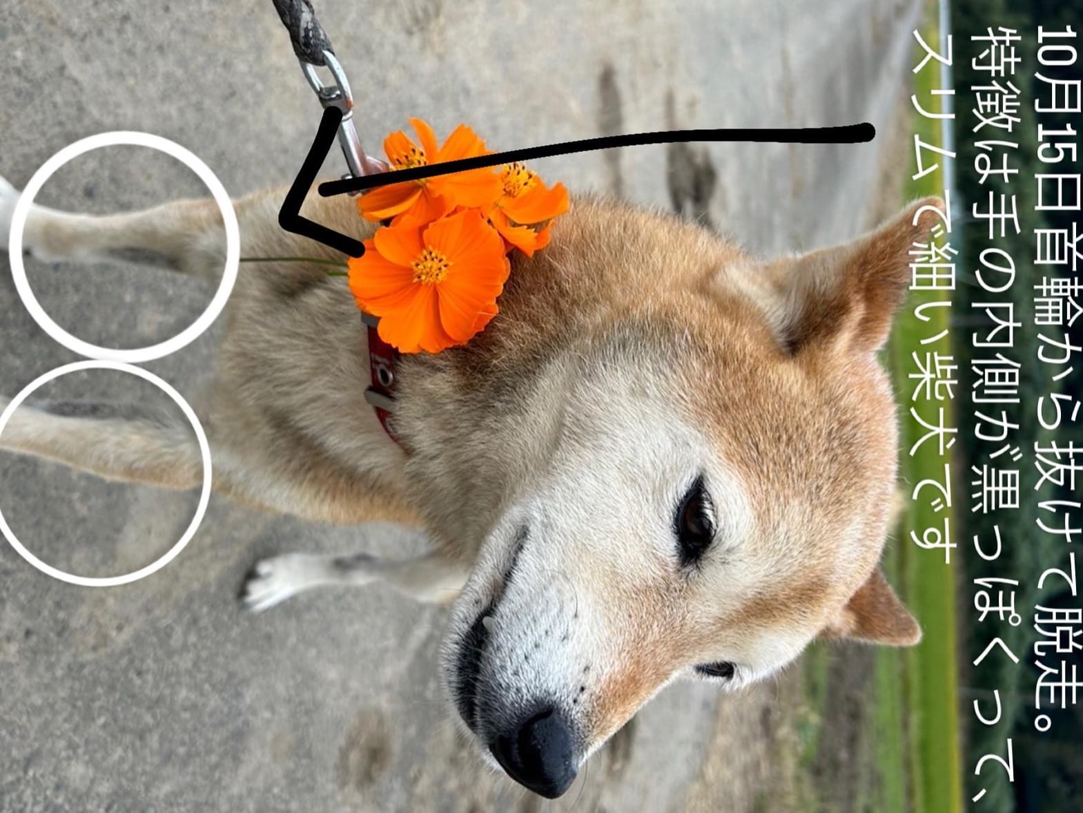 柴犬を探しています黒と白と茶が混ざってスリムな柴犬です。首輪ごと抜けて脱走してしまいました
