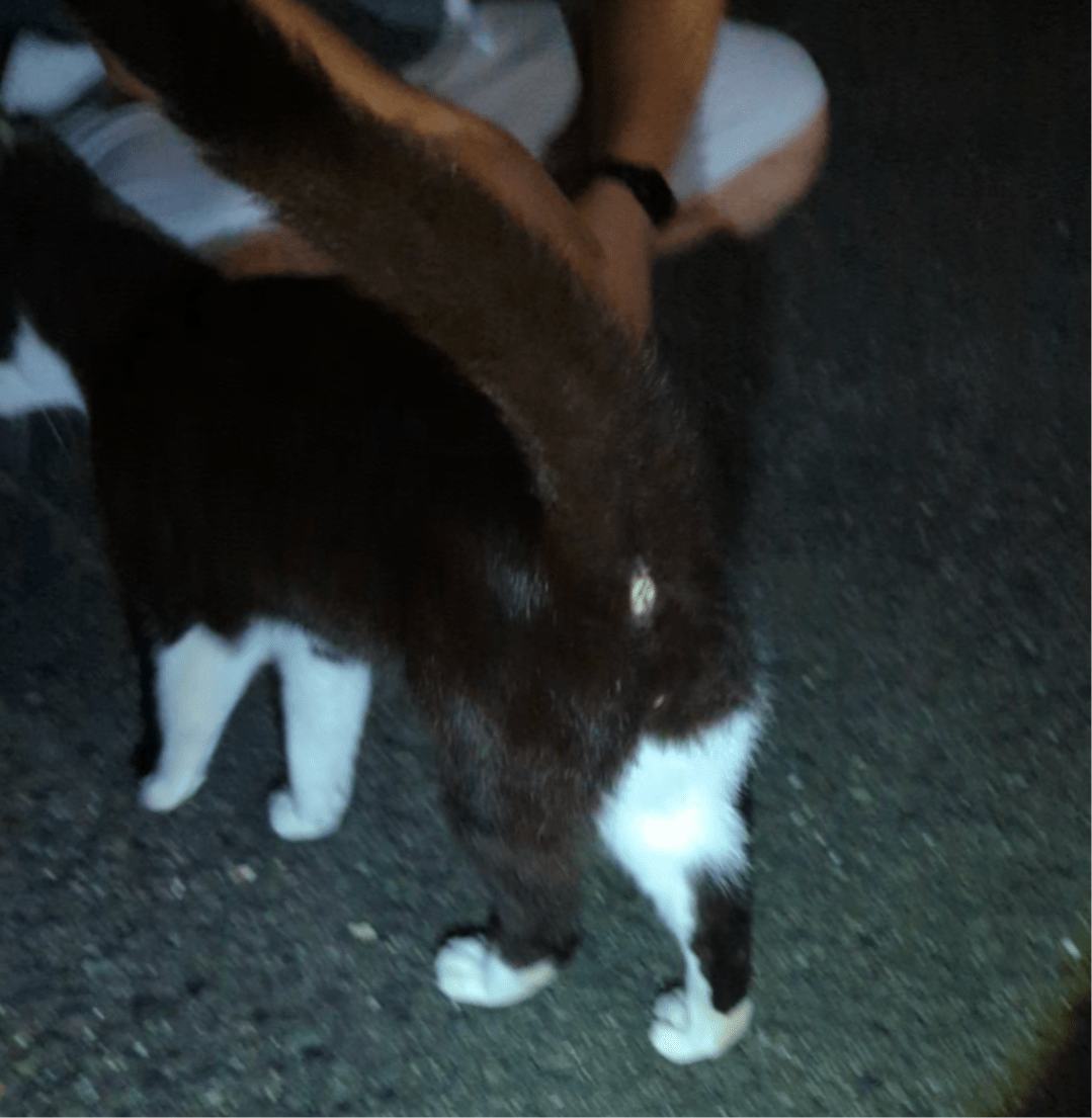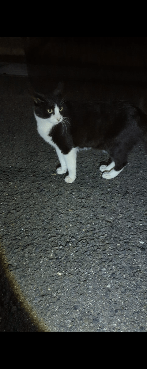 白黒ハチワレ、耳カットなし、5kgくらい、懐っこい