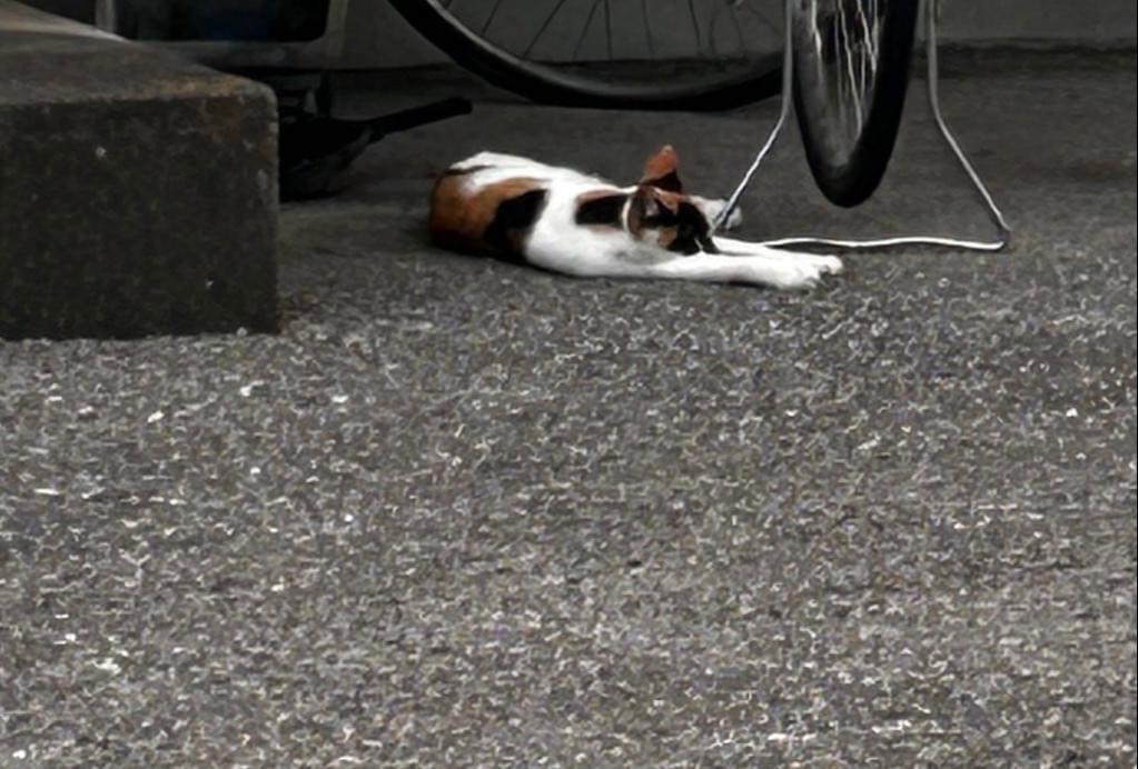 見かけた状況は、この子だけ離れた場所で休んでいましたが、すぐ近くに他の野良猫と思われる猫3匹がおり、猫集会のようなものをしていました。