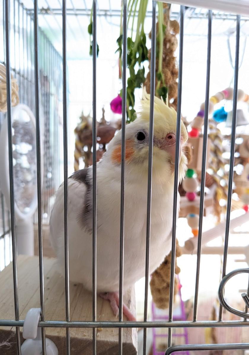 目がくりっとして、人懐っこいです。鼻歌をよく歌います。足にリングがついてます。部屋で放鳥中に、私の不注意で飛んで行ってしまいました。音に敏感で臆病な子です。よろしくお願いします。