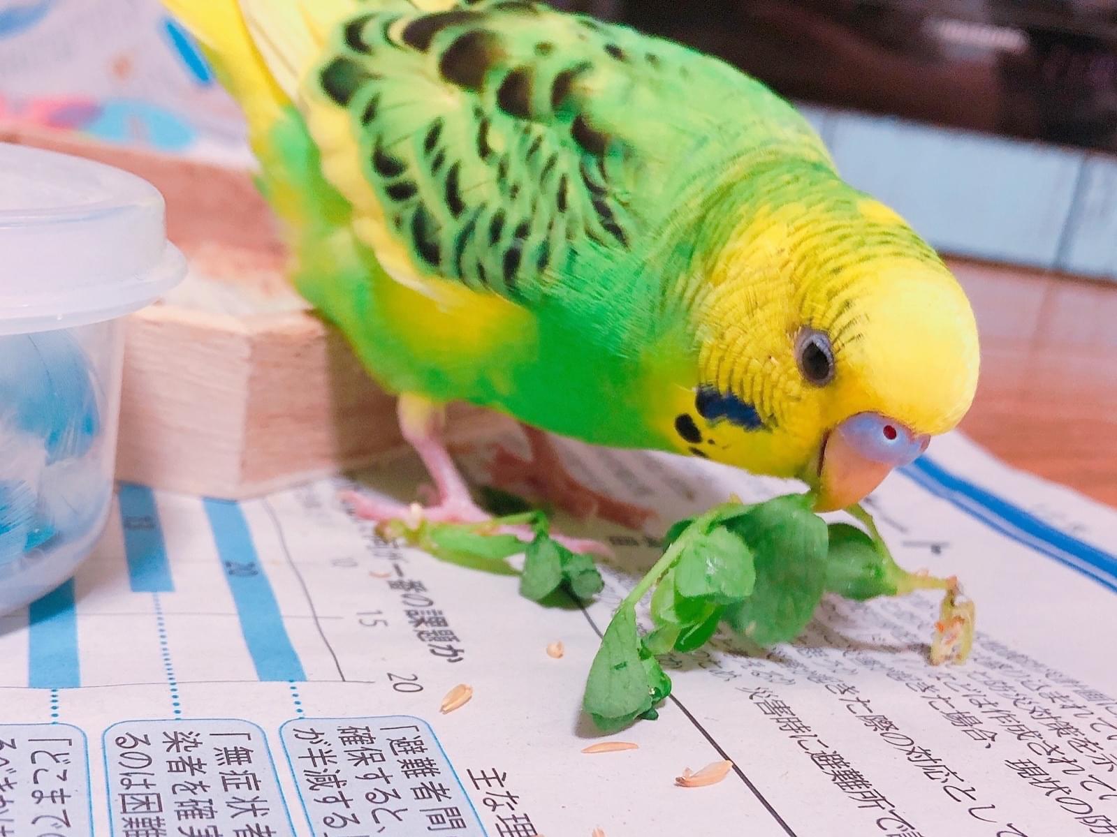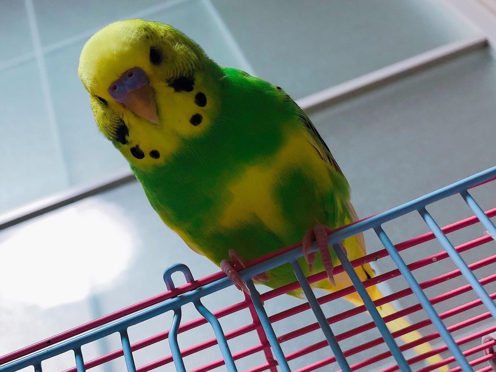 黄色と緑色が混ざったセキセイインコです。お腹の中心が黄色くなっています。