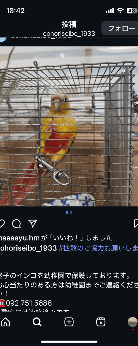 ホーム保護鳥福岡県保護保護管理編集するポスター掲載終了最終更新日時:2025/10/18 07:40写真情報用件保護性別不明年齢不明場所福岡県 福岡市中央区大濠発生日時2025年10月17日(金)保護者ともこ説明大濠聖母幼稚園で保護しています。 10月17日13時半頃、園庭の木に飛んできました。 その後、室内に入ってきたところを、保護。 幼稚園に連絡ください。連絡先URL未設定掲示板情報交換のための掲示板です。ユーザーからの情報提供、オーナーからの連絡などにご利用下さいませ。コメントを書き込む同日通りすがり返信3件2025/10/19 01:51ウロコインコの件です藤井返信0件2025/10/19 01:33保護をありがとうございます鳥っきーマーボ返信0件2025/10/18 09:15