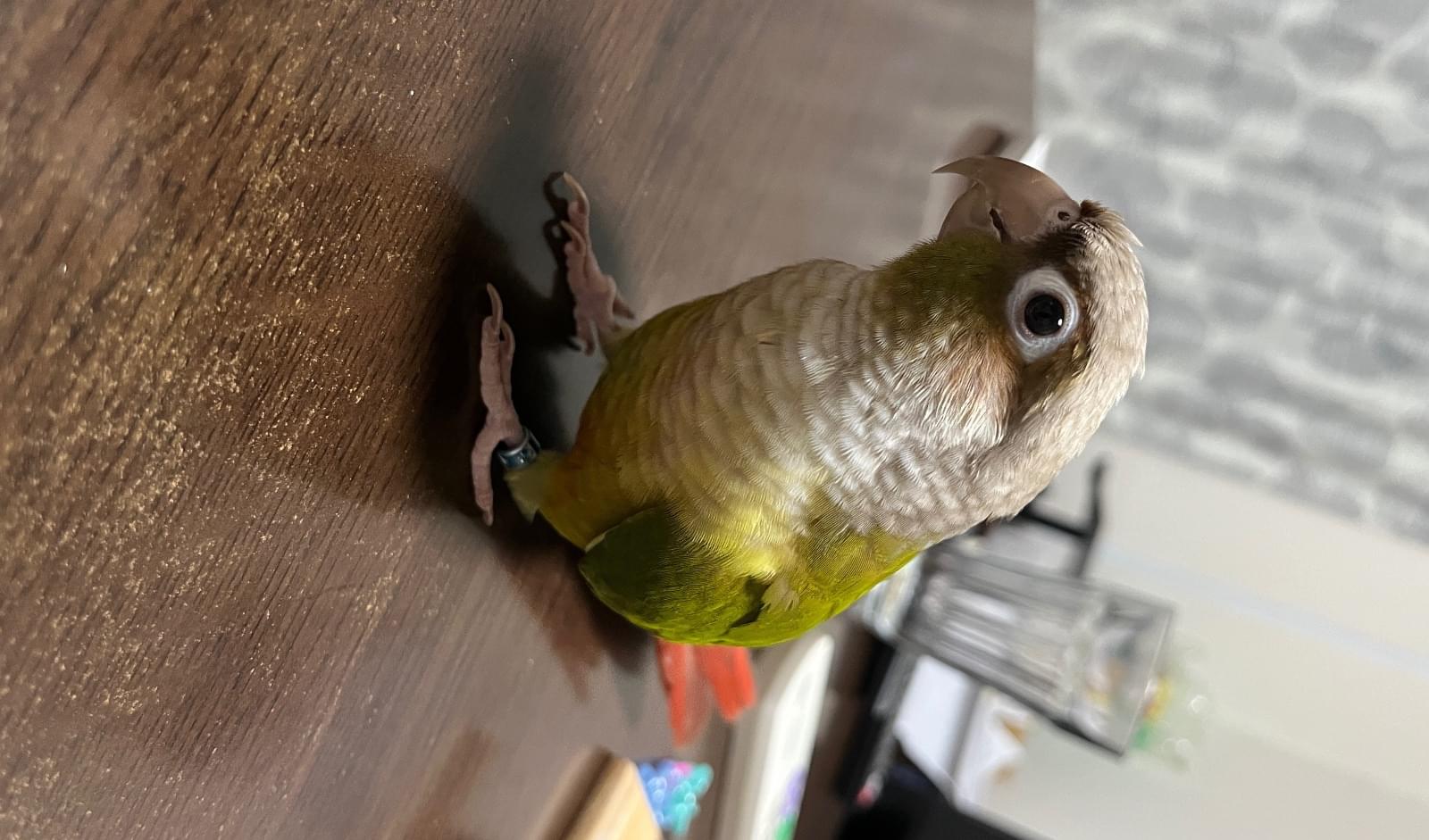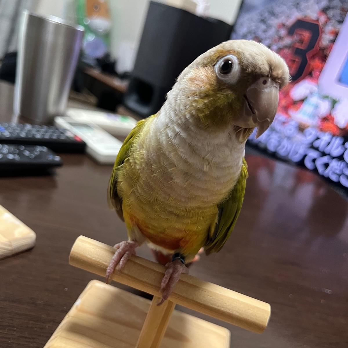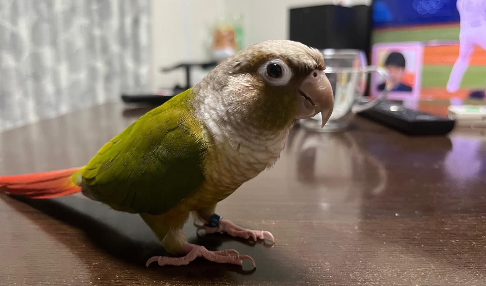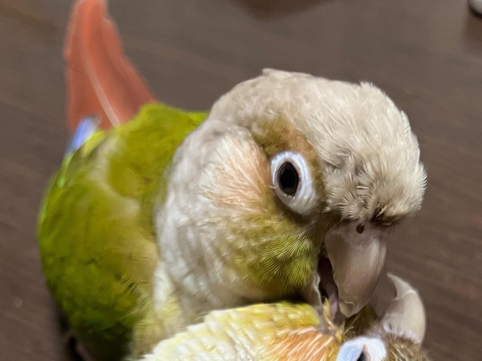 特徴(行動):楽しくなると激しく上下に首を振る。また、嘴を勢いよく床や止まり木に叩きつける仕草をする。寝る時間になってケージに戻るとき「ダメじゃん!」と人間の言葉を言う。