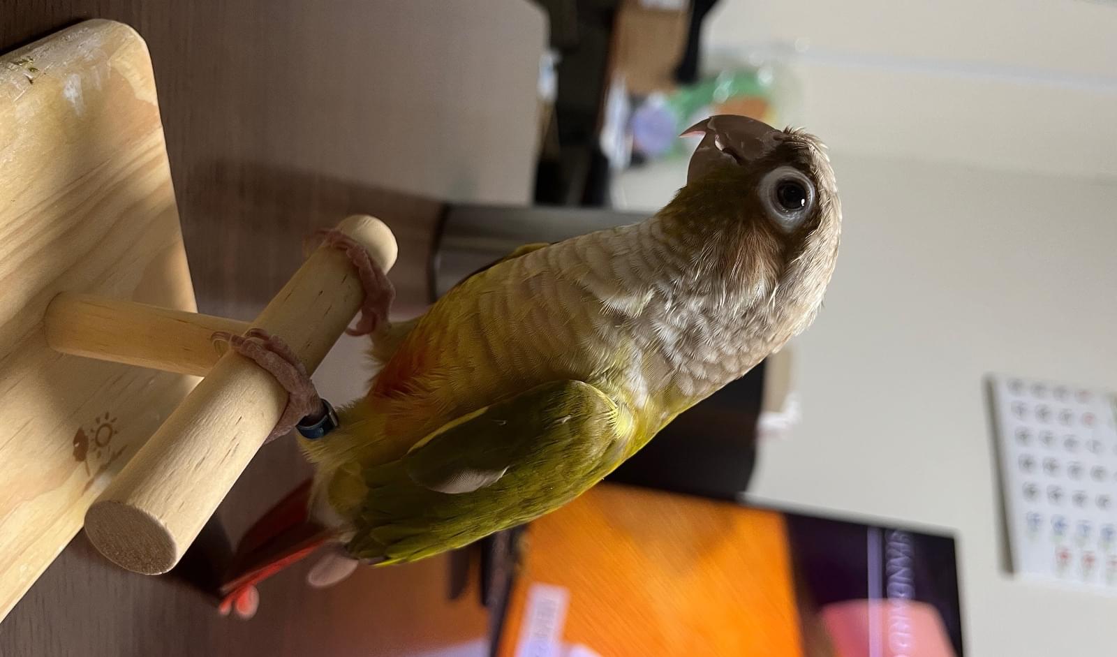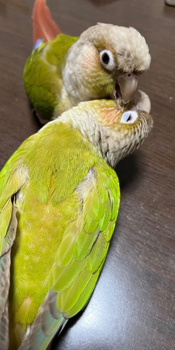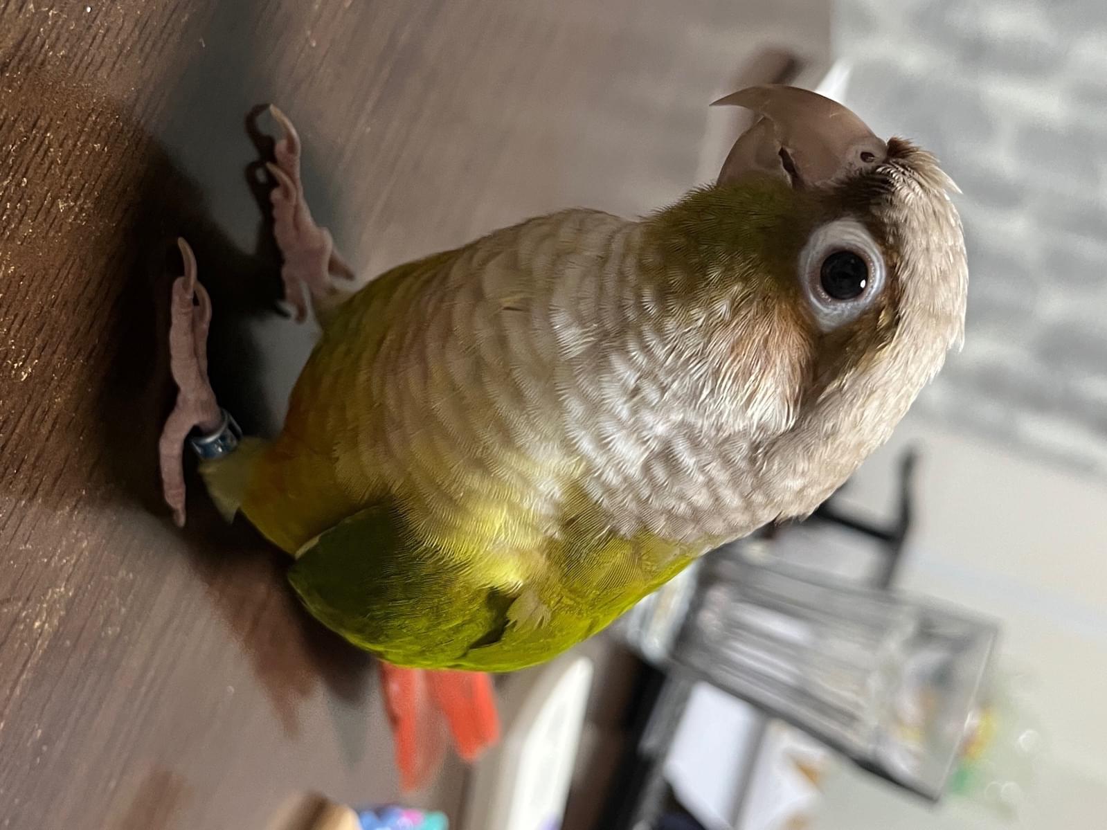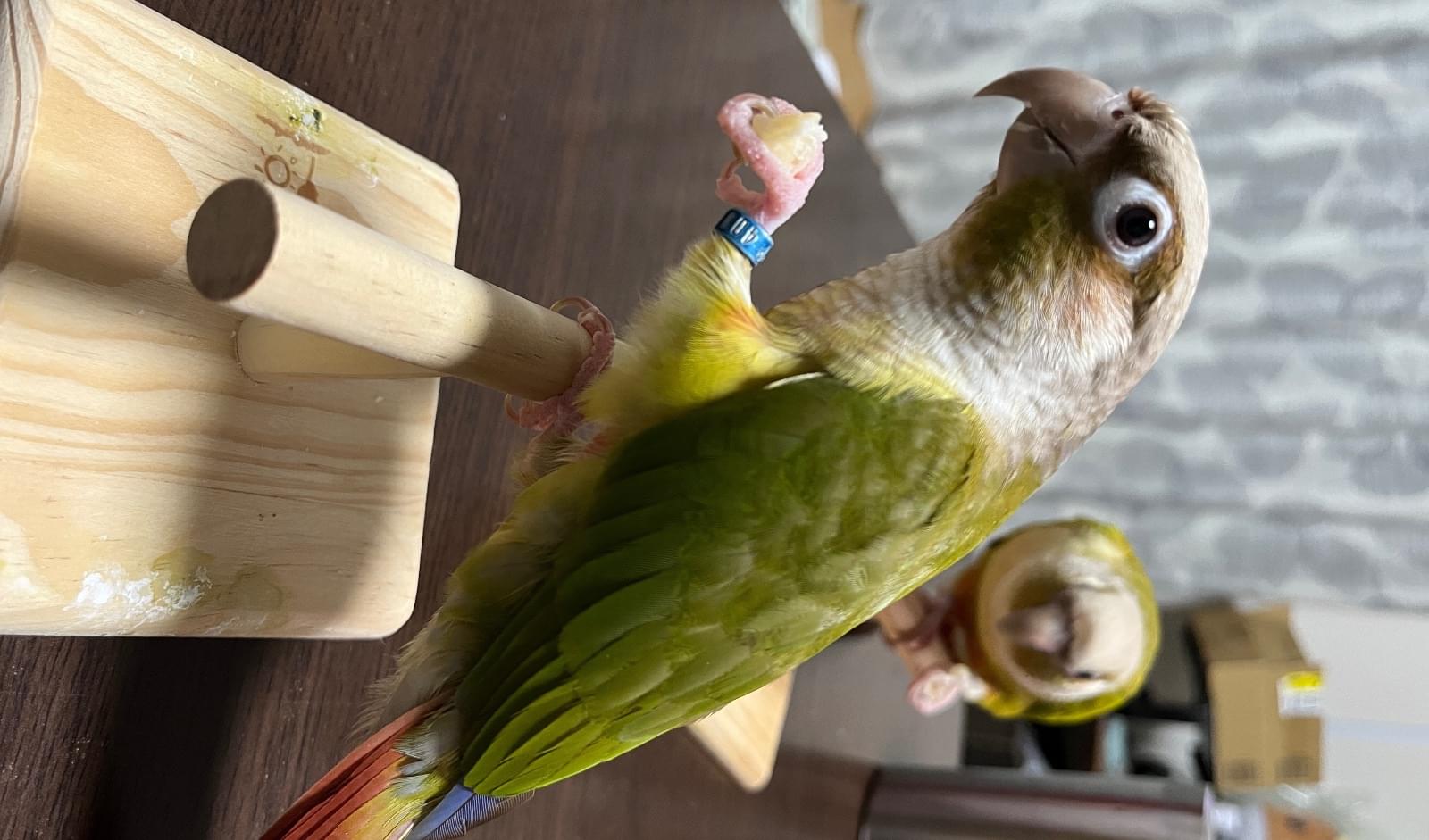 特徴(行動):楽しくなると激しく上下に首を振る。また、嘴を勢いよく床や止まり木に叩きつける仕草をする。寝る時間になってケージに戻るとき「ダメじゃん!」と人間の言葉を言う。
