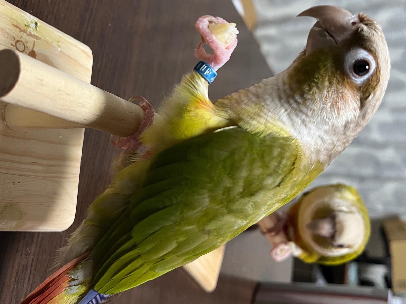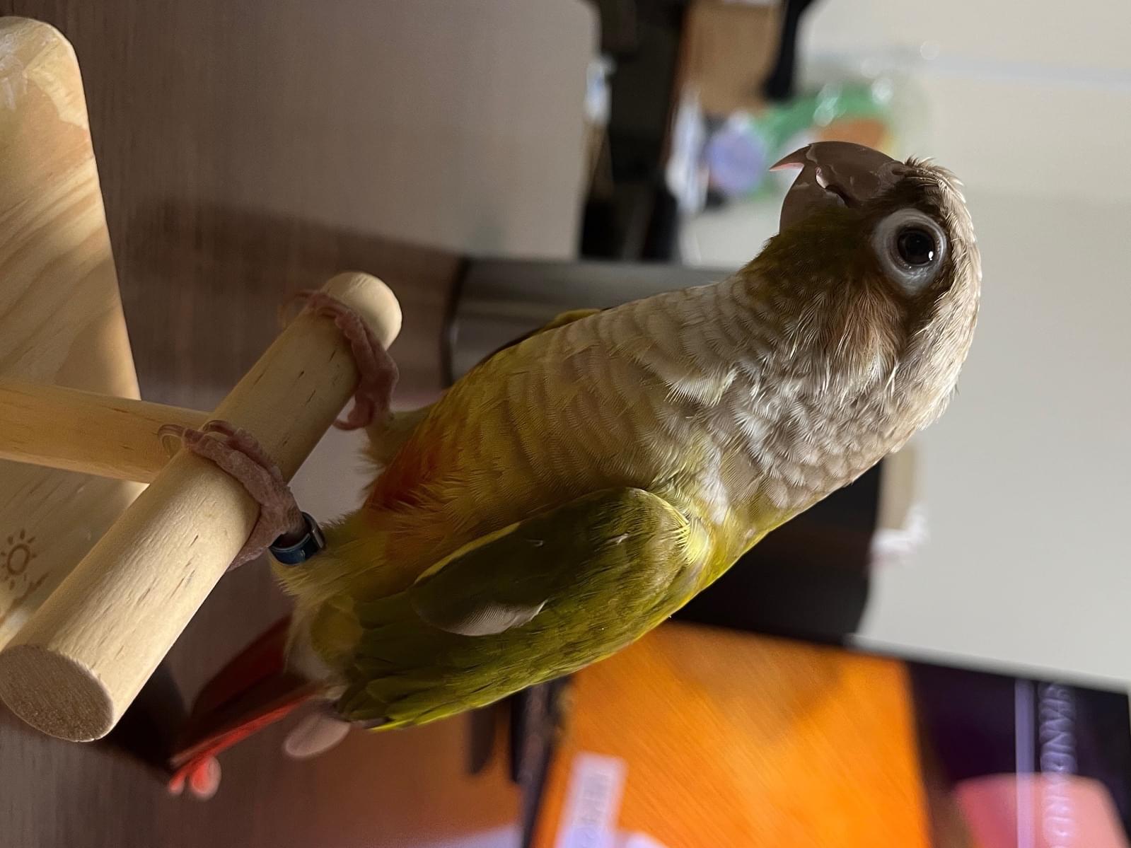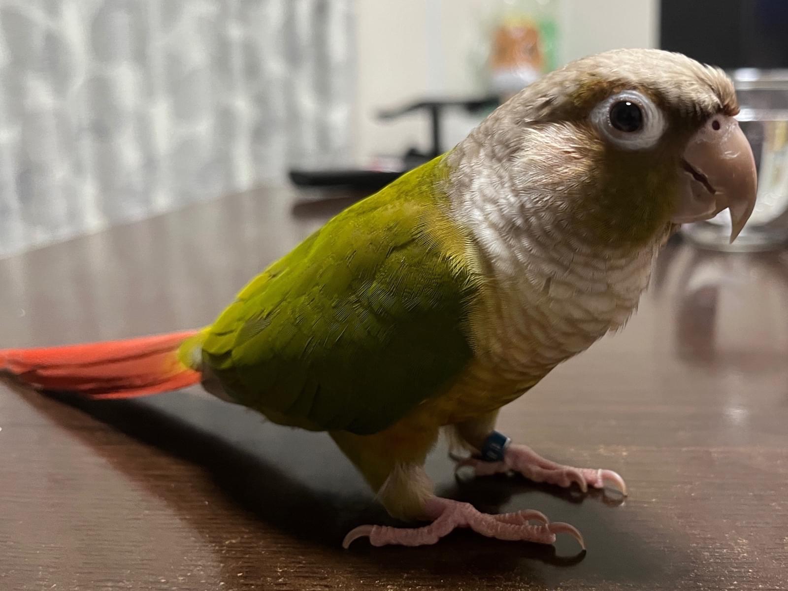 特徴(身体):尾っぽは茶色味がかった赤。羽の色は、赤・緑・グレー・白・黄色・オレンジ。首周りが少し青色がかっている。左脚に青色の足輪がある。目が大きくアーモンド型で、目尻に白目がチラッと見える。