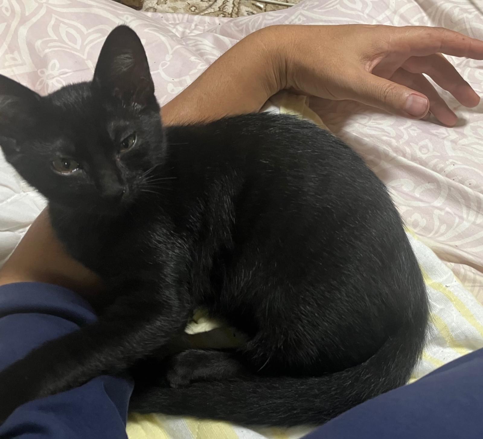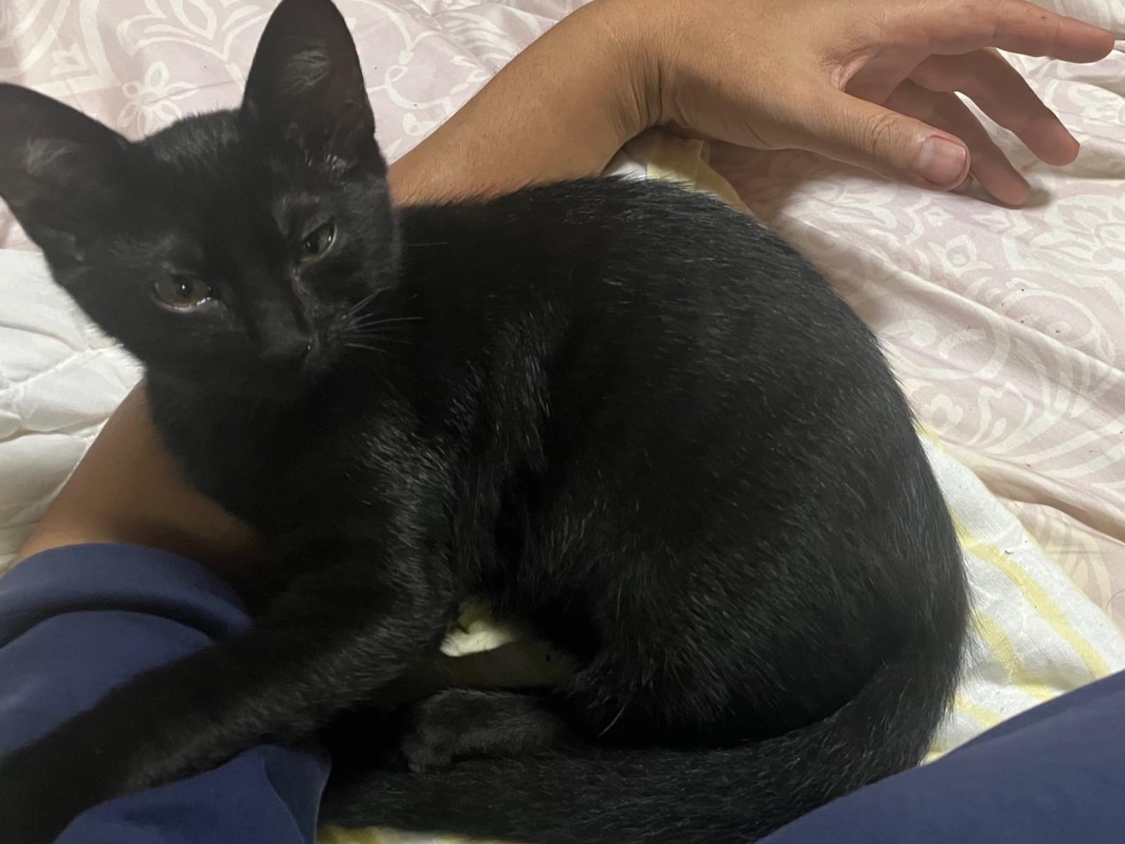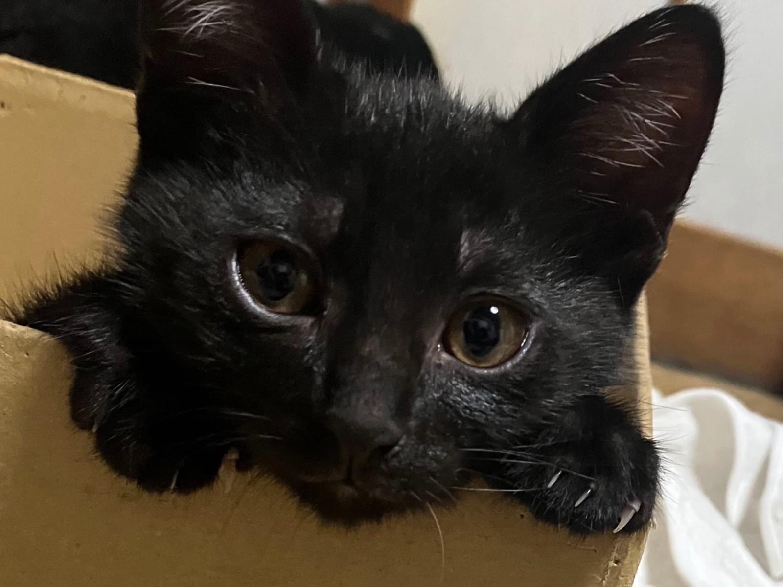 オレンジ色の目をした小柄な黒い子猫を探しています