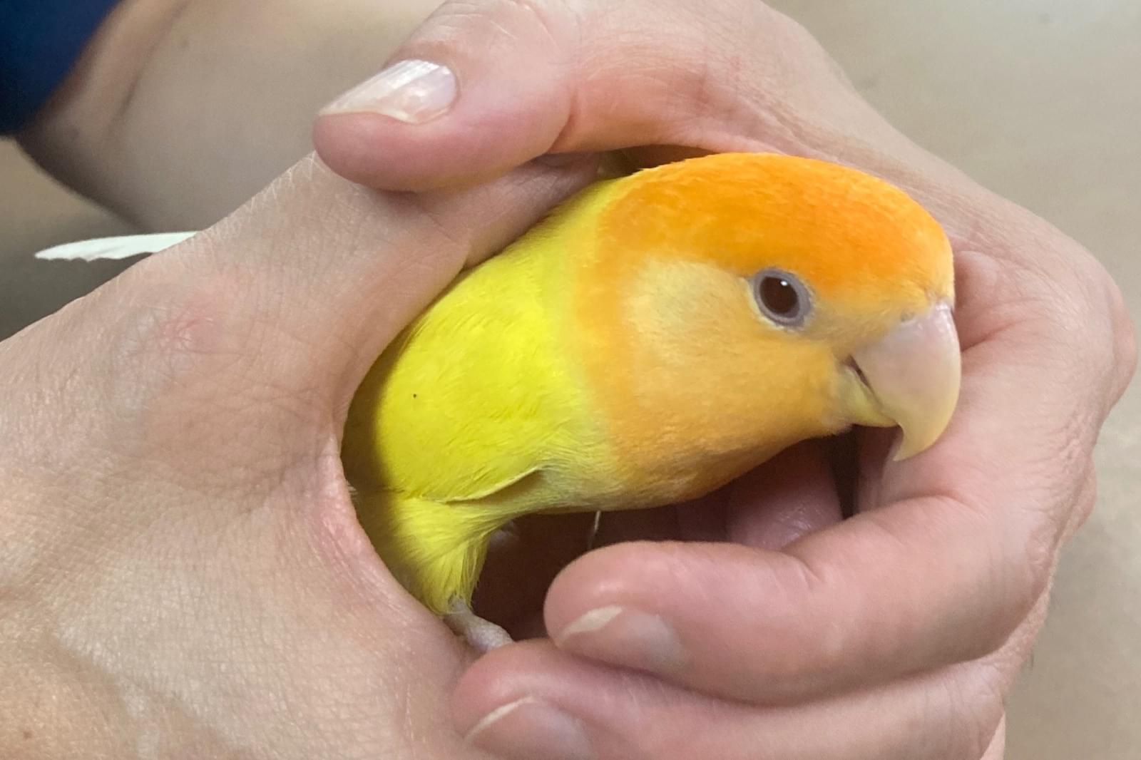 オレンジ色の頭の色、黄色の体のインコを保護しました