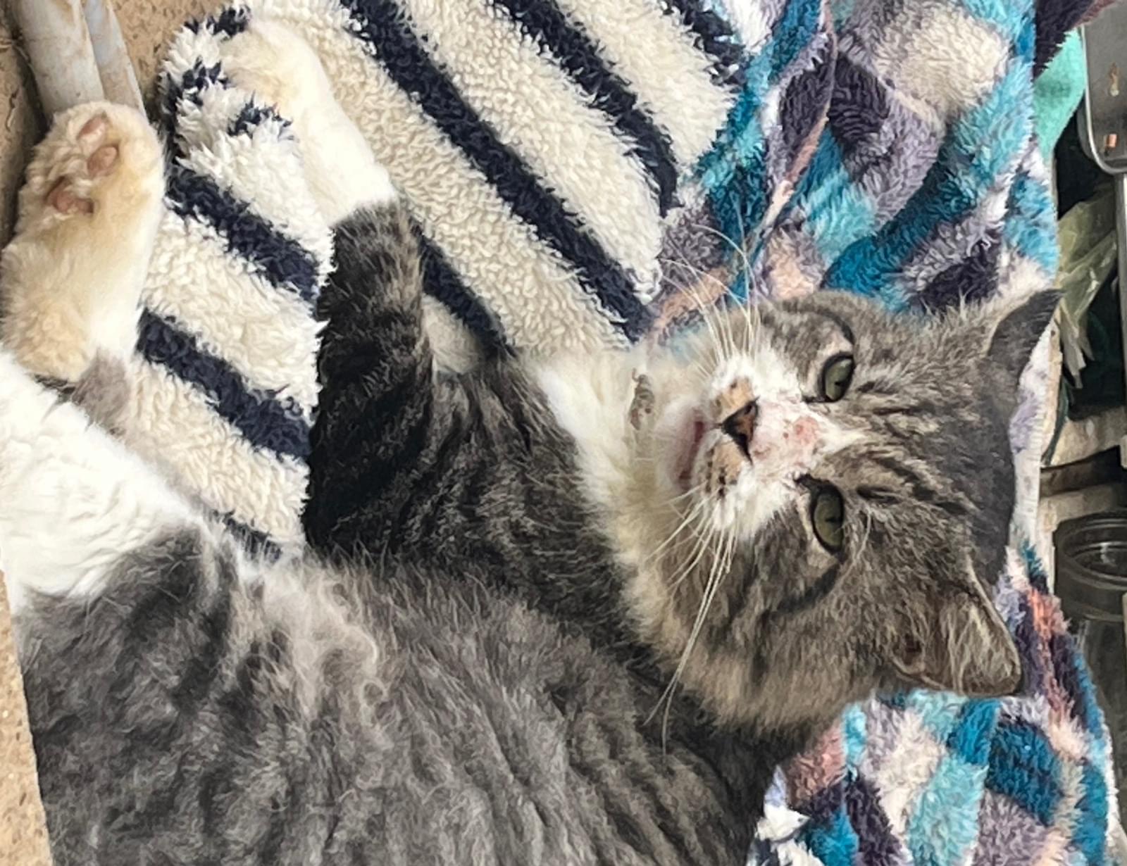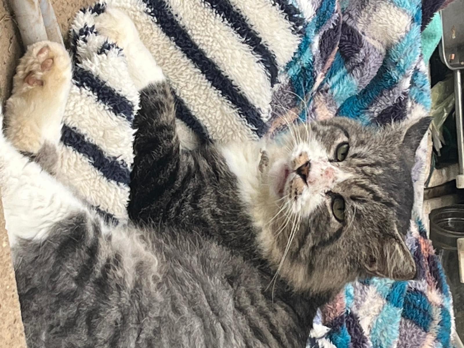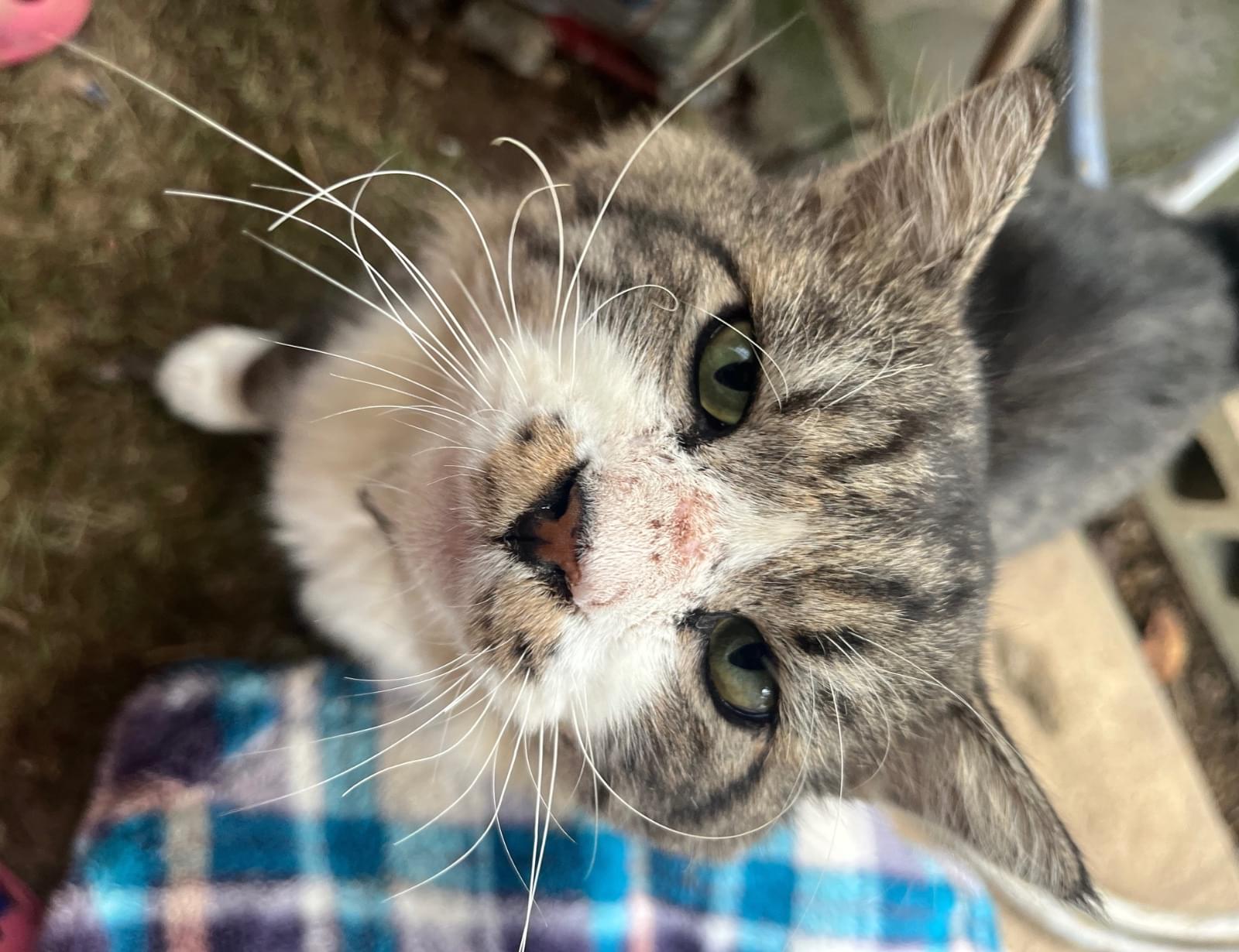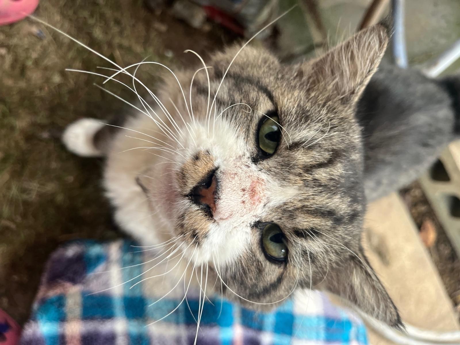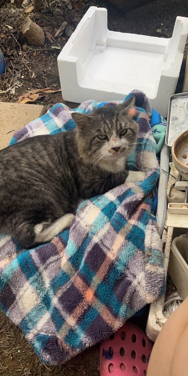 サビ虎かキジ虎柄の長毛猫です。赤い首輪をしていました。前足たびで後ろ足ソックス。3日ぐらいから近所でご飯もらっていて,15日からほとんどいます。食欲旺盛,人懐っこい男の子です。
