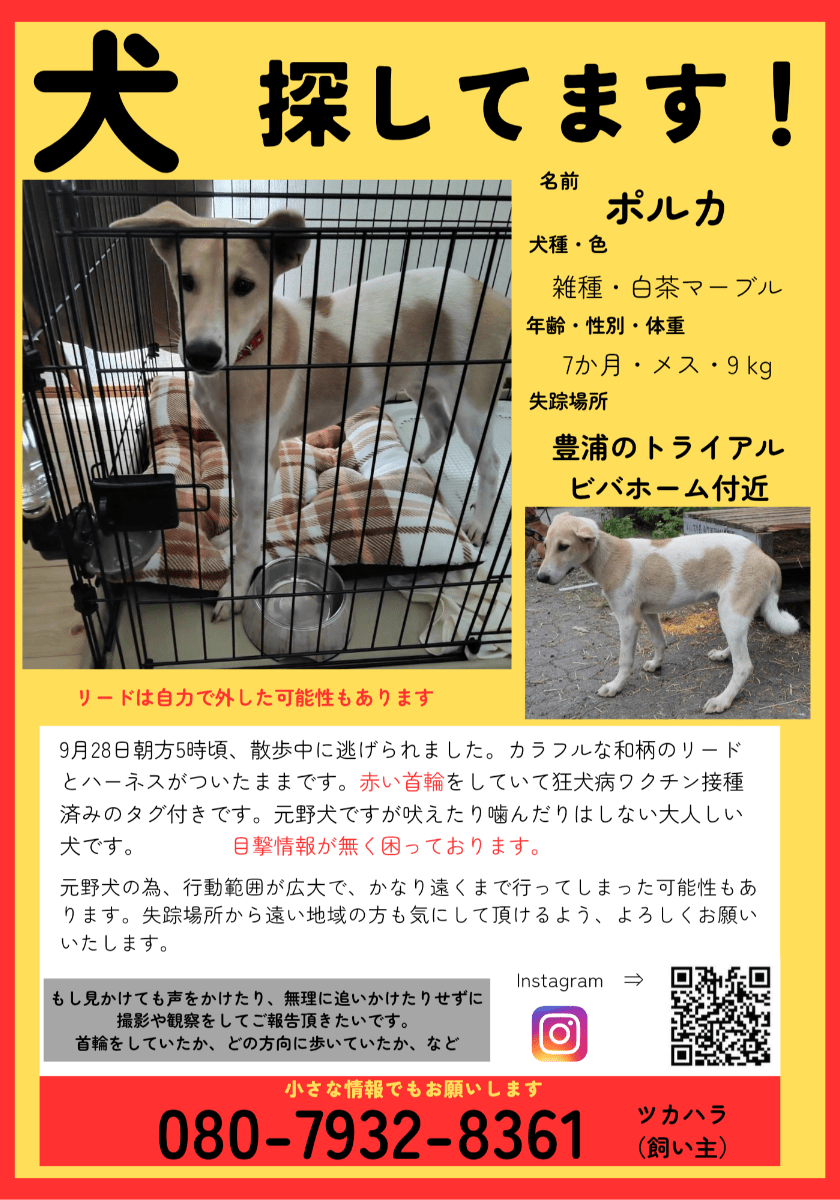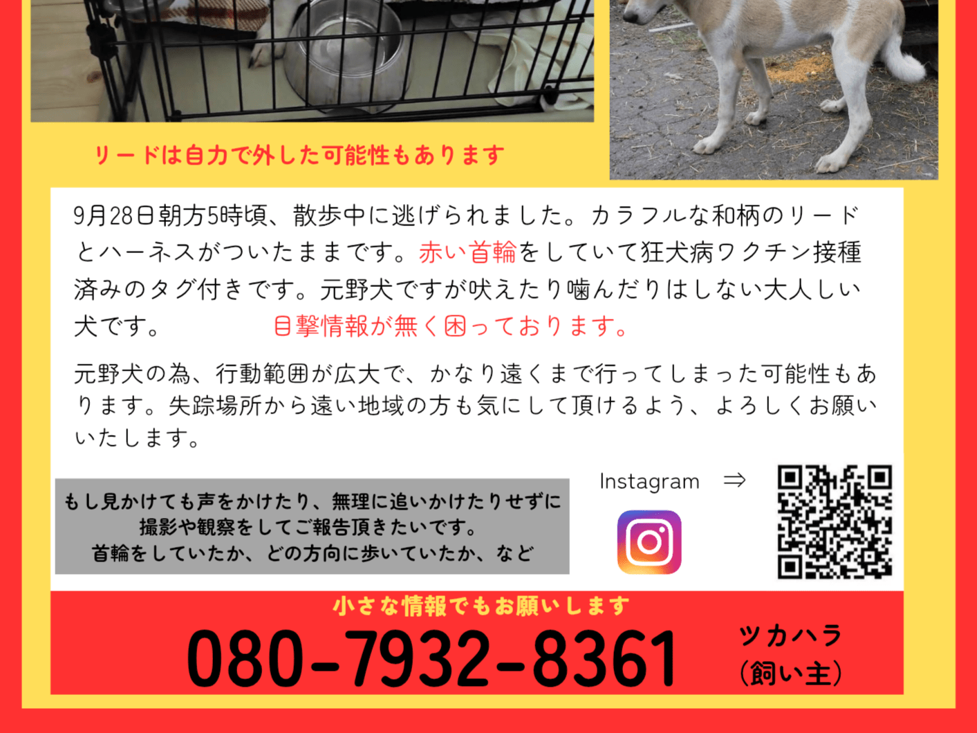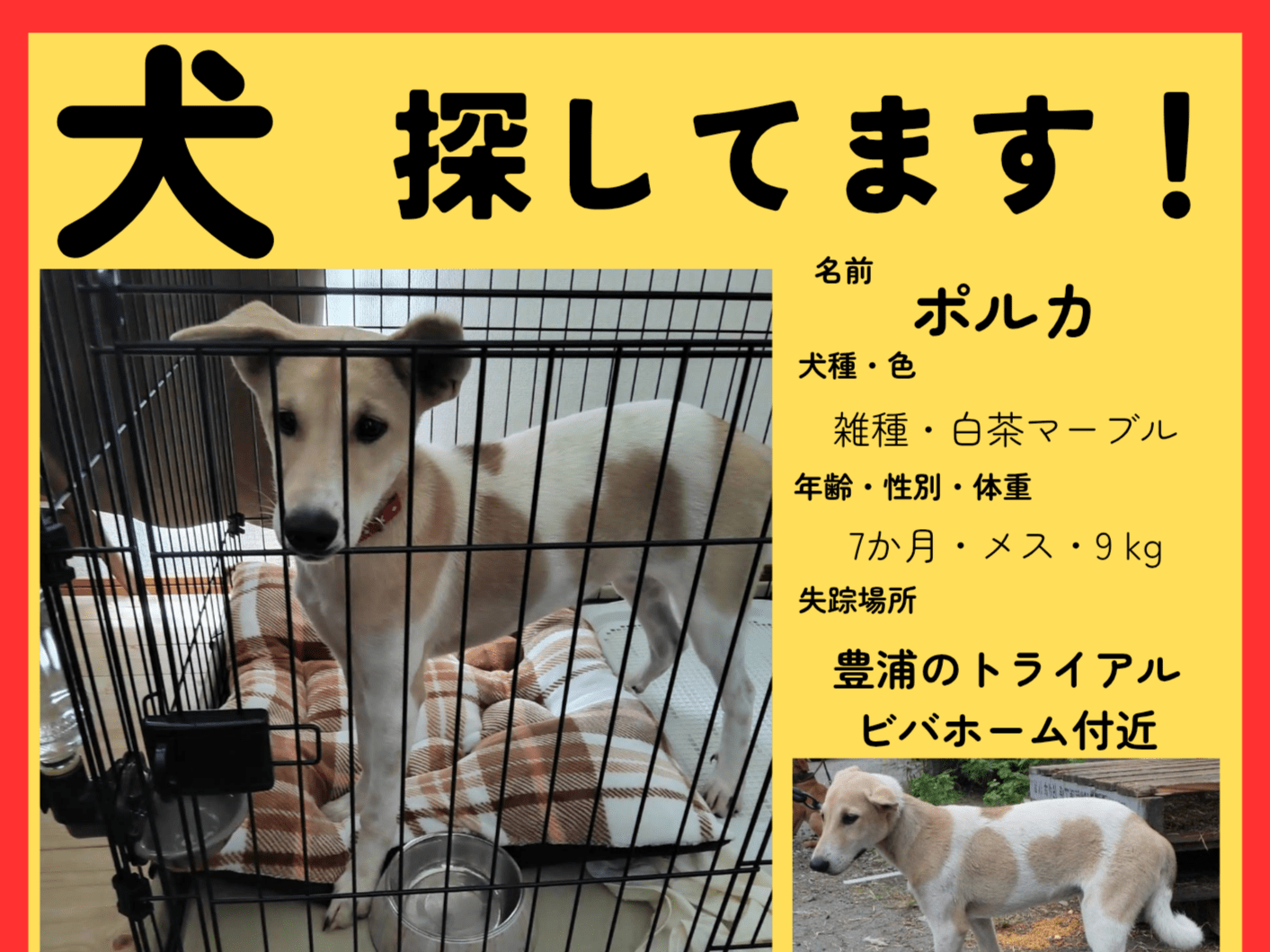 元野犬のため、行動範囲が広大のため遠くまで行ってしまった可能性があります。