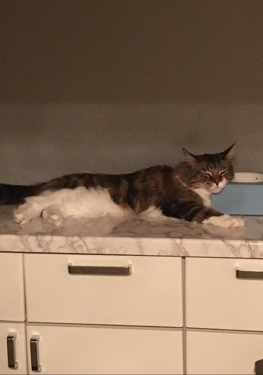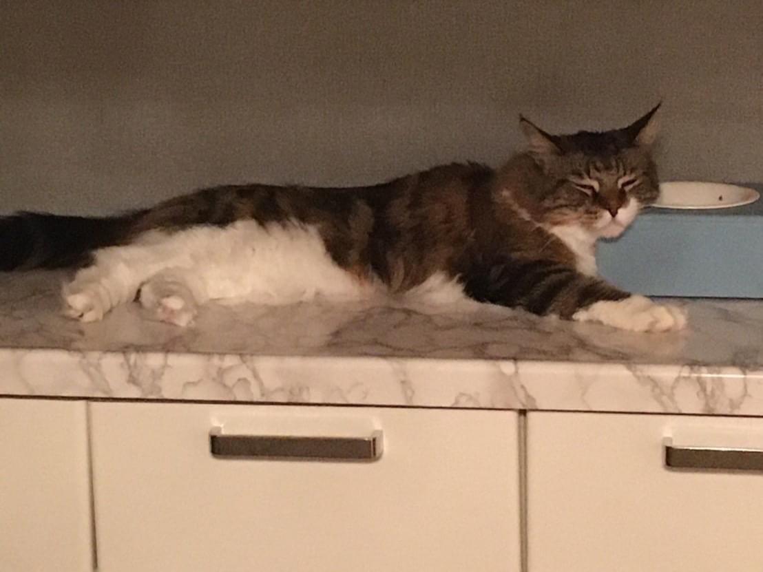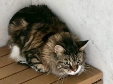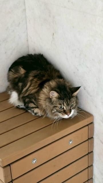 体長50cmほどの大きな猫です。体重5kg。長毛、首輪なし、人懐っこく穏やか。