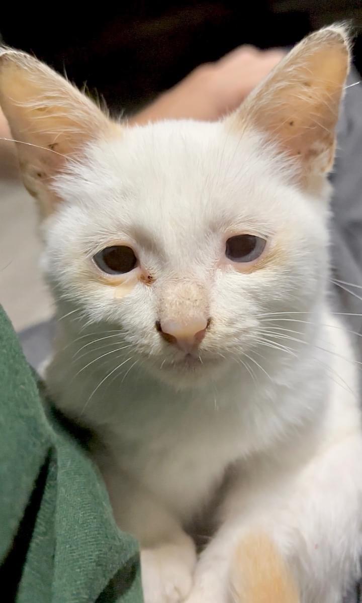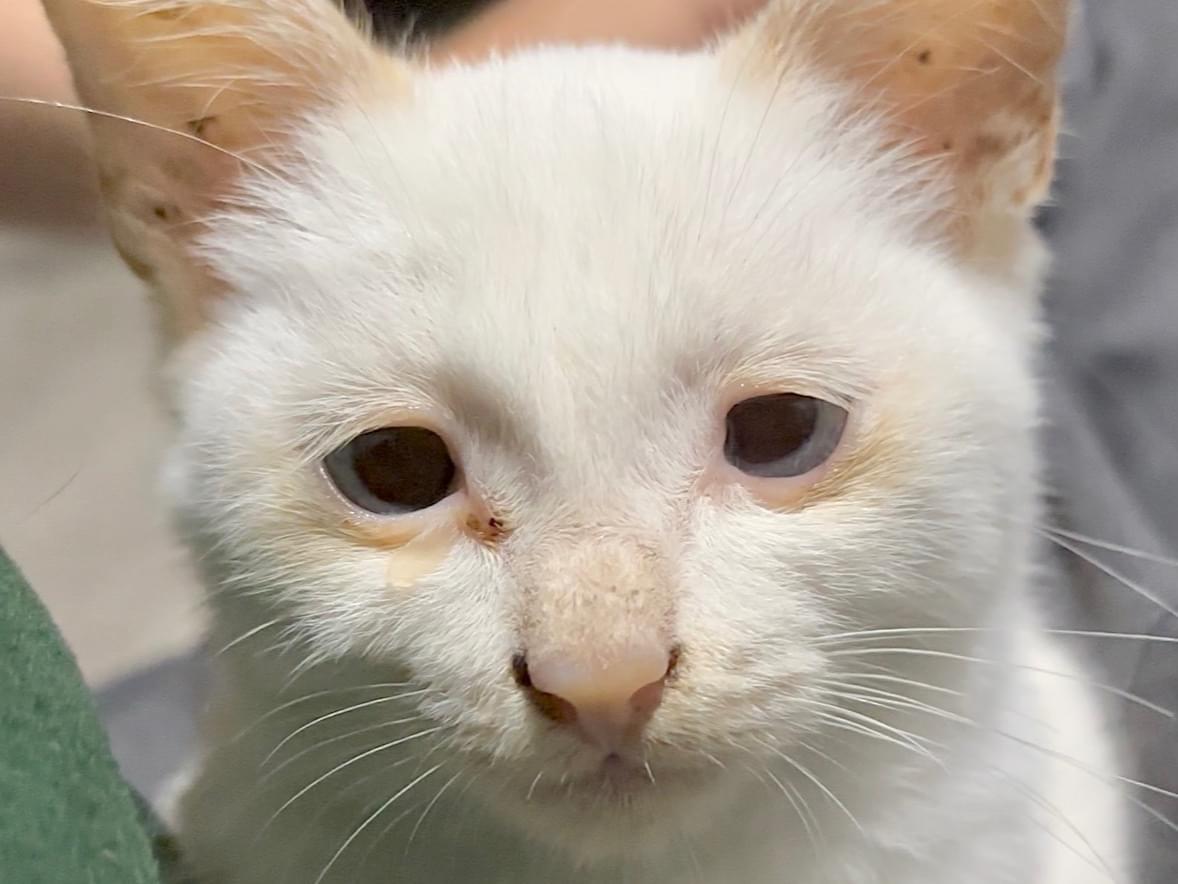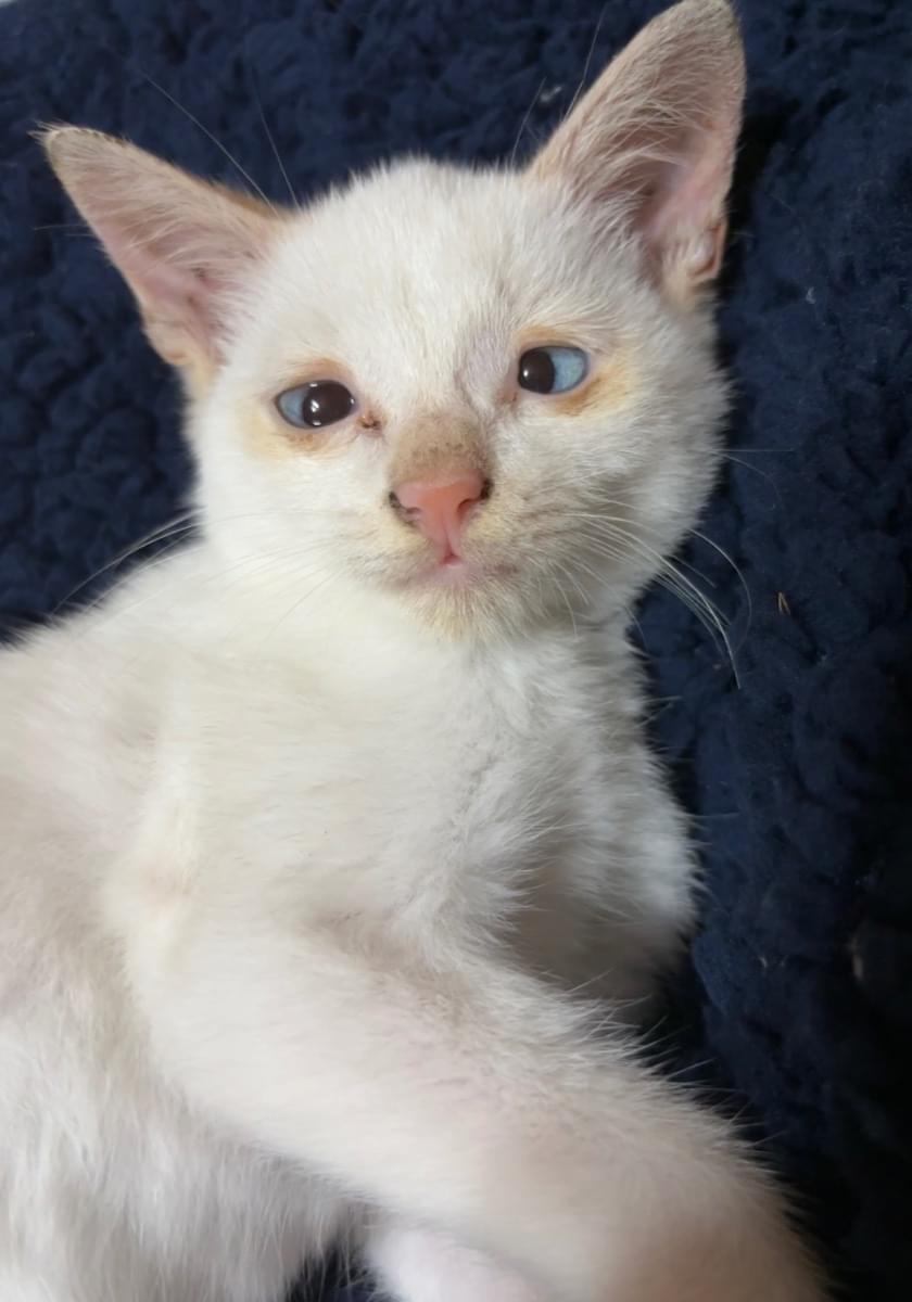 しっぽは、茶シマ。目が青くて若干斜視、眼振あります