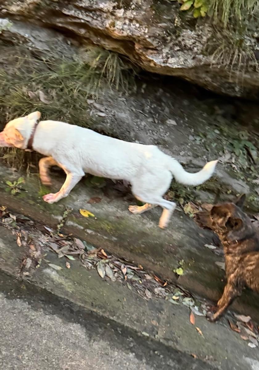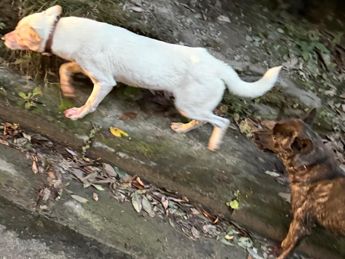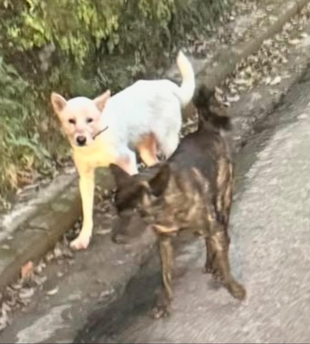 黒と白、首輪の付いた2匹の犬が目撃されています。
