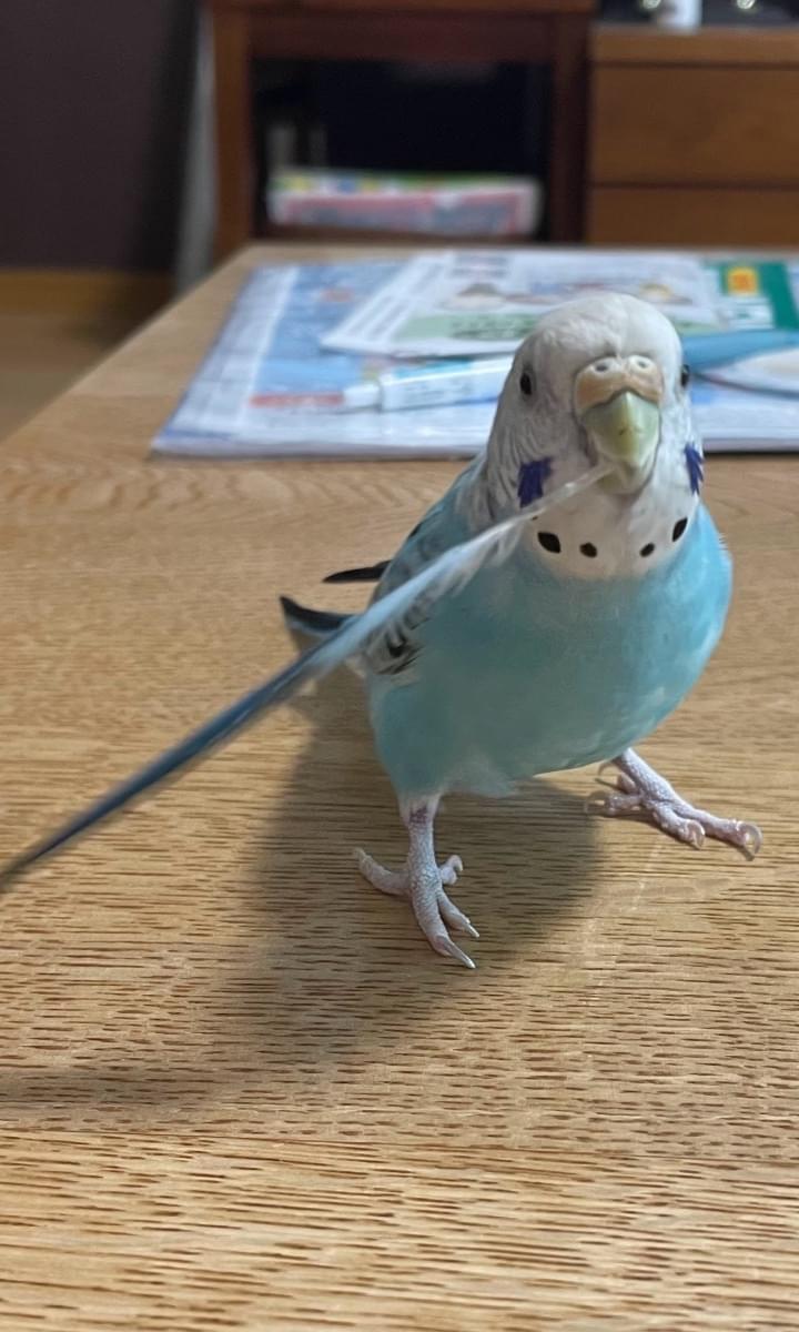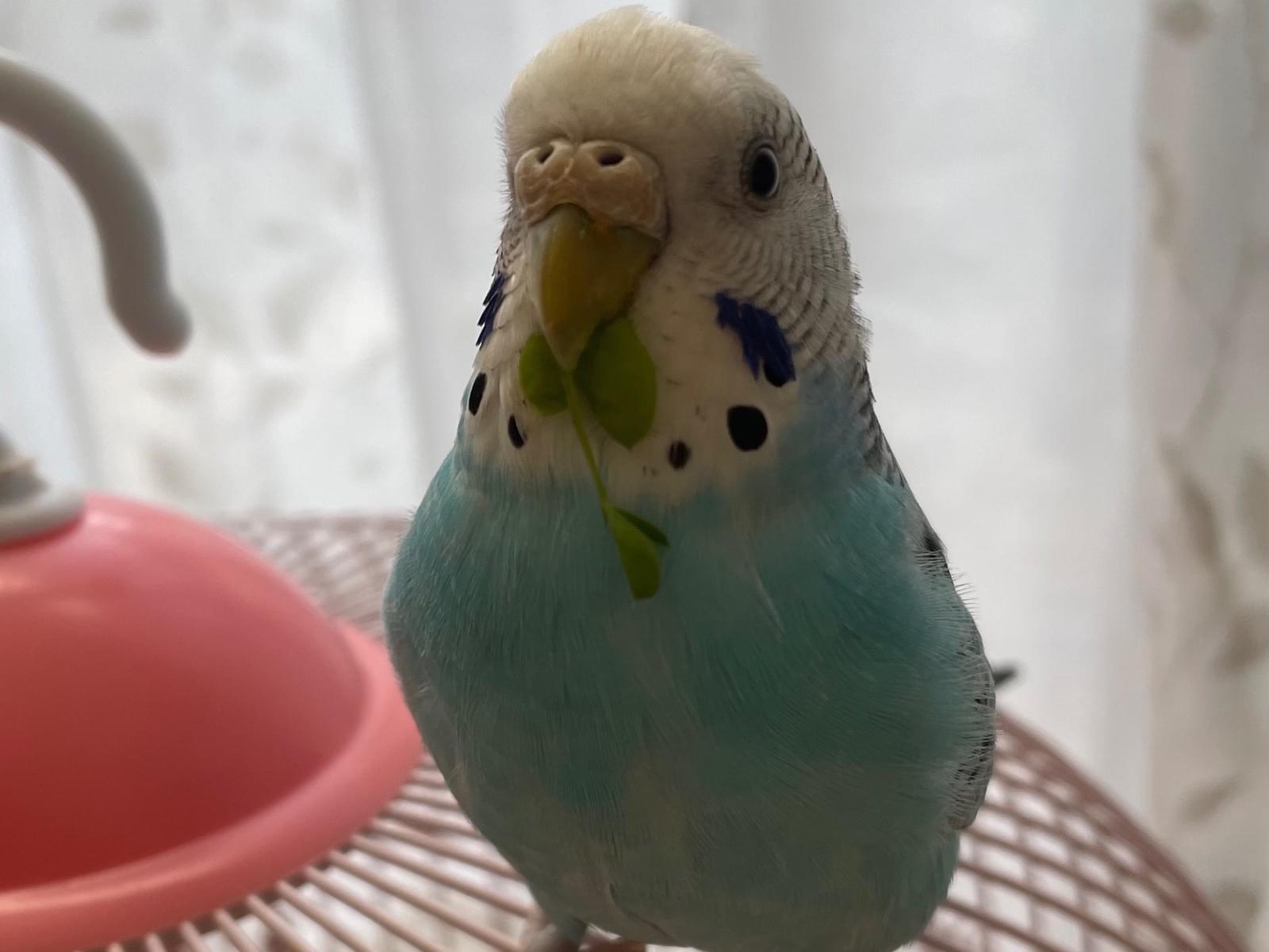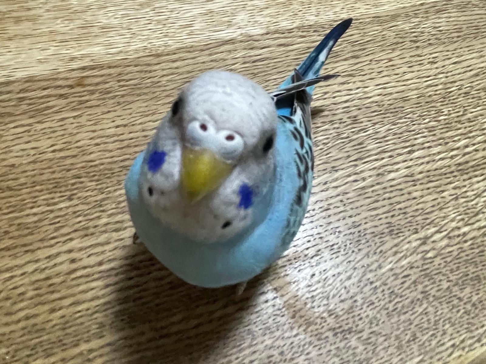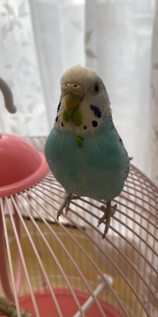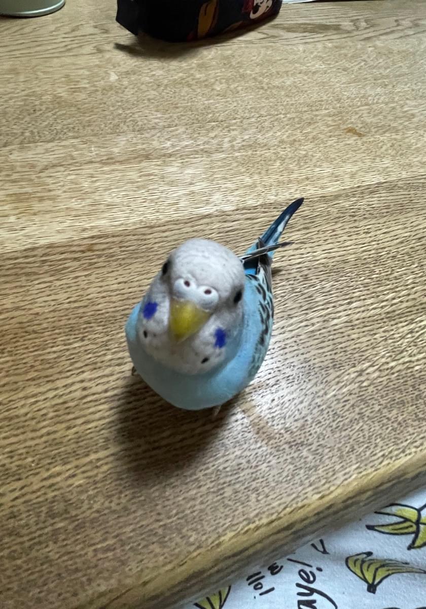 放鳥中に洗濯物を干していた際、外へ飛んでいってしまいました。手乗りで人懐っこいです。顎らへんに黒い丸が四つあります。