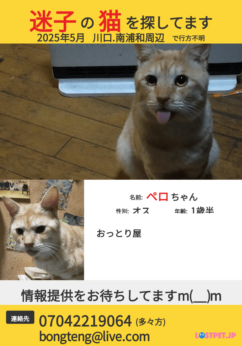 ホーム迷子猫埼玉県茶トラの猫を探ししい…茶トラの猫を探ししいます 管理編集するポスター掲載終了最終更新日時:2025/11/02 18:54写真情報用件迷子名前ペロ性別オス年齢2歳場所埼玉県 川口.南浦和周辺発生日時2025年11月2日(日)飼い主鈴木説明発生は5月下旬です 宜しくお願いします 家出.ベロ出しします連絡先URLrazan0111@msn.com掲示板情報交換のための掲示板です。ユーザーからの情報提供、オーナーからの連絡などにご利用下さいませ。書き込んだ情報は、オーナーのメールに通知されます。まだコメントはありません。トピックを作成する
