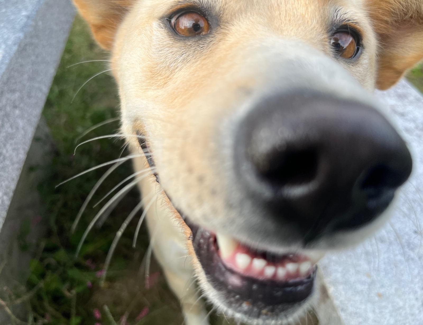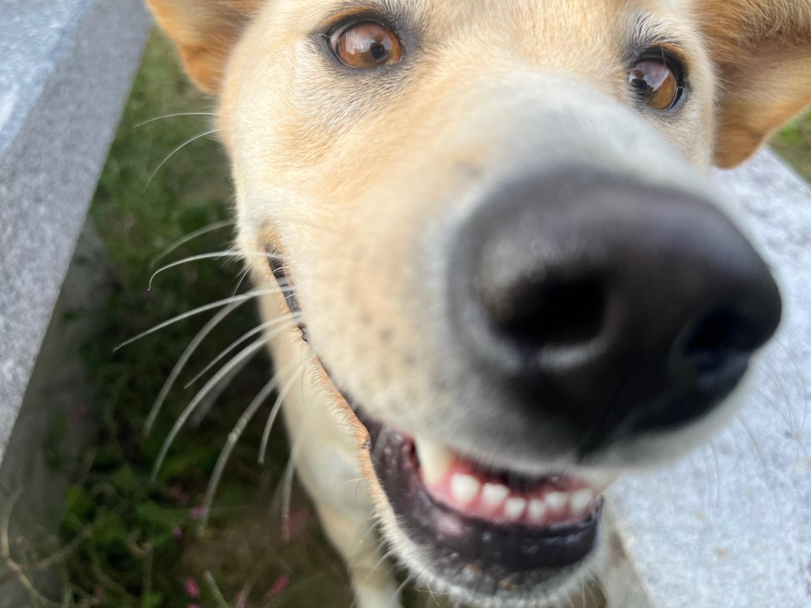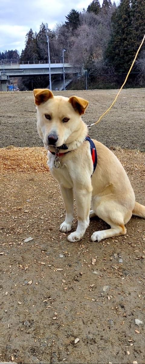 両耳が茶色で、体はベージュです。人が好きで、すぐ飛び掛かります。だけど、噛まないし、吠えないです