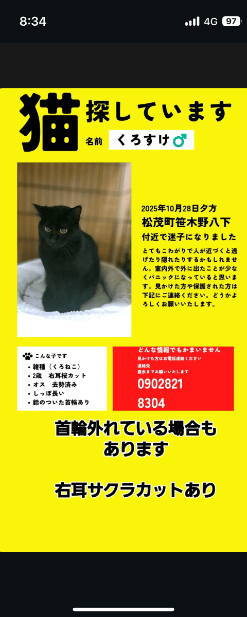 ホーム迷子猫徳島県先週から行方不明です…先週から行方不明です。まっくろのオス、耳にはサクラカットあり。管理編集するポスター掲載終了最終更新日時:2025/11/04 13:41写真情報用件迷子名前くろすけ性別オス年齢2歳場所徳島県 板野郡松茂町笹木野発生日時2025年10月28日(火)飼い主豊永説明2階のベランダから脱走しました。 脱走した時には鈴付きの首輪してましたが取れている可能性あり。 怖がりですが、慣れれば甘えん坊です。連絡先URL未設定掲示板情報交換のための掲示板です。ユーザーからの情報提供、オーナーからの連絡などにご利用下さいませ。まだコメントはありません。トピックを作成する